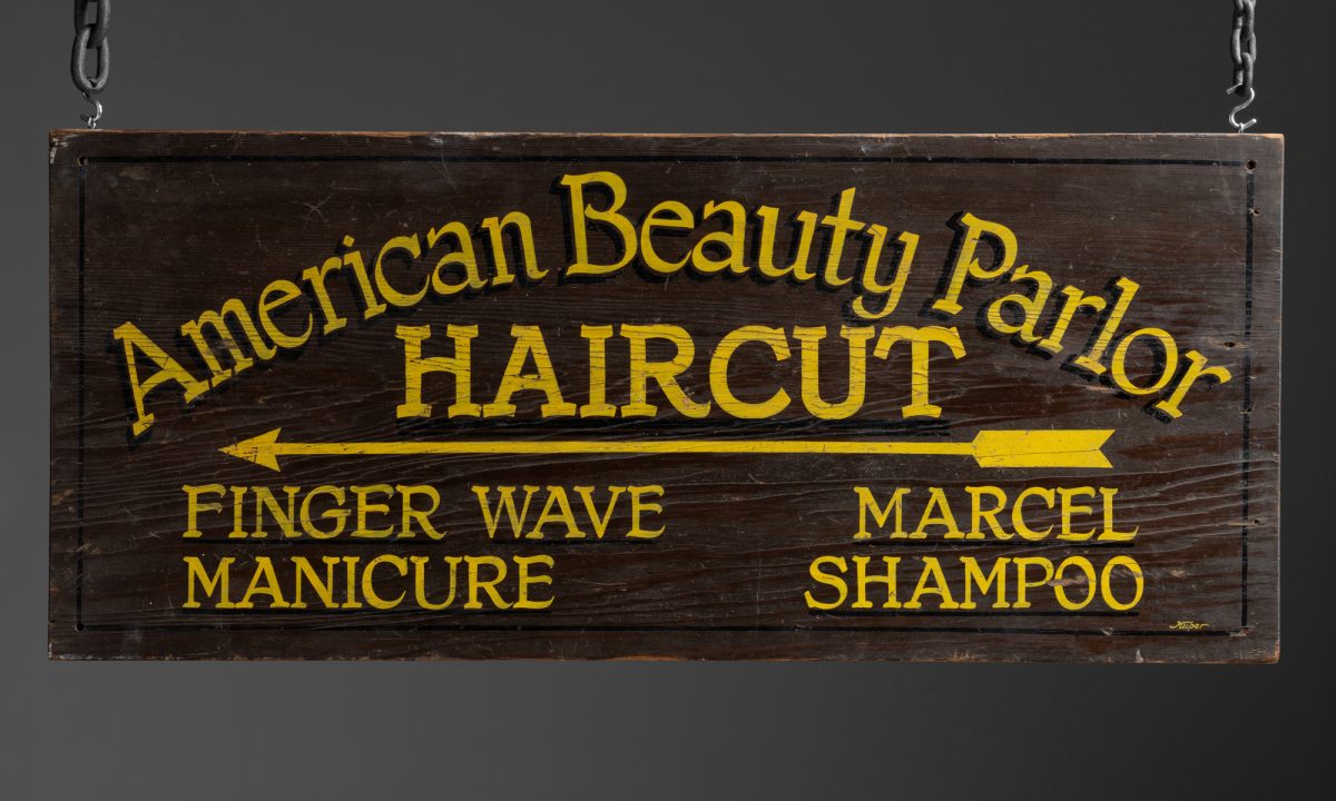 Double sided hand painted wooden sign from a beauty parlor.