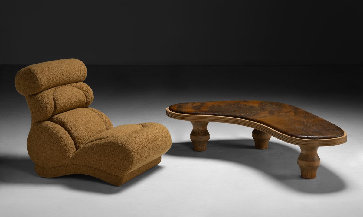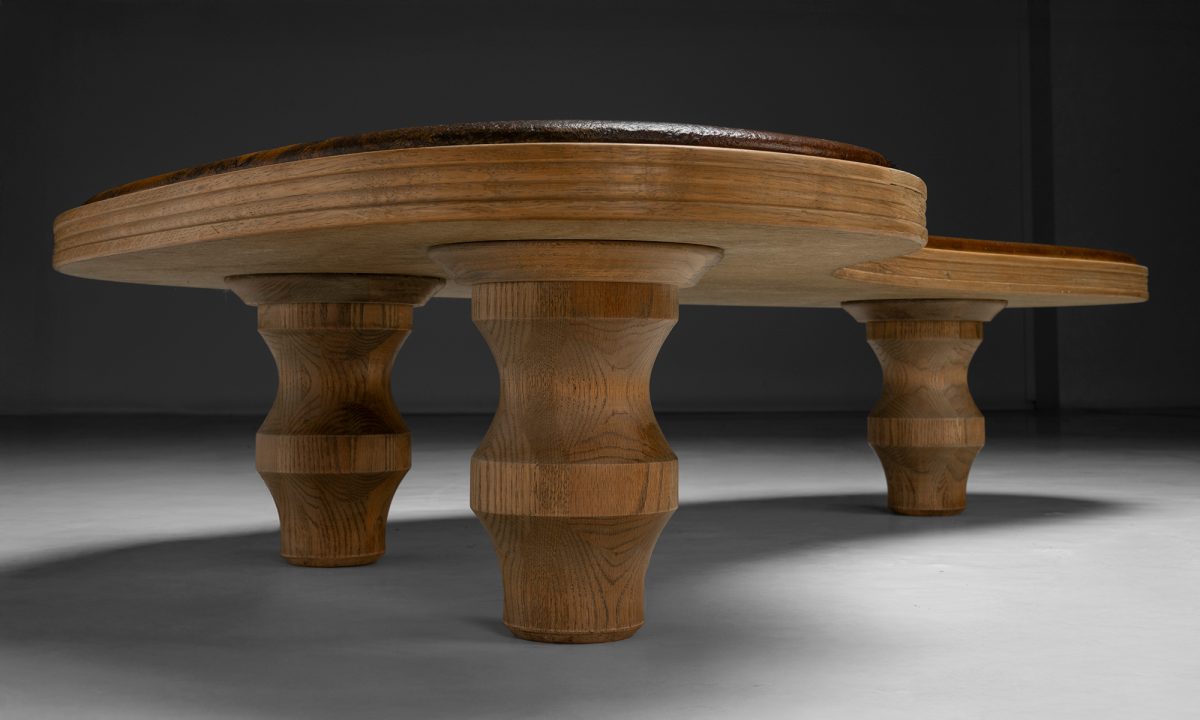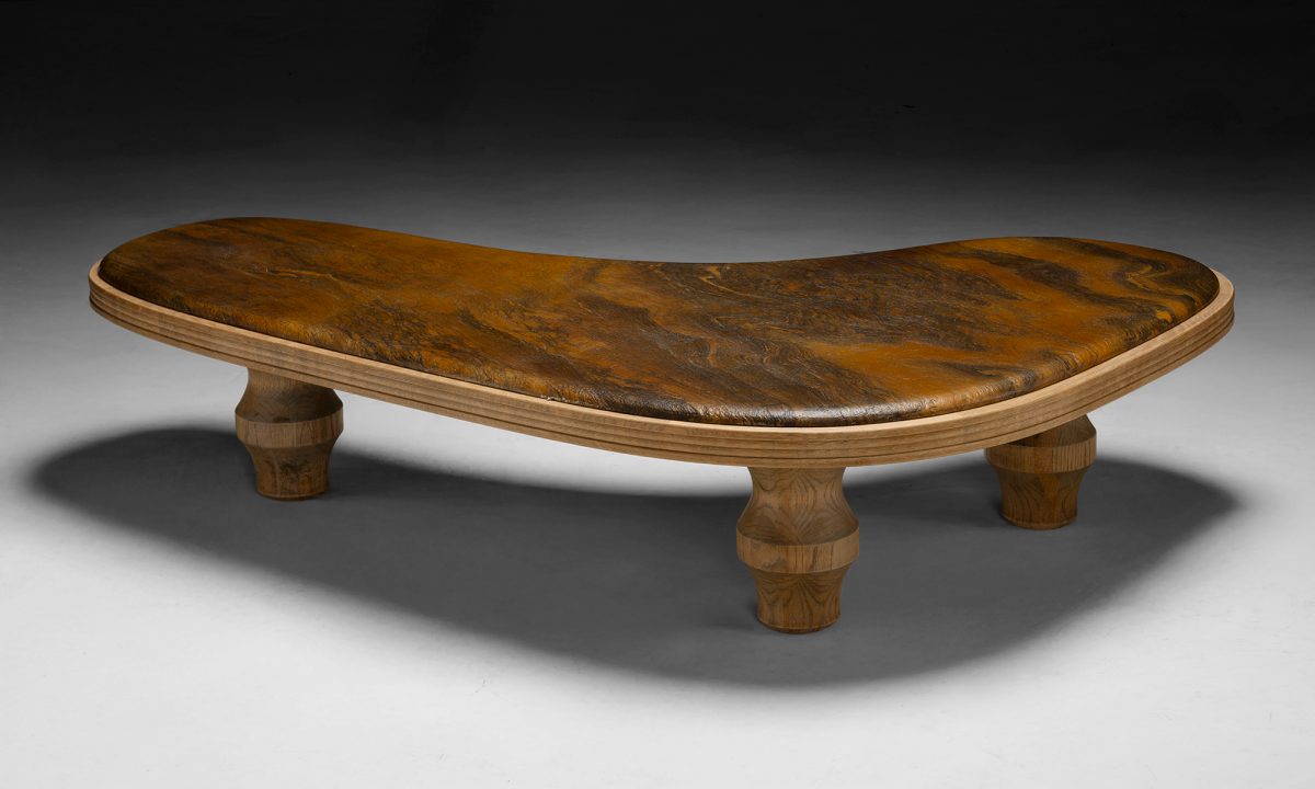 Boomerang shape stone top on inset reeded base, by Form Libre.
