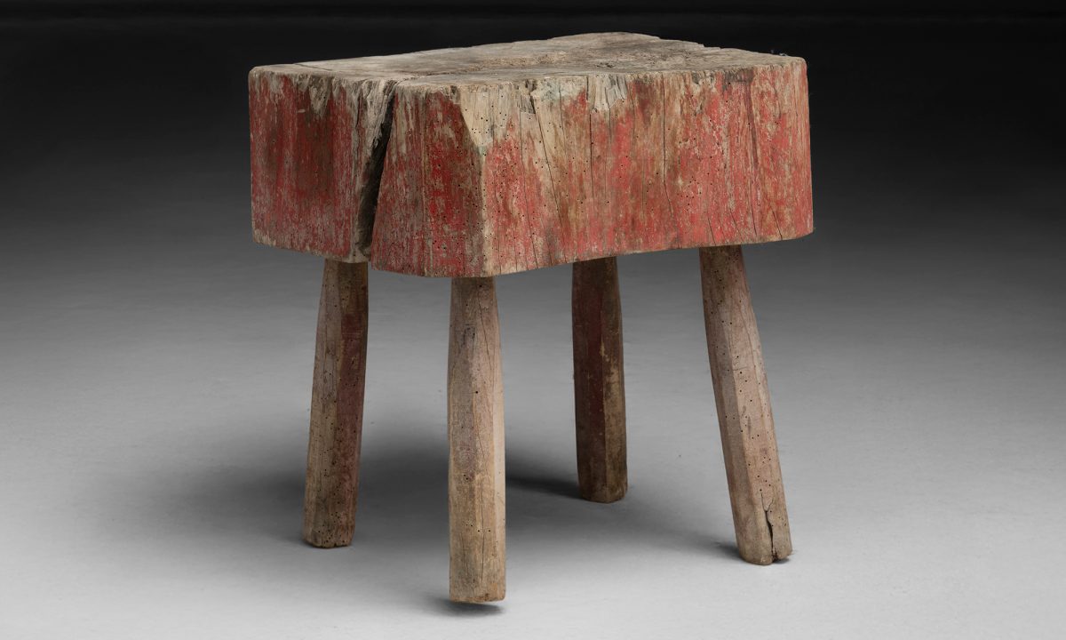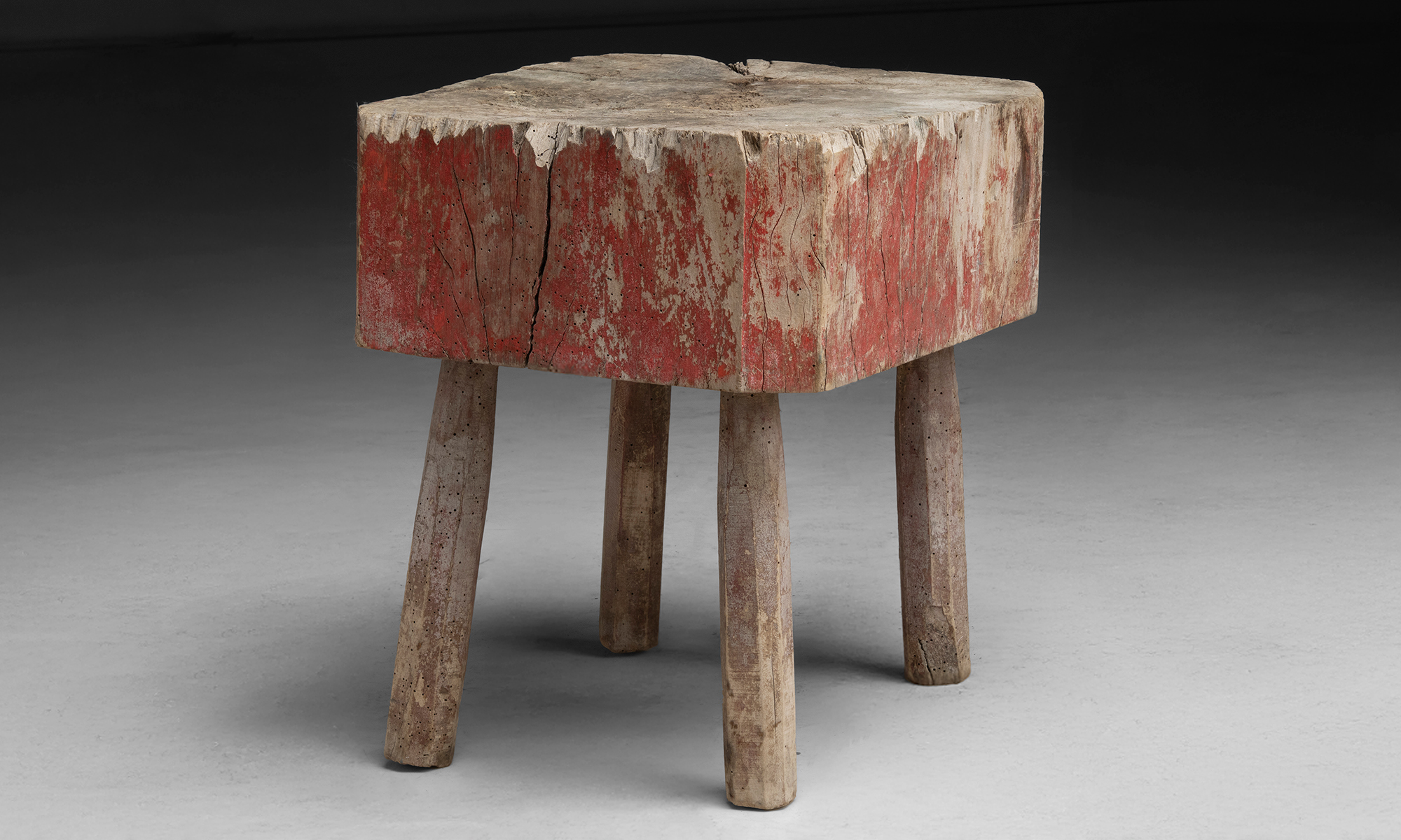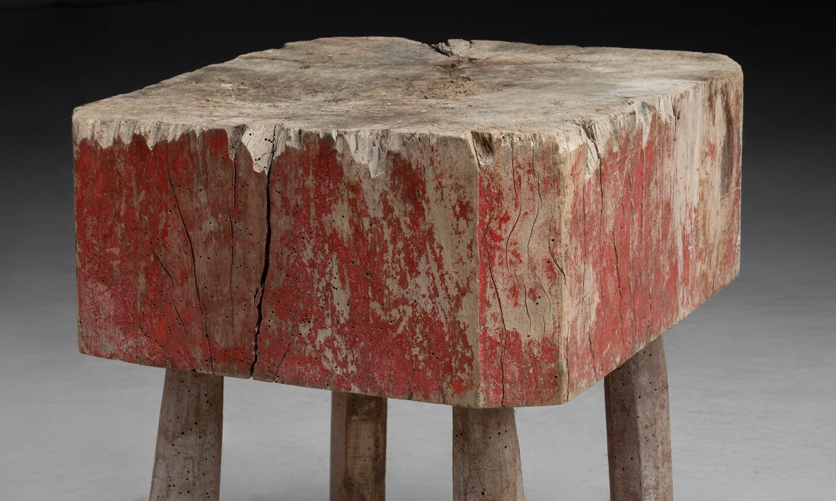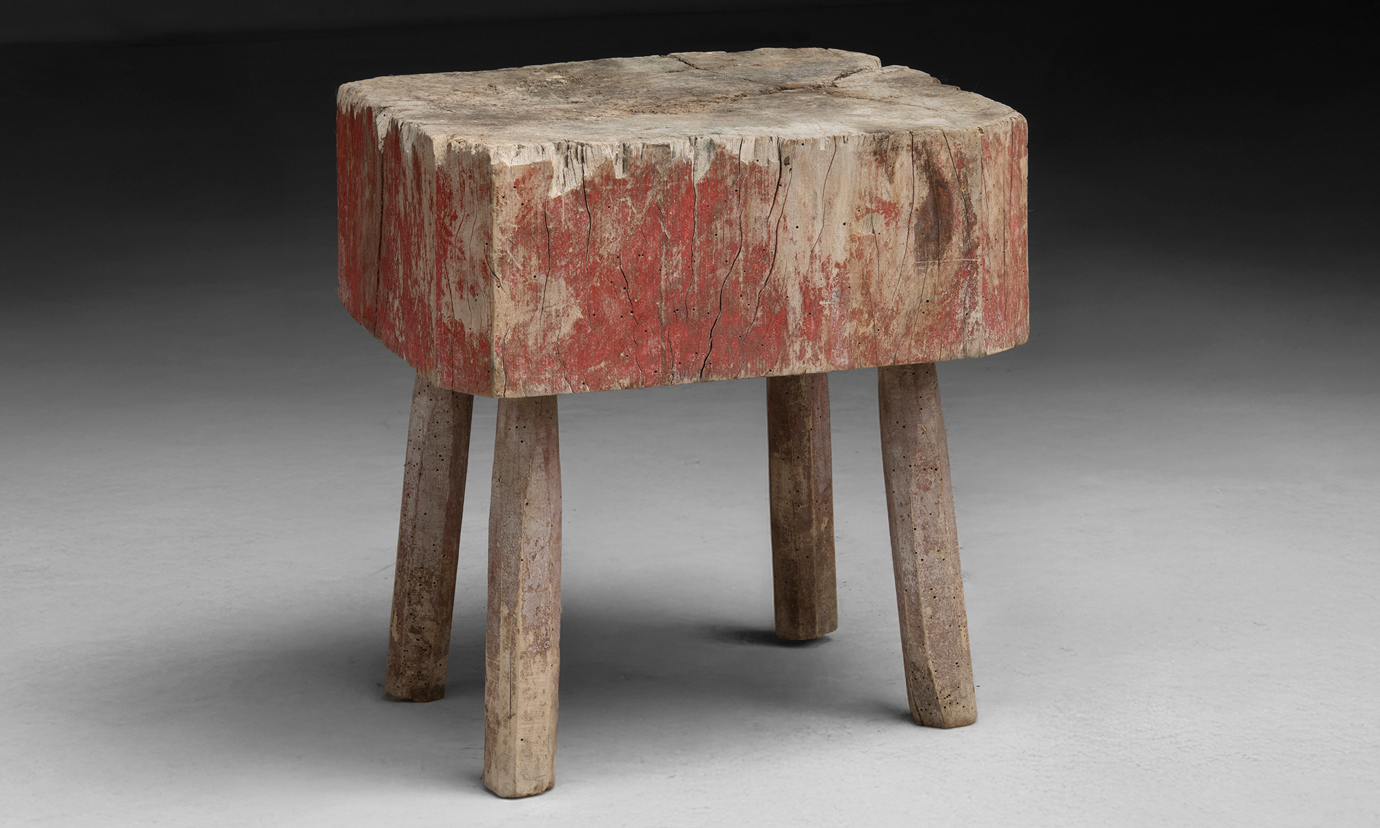 Chopping block with a thick, irregular slab top and remnants of old red paint. Set on four simple legs.