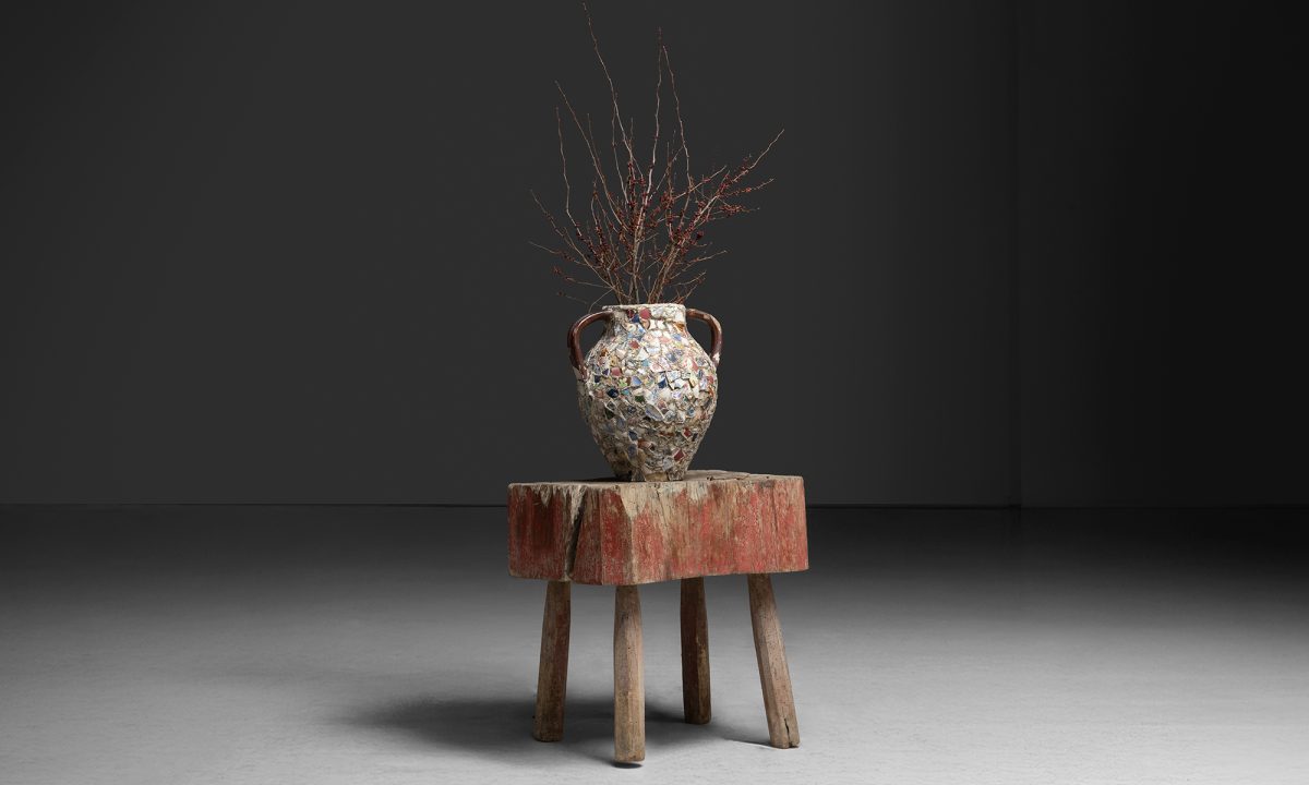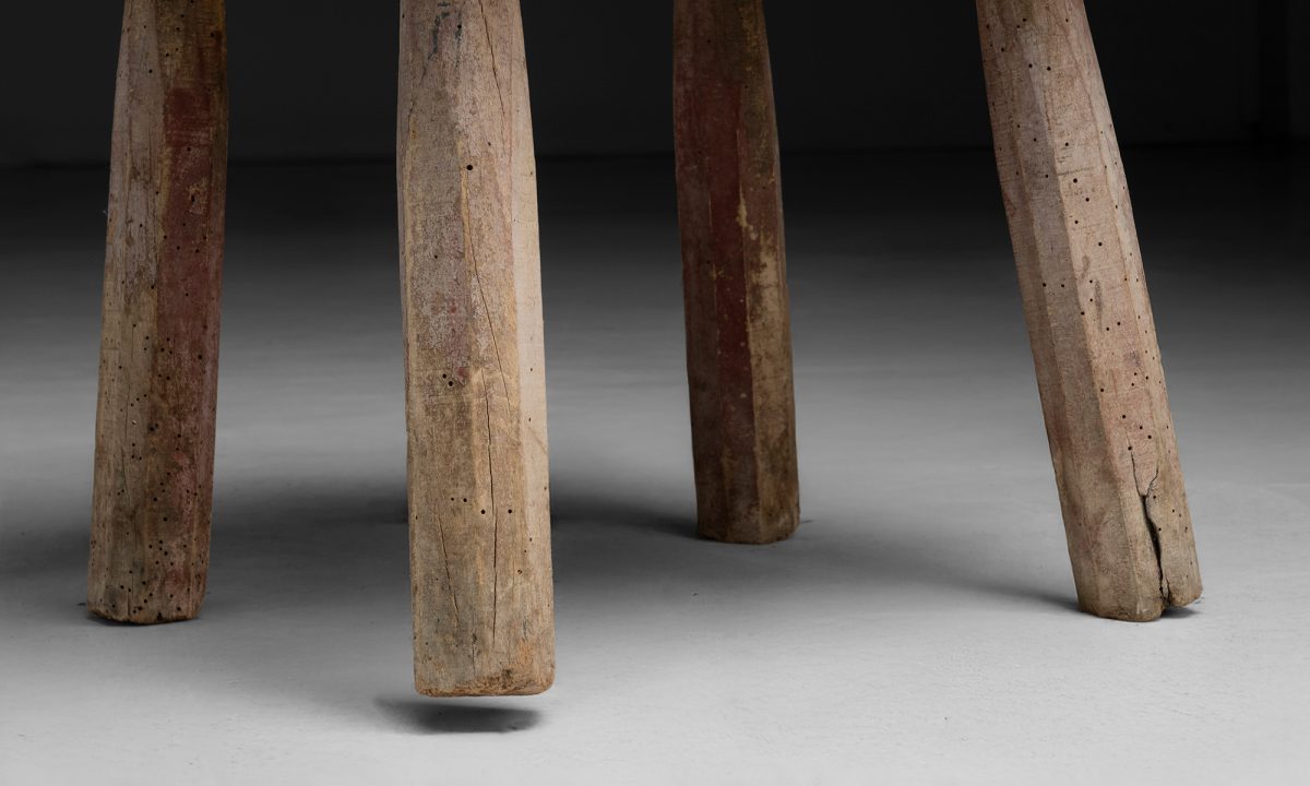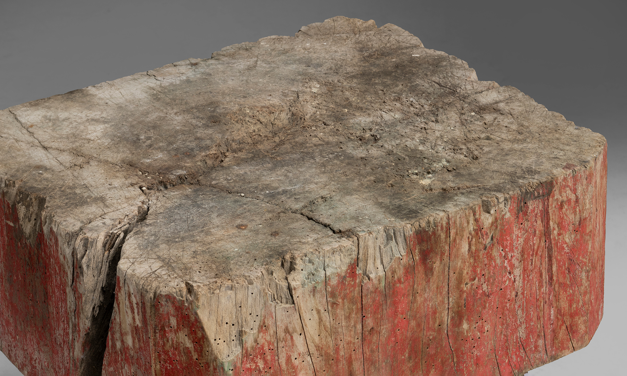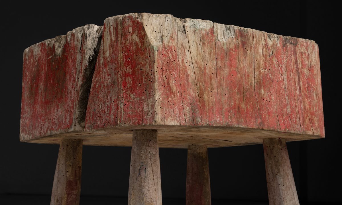 Chopping block with a thick, irregular slab top and remnants of old red paint. Set on four simple legs.