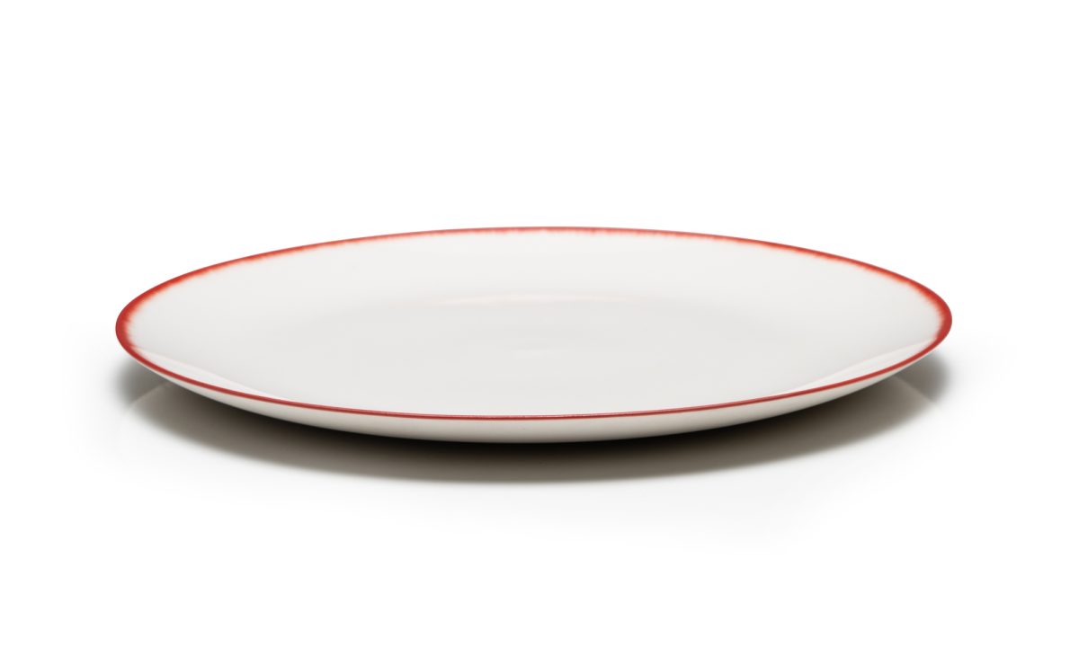 Off White Porcelain Glazed Dinner Plate Designed by Ann Demeulemeester. Red Shadow painting on border.