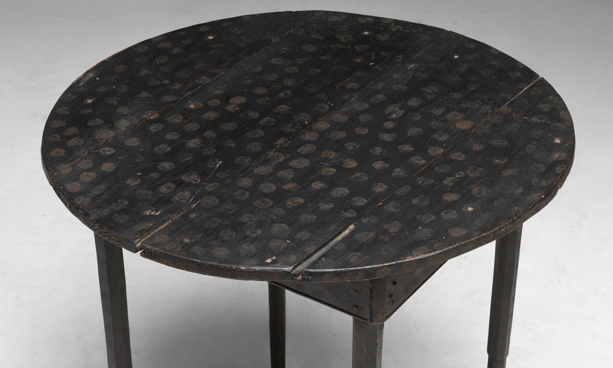 Pine side table with fine turned and chamfered legs and paint-decorated dots over the surface.