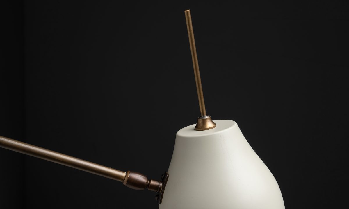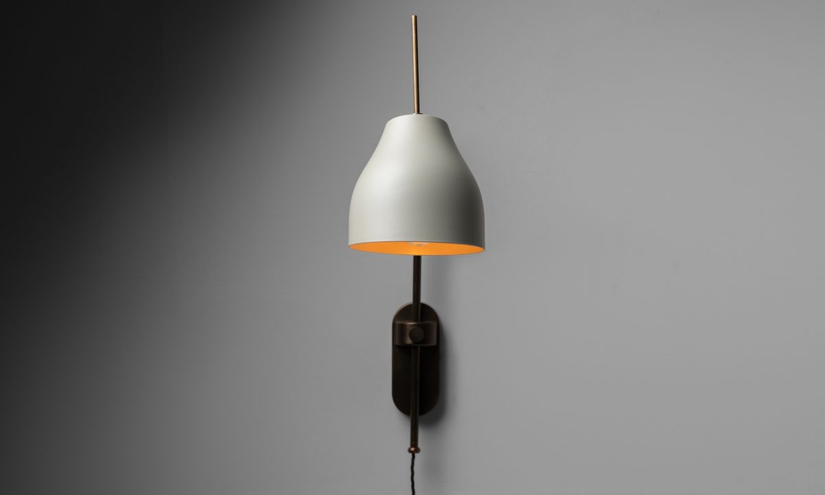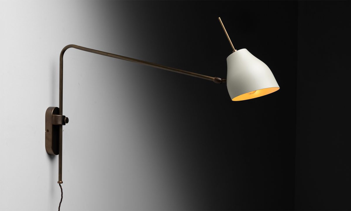 Adjustable modern sconce with pivoting cream enamel shade.