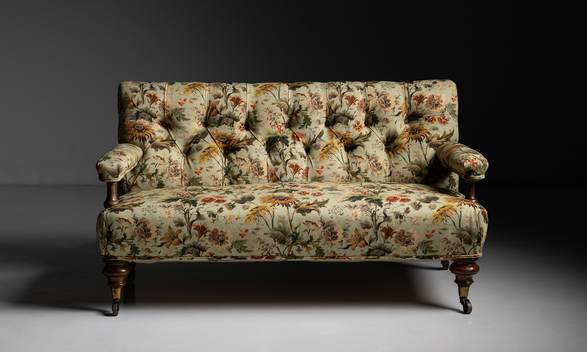Open arm button back sofa recently upholstered in floral linen and cotton blend by House of Hackney