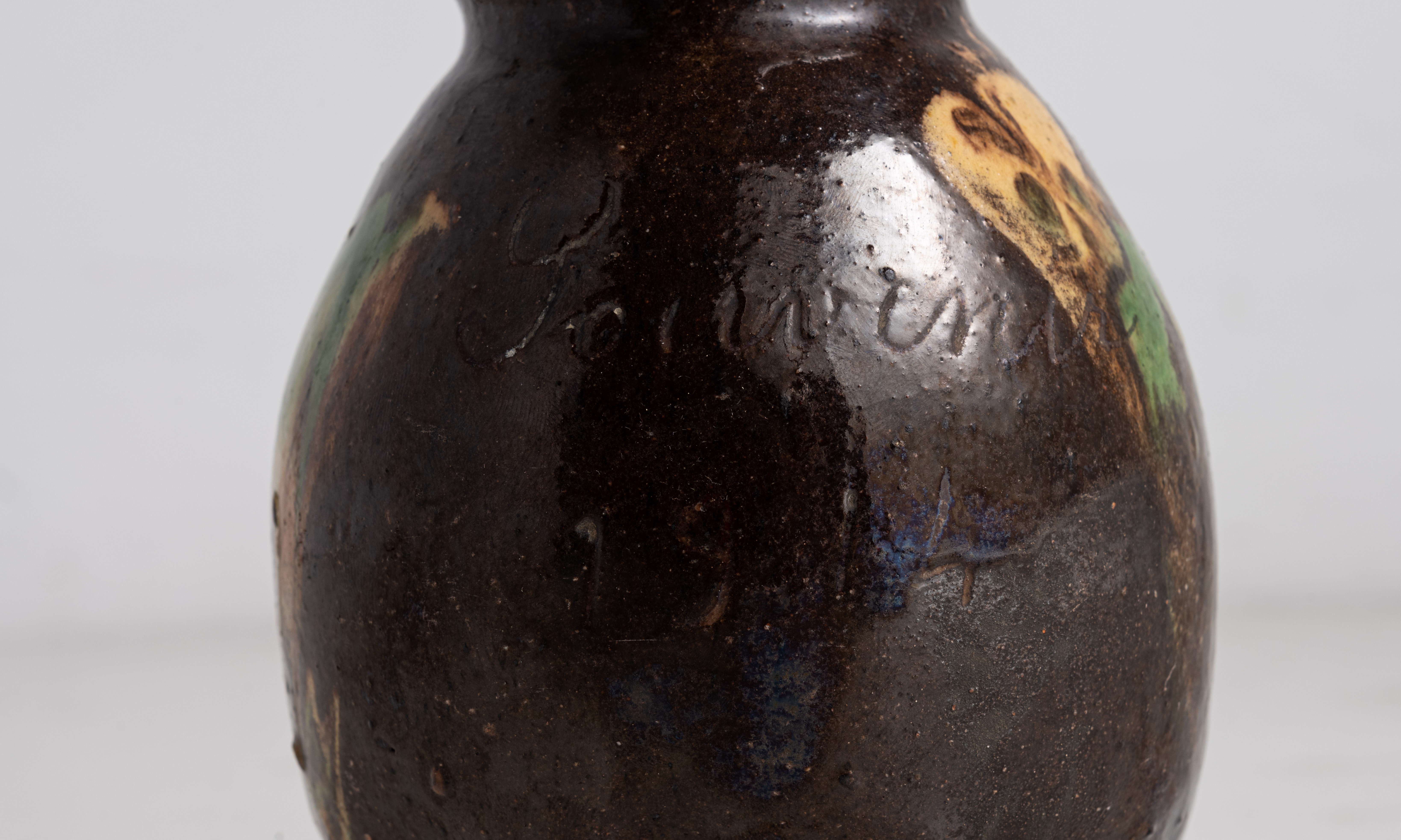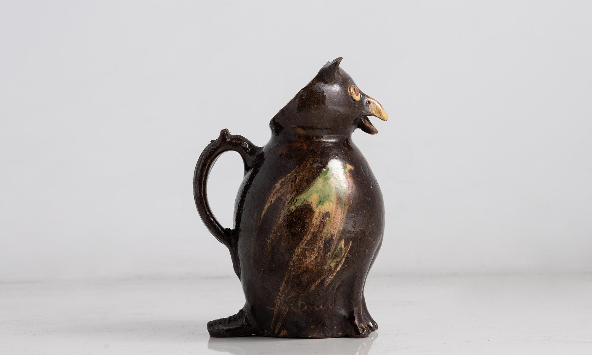 Glazed slipware jug in the form of an owl, signed and dated 1914