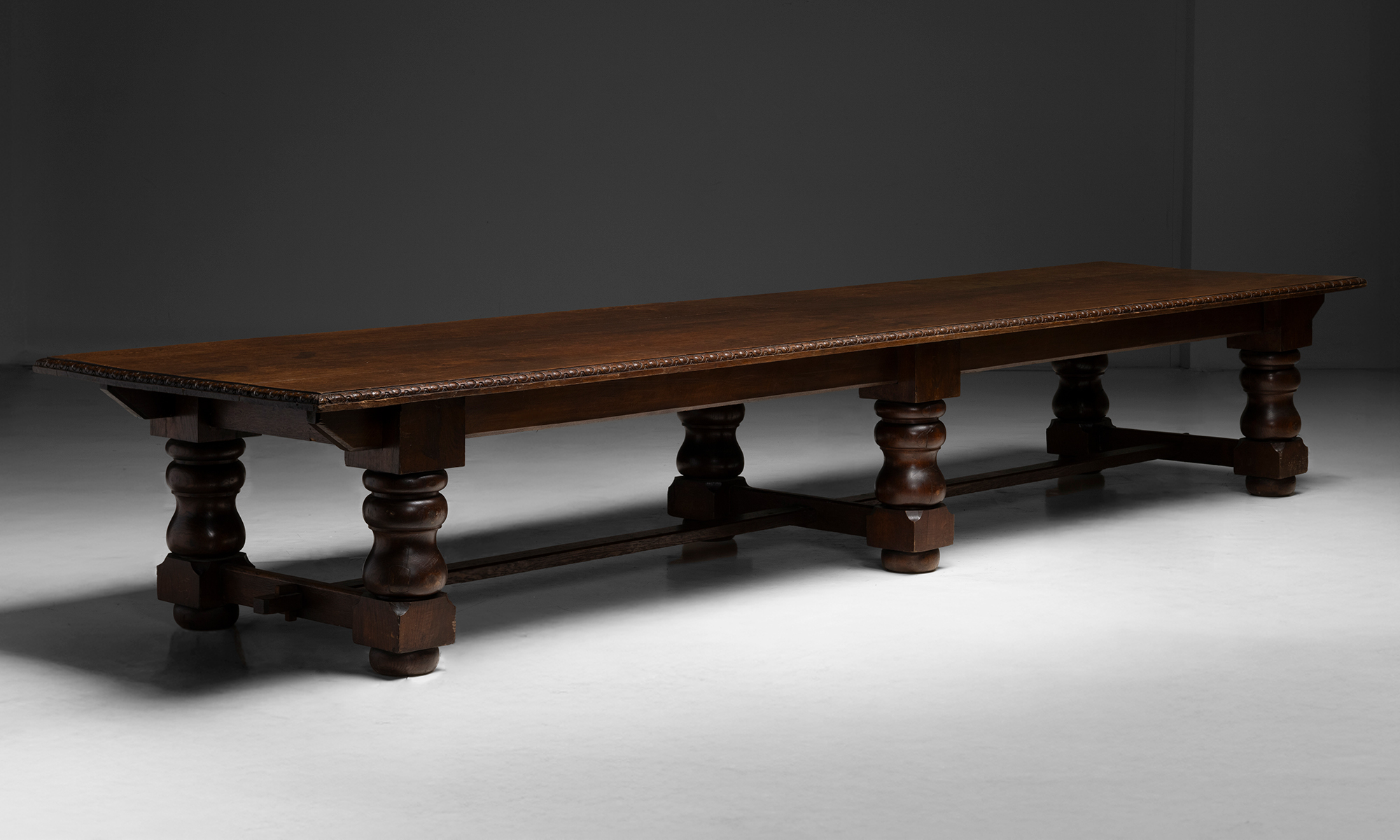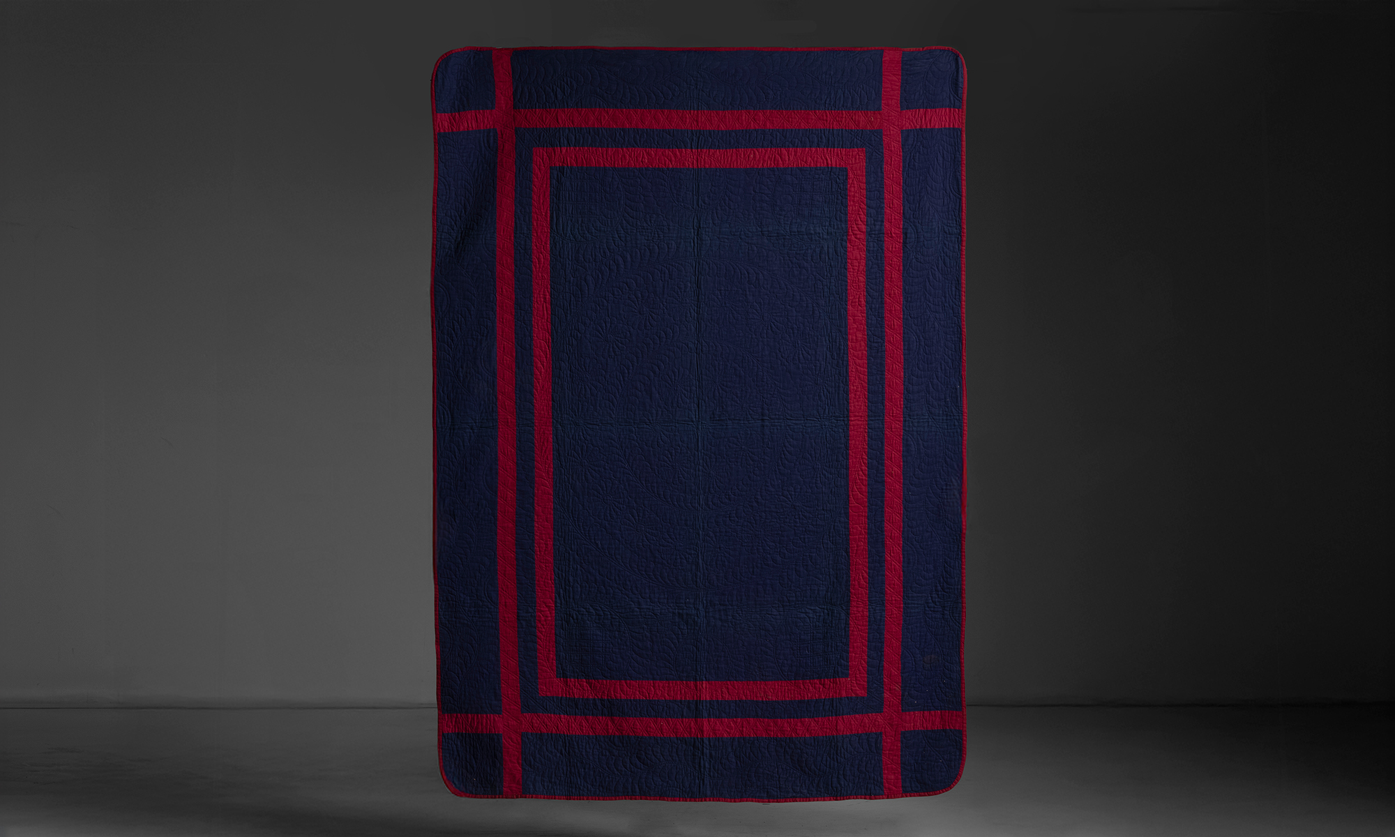 100% Cotton. Both feature a "plain" field with red double inner border. One light blue, One dark blue. Long rectangular top with carved edge detailing, supported by bold baluster-turned legs and stretcher base.