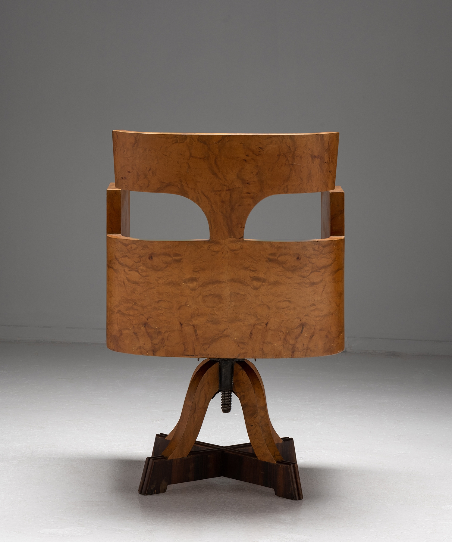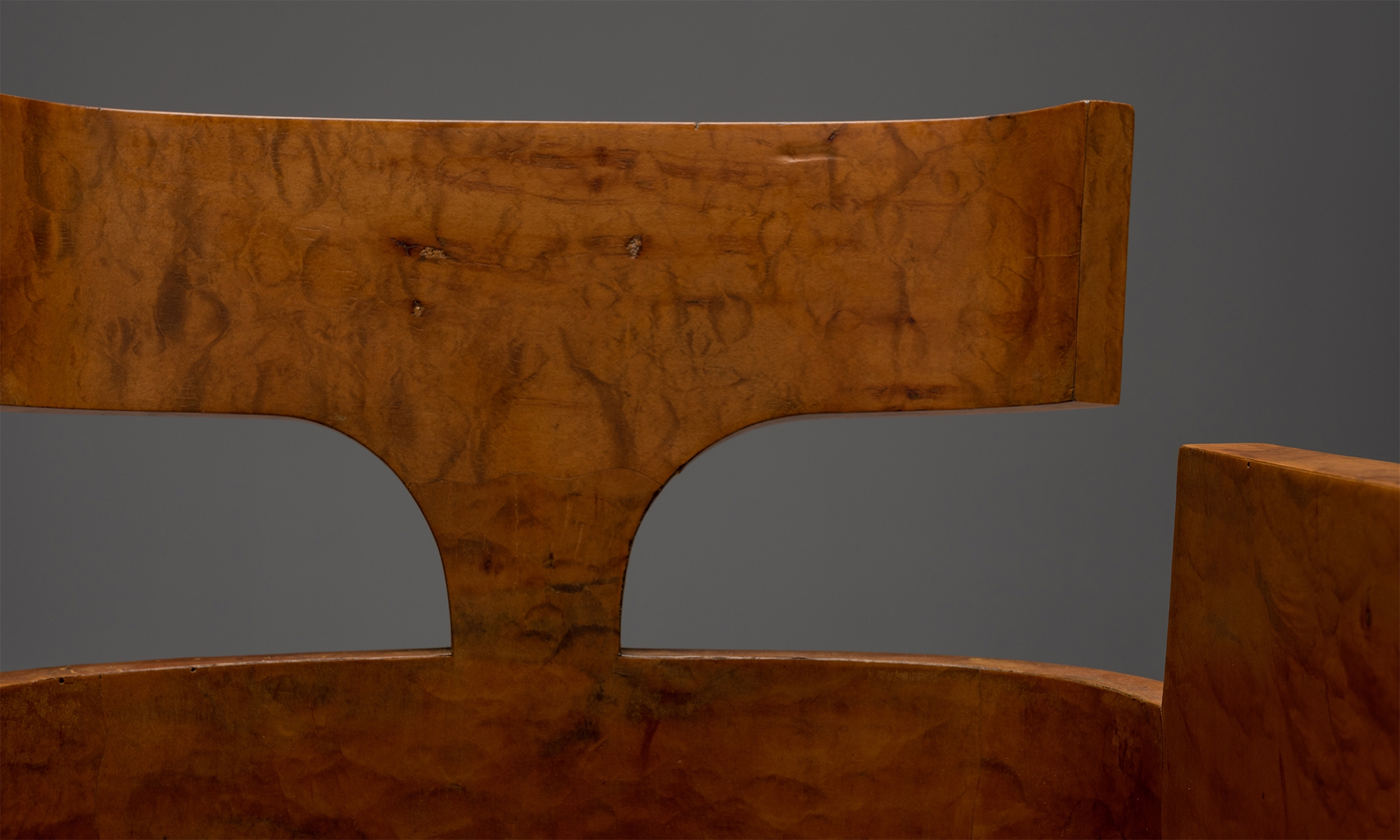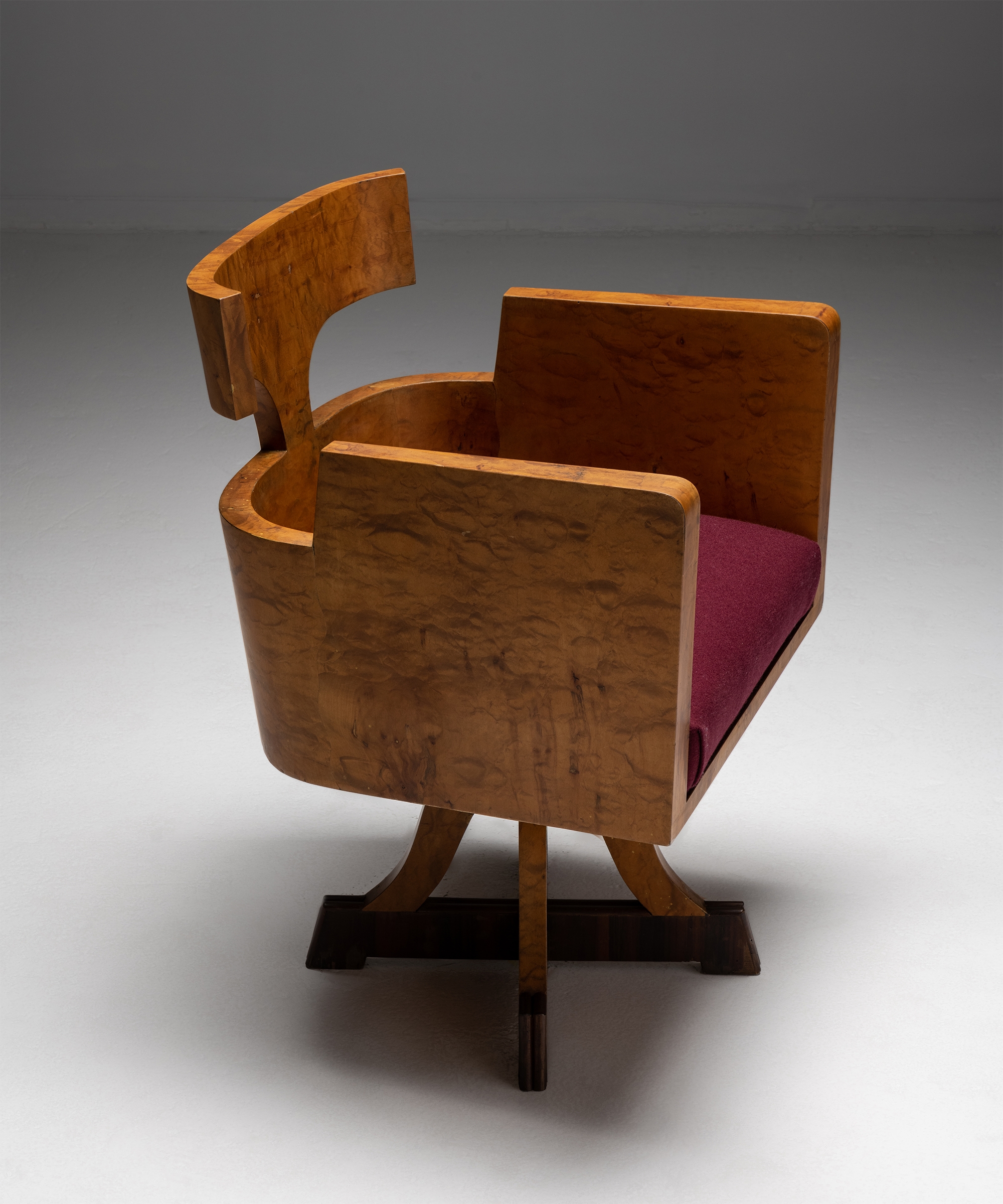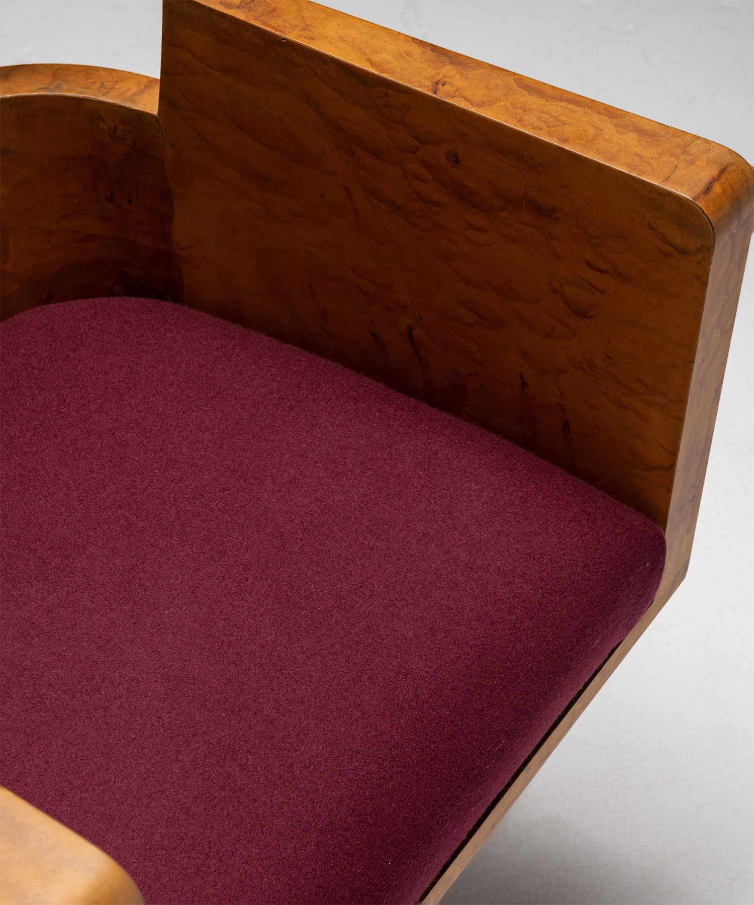 Beautifully made chair in wood, with walnut veneer and deep red upholstered seat.