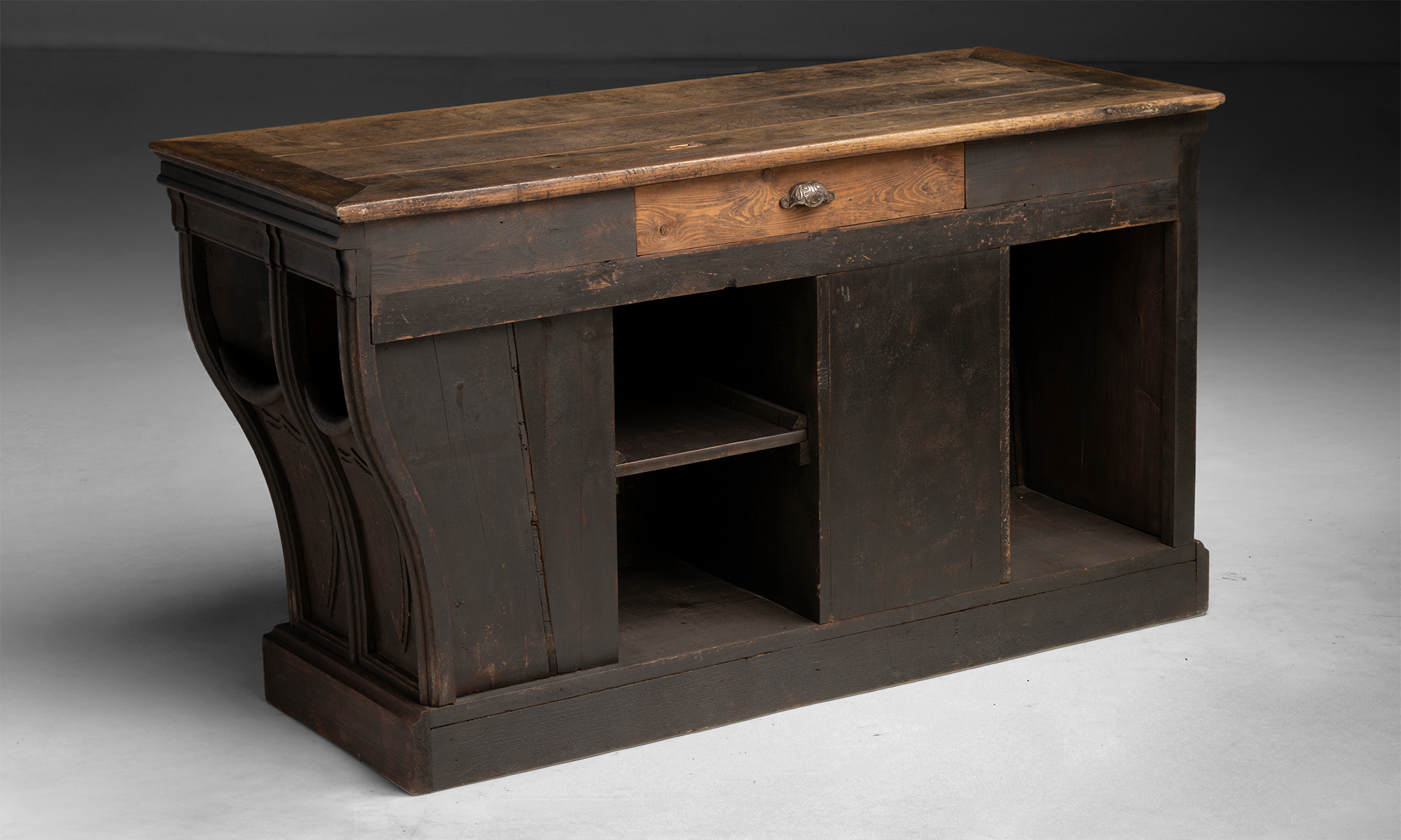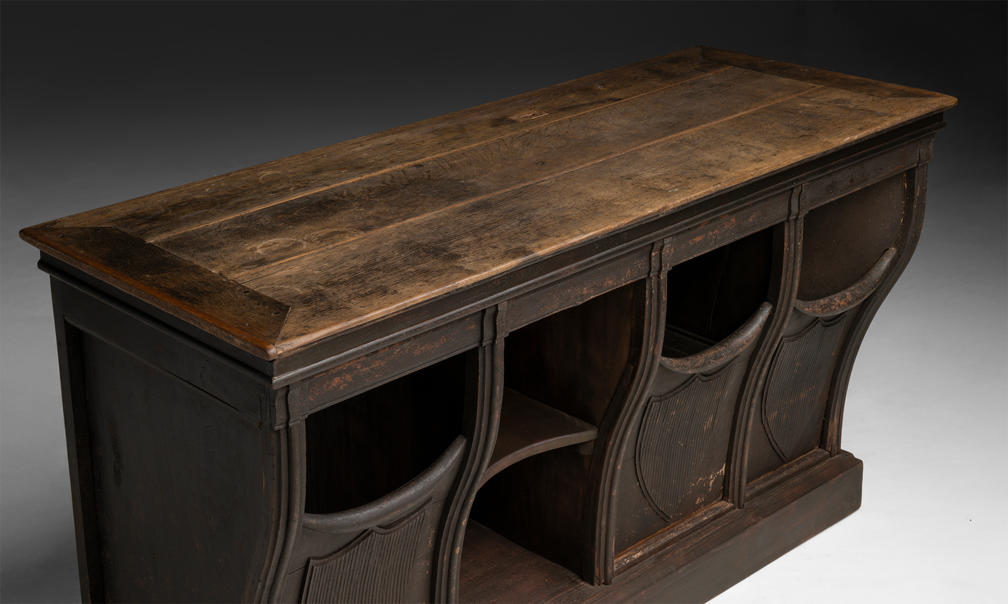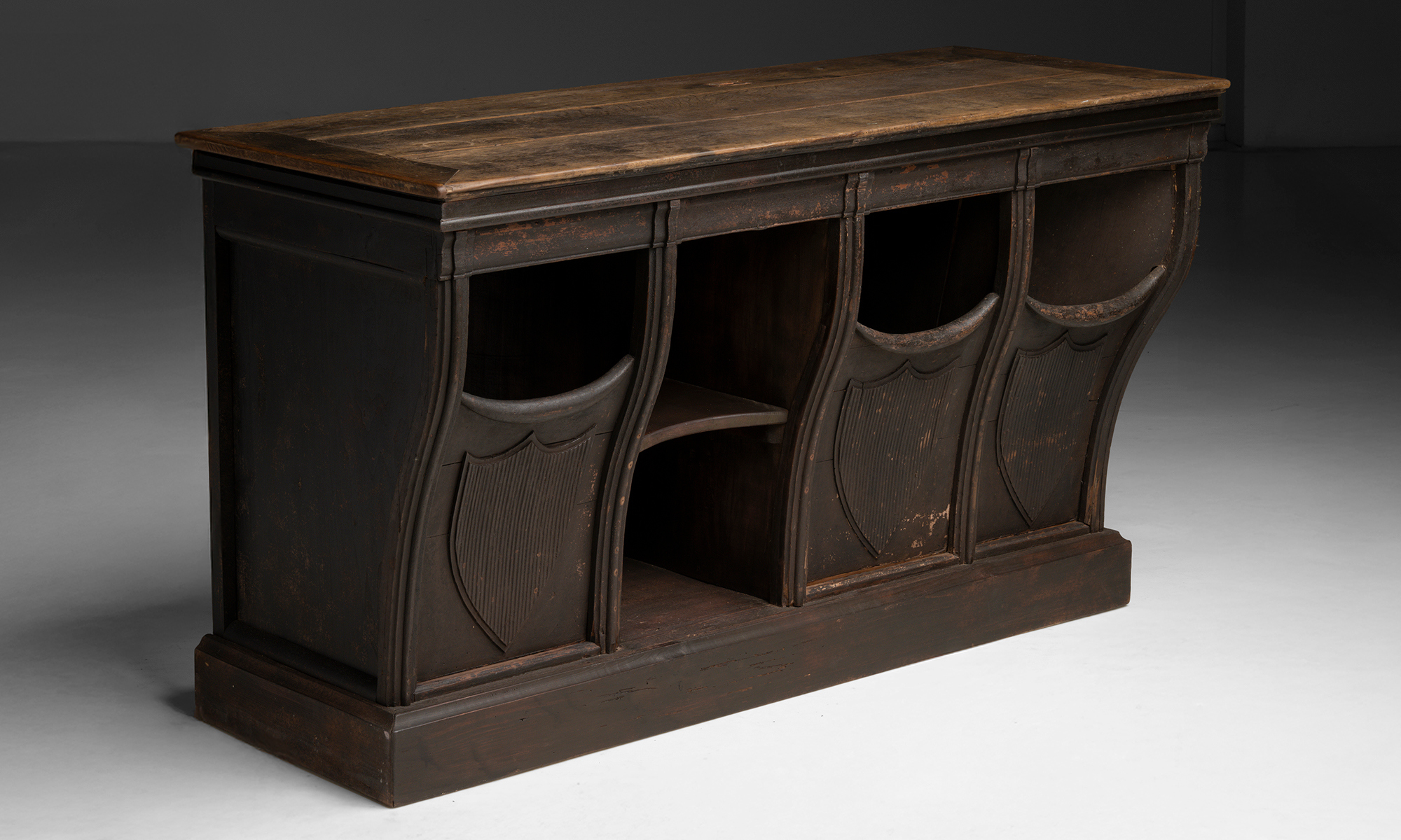 Painted pine base with a worn hardwood top. Features three arched front bins with shield-form panels and open storage behind. A practical general-store counter with original surface and coin slot.