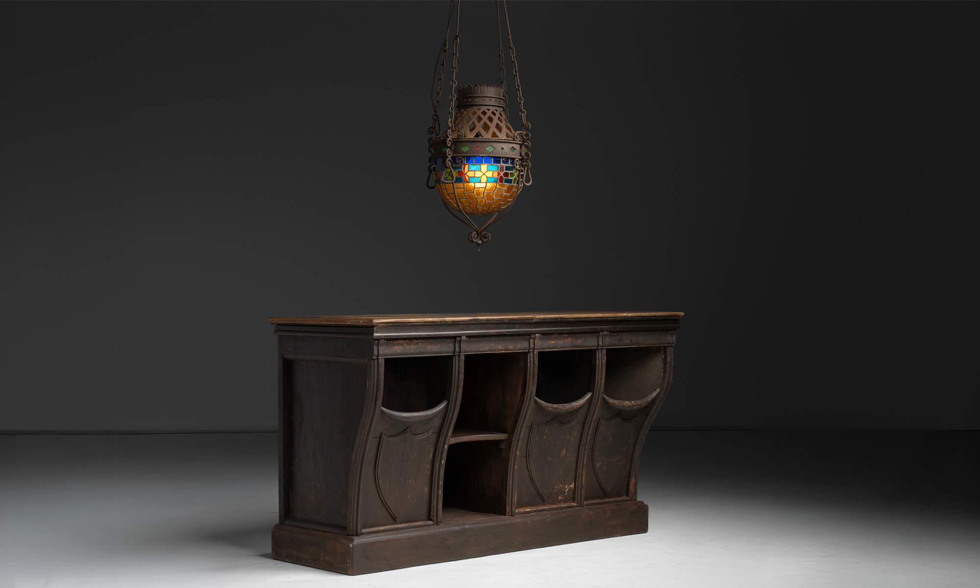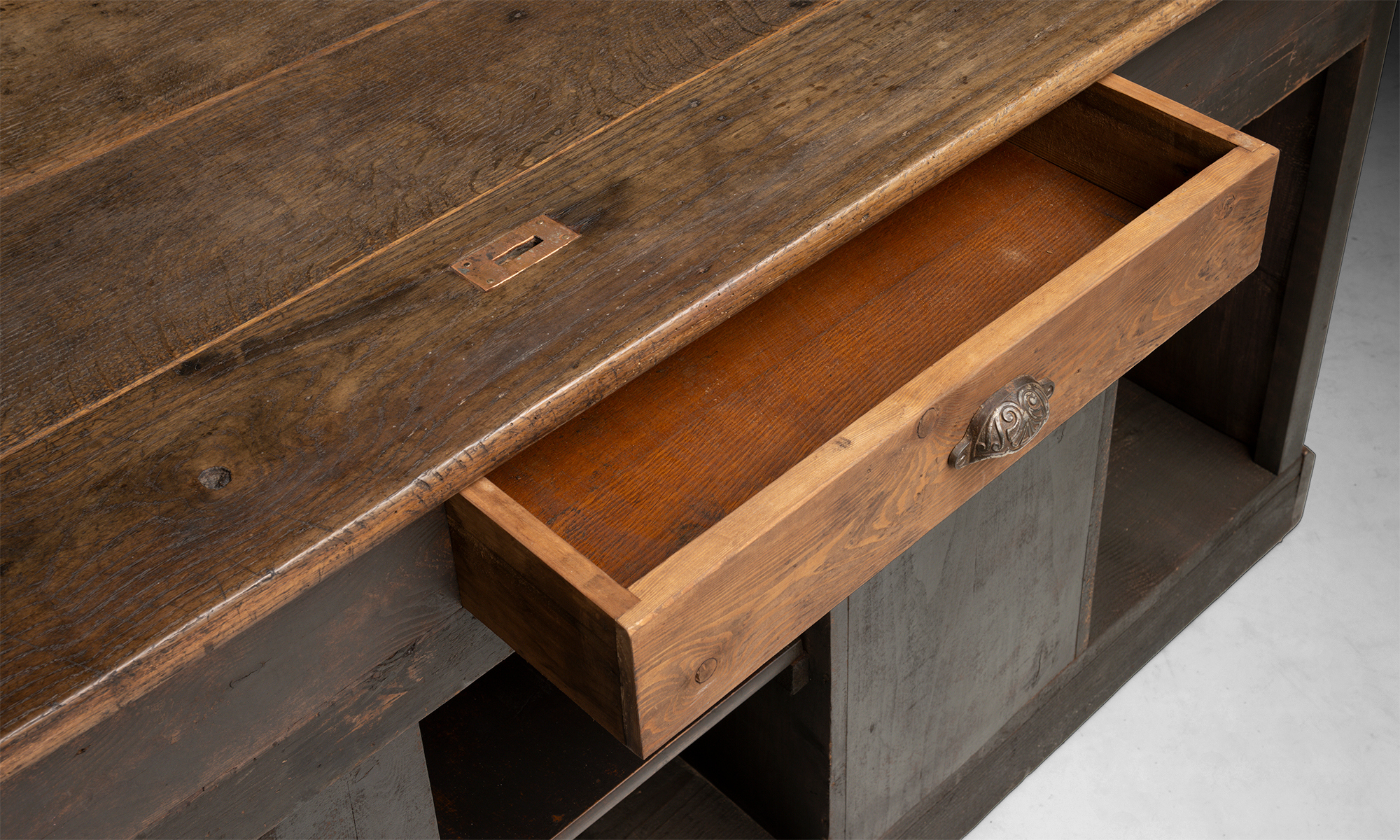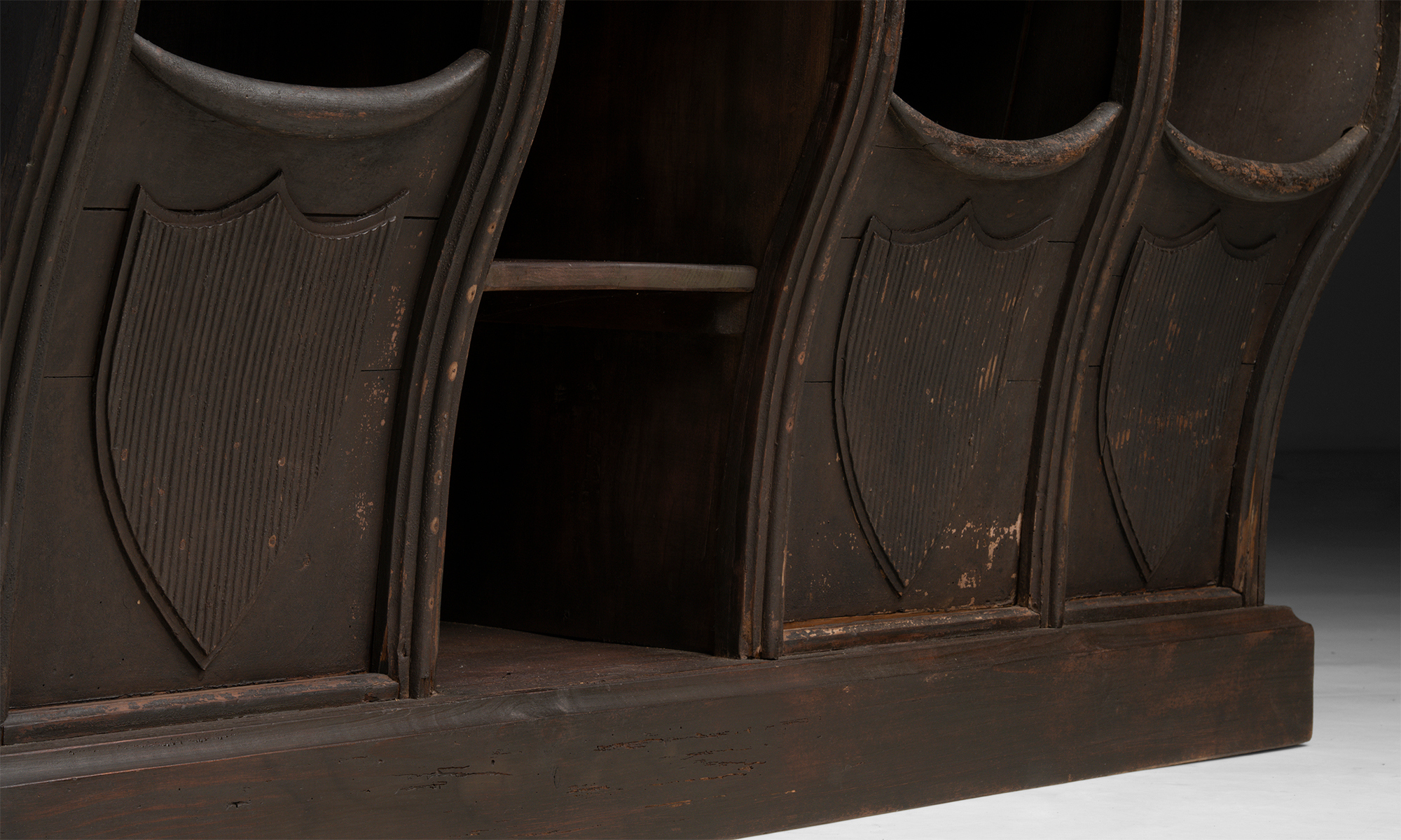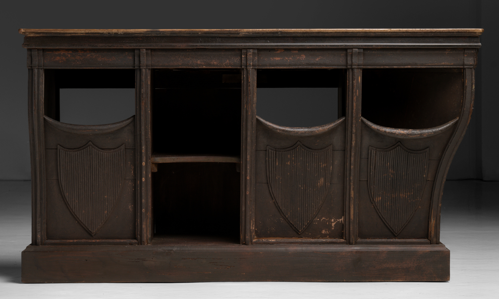 Painted pine base with a worn hardwood top. Features three arched front bins with shield-form panels and open storage behind. A practical general-store counter with original surface and coin slot.