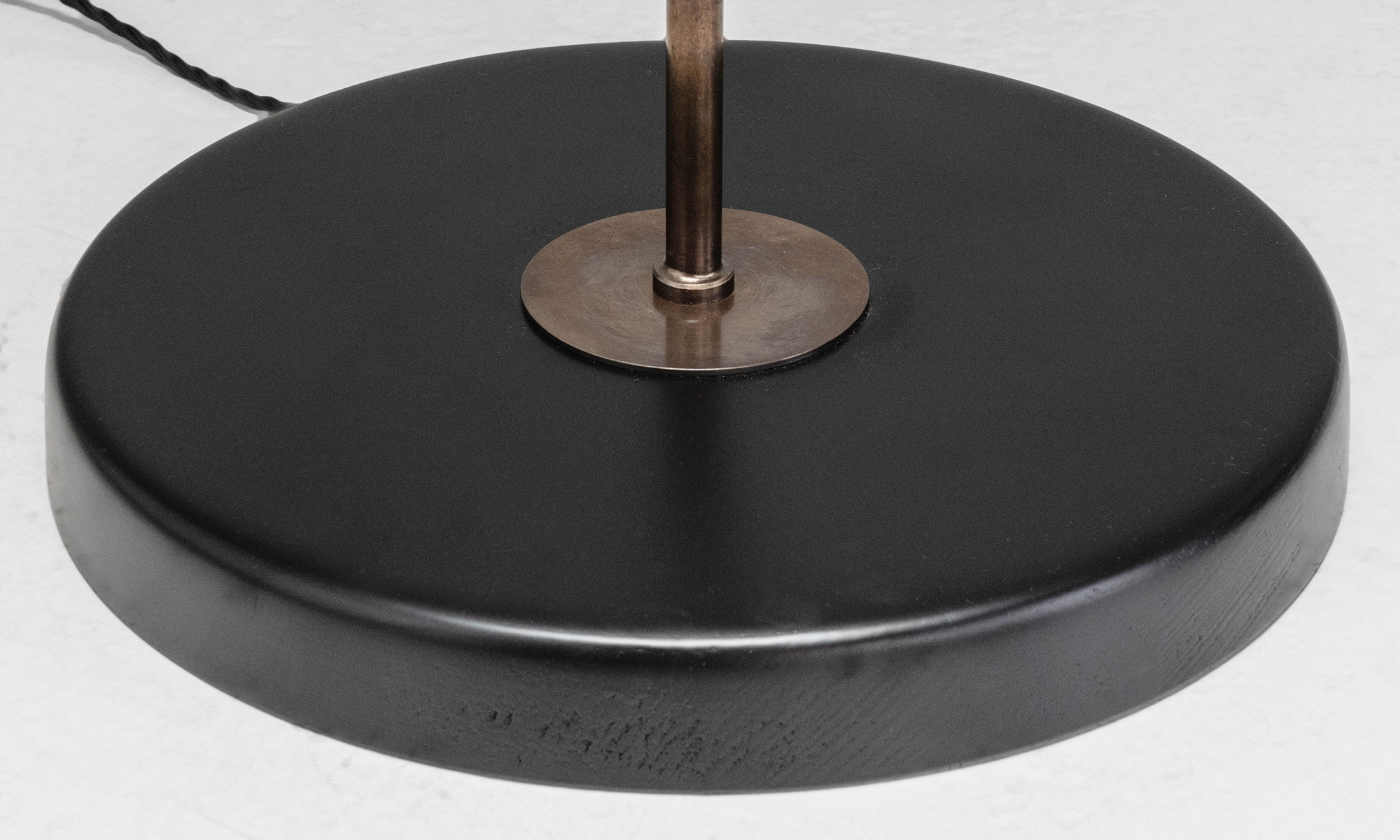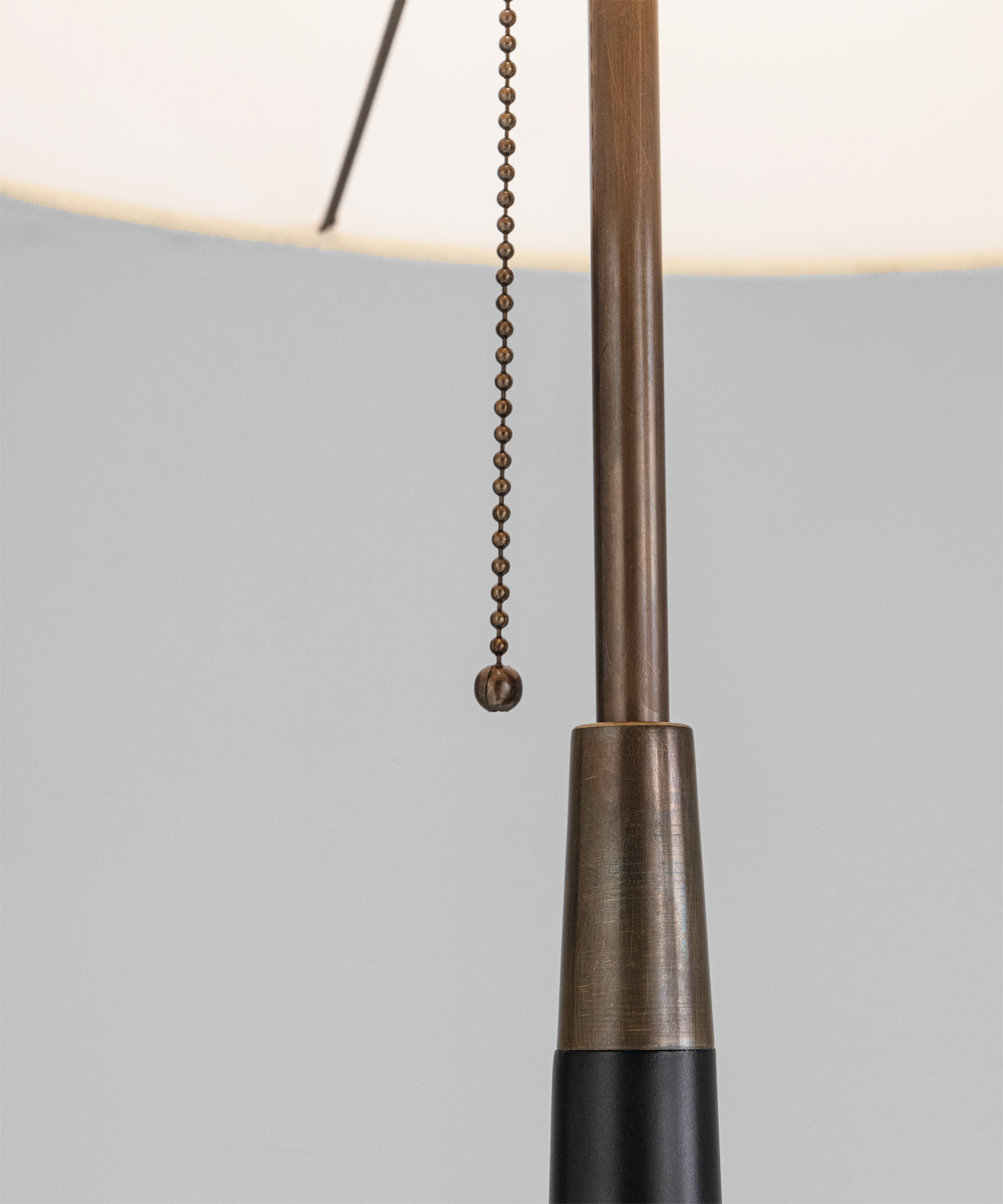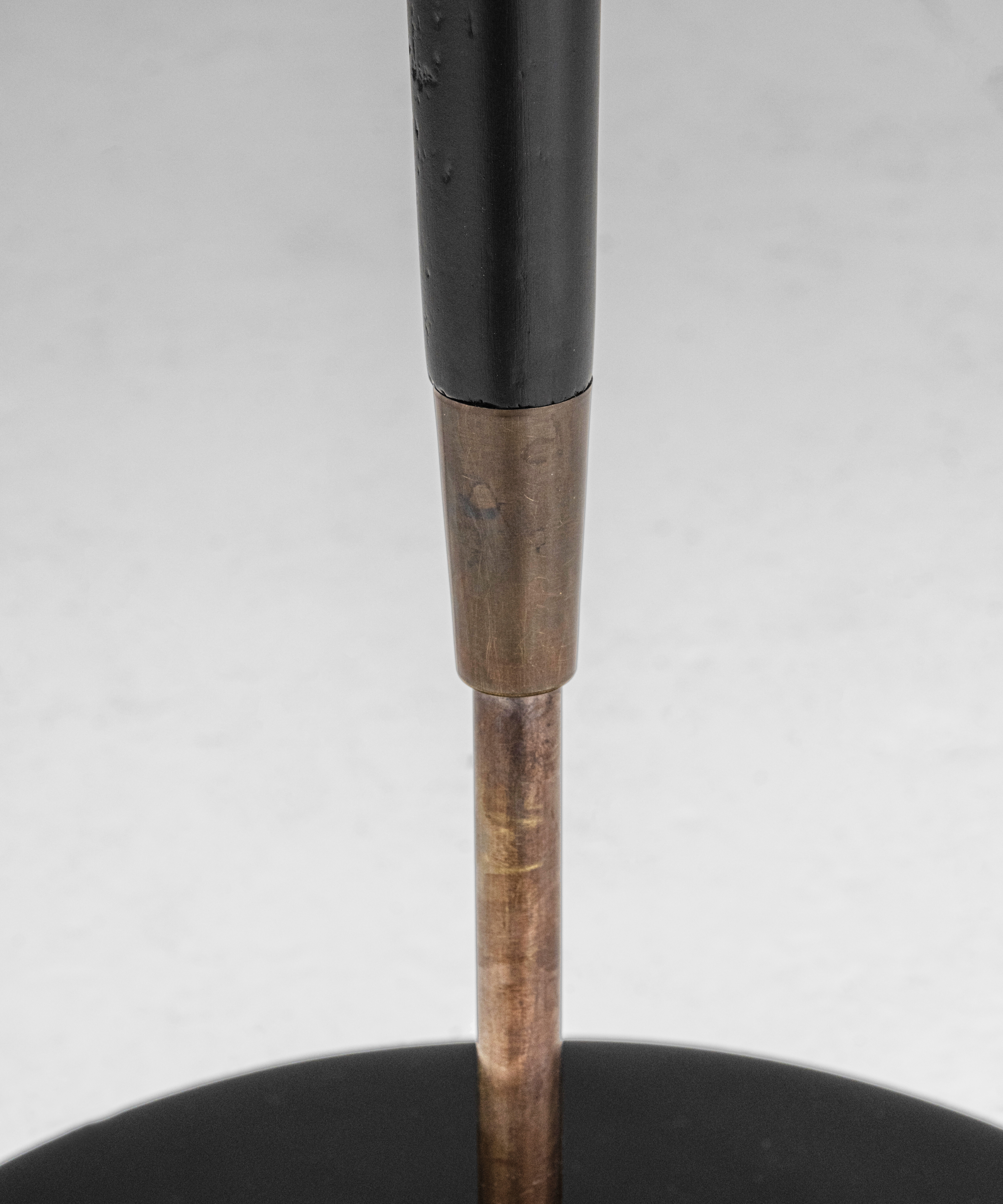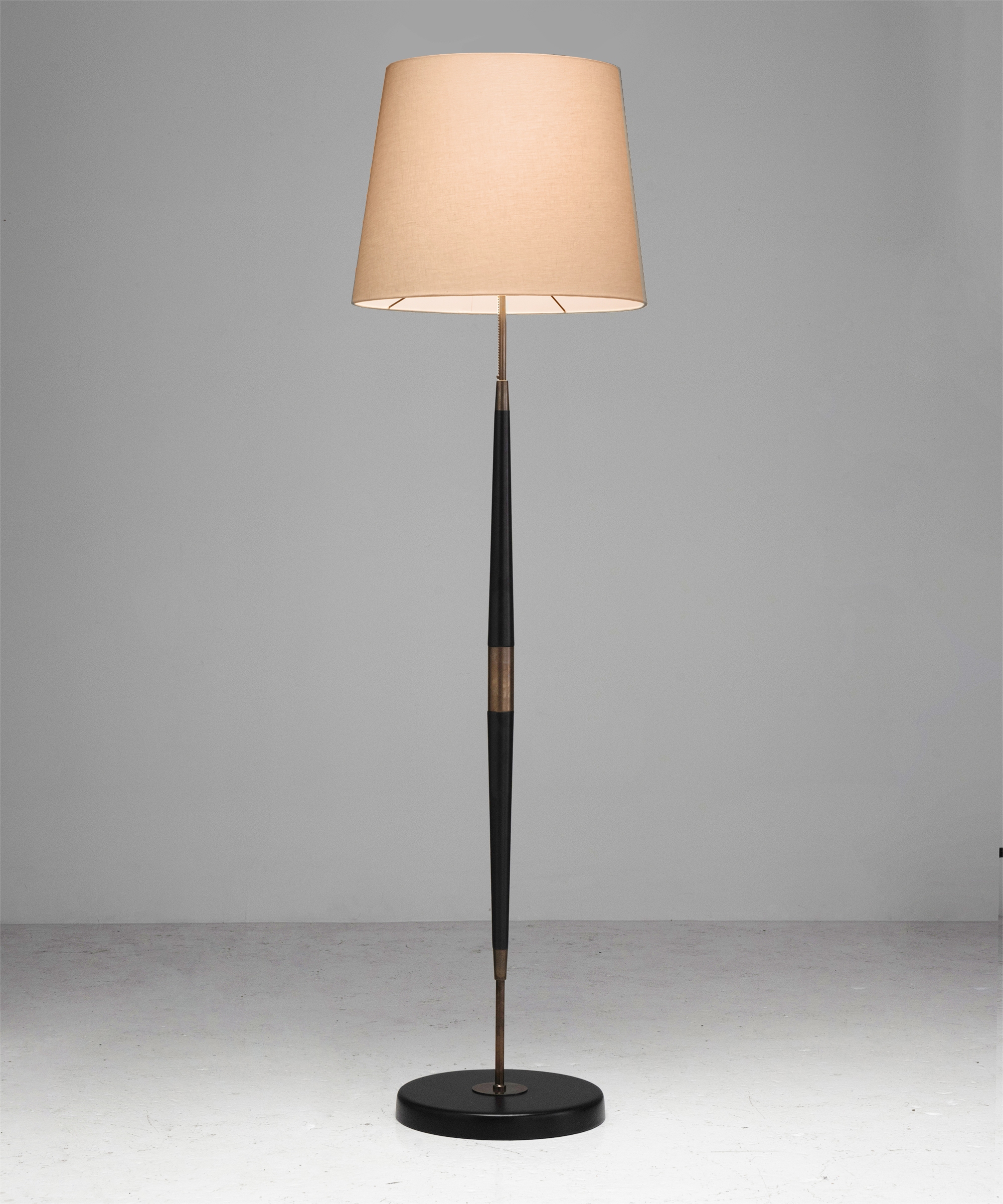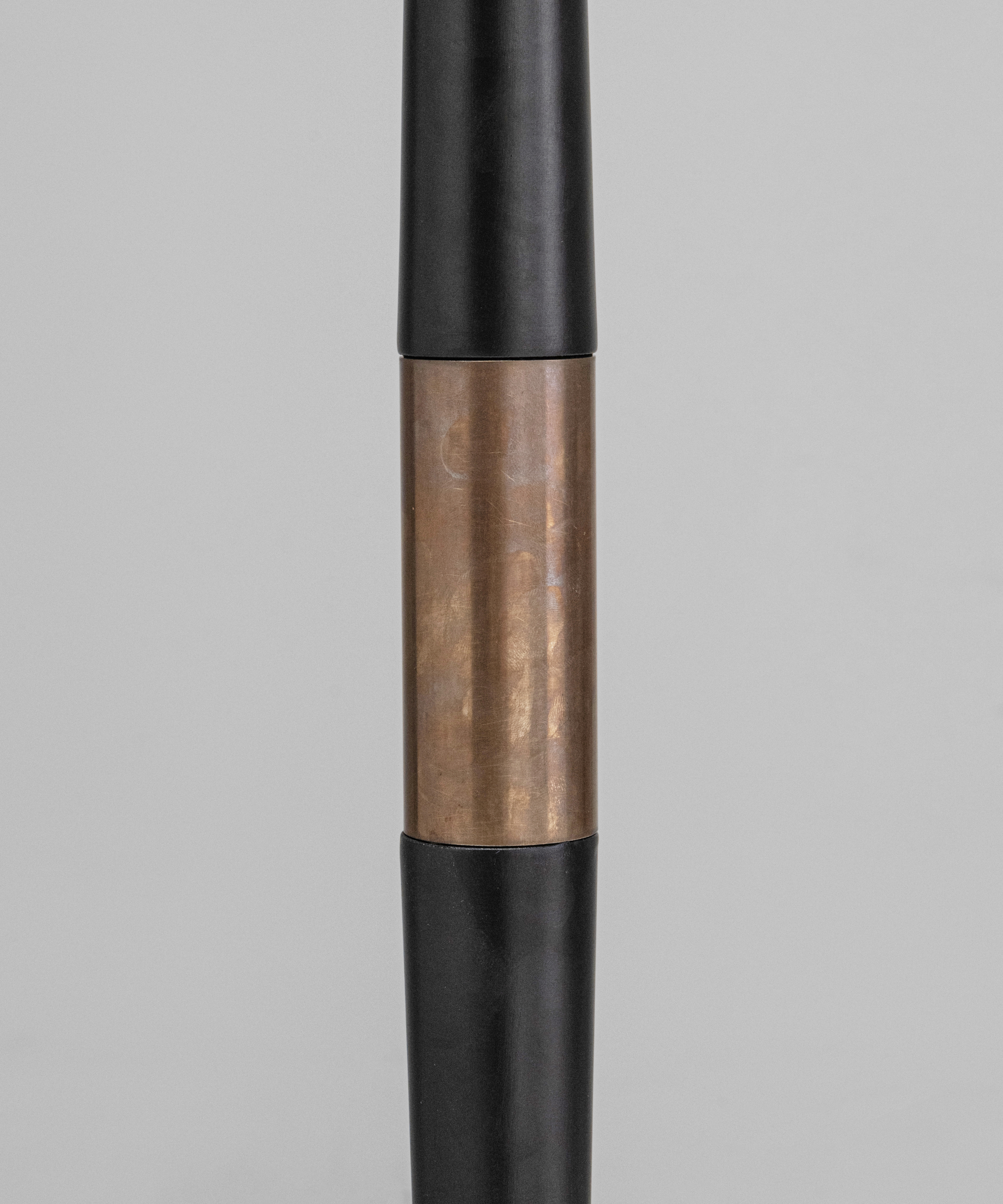 An oval shade sits atop a black wooden base and slightly tapered stand with brass detailing throughout.
