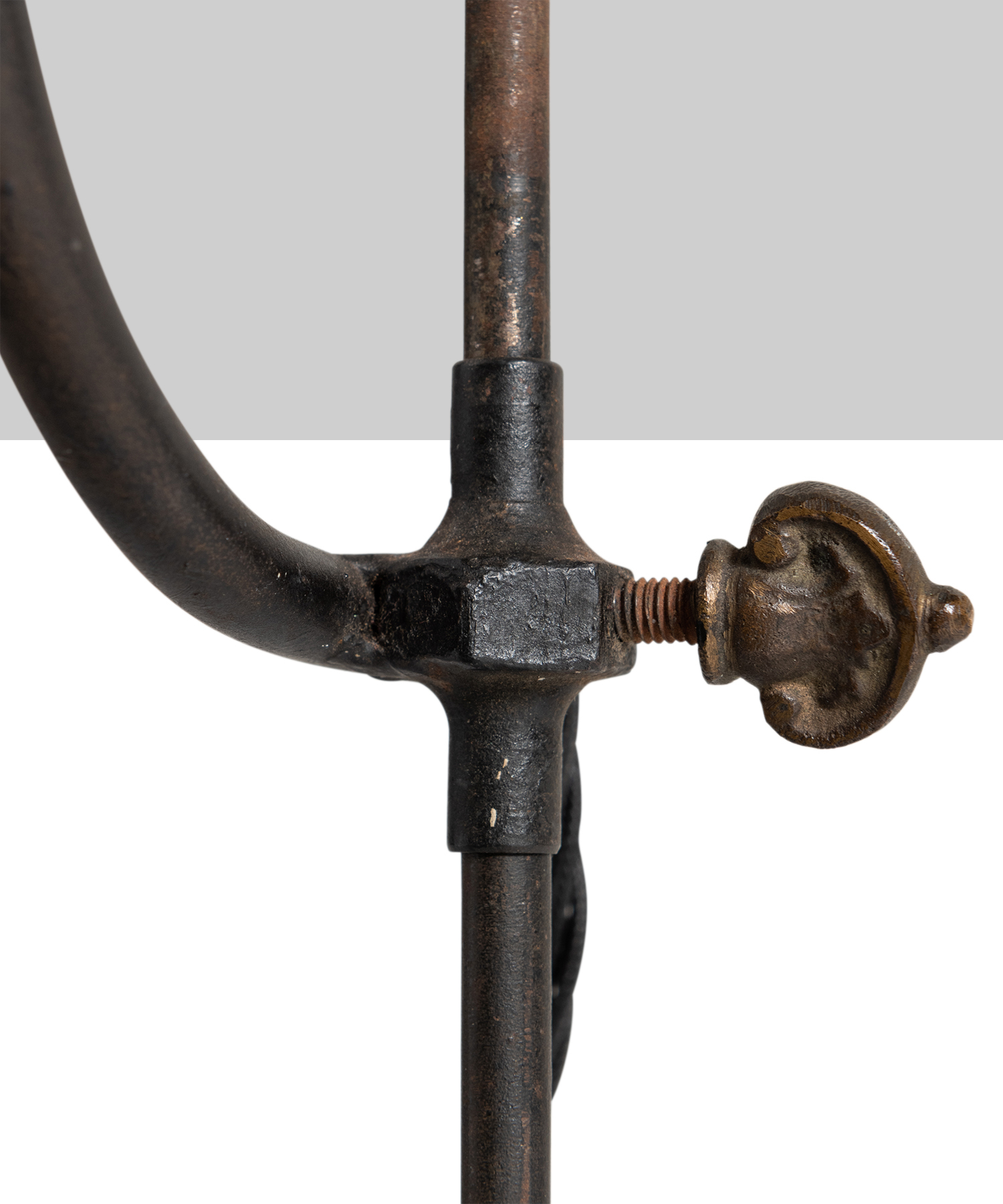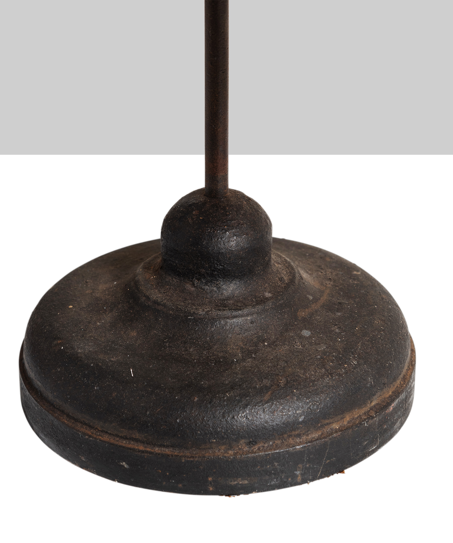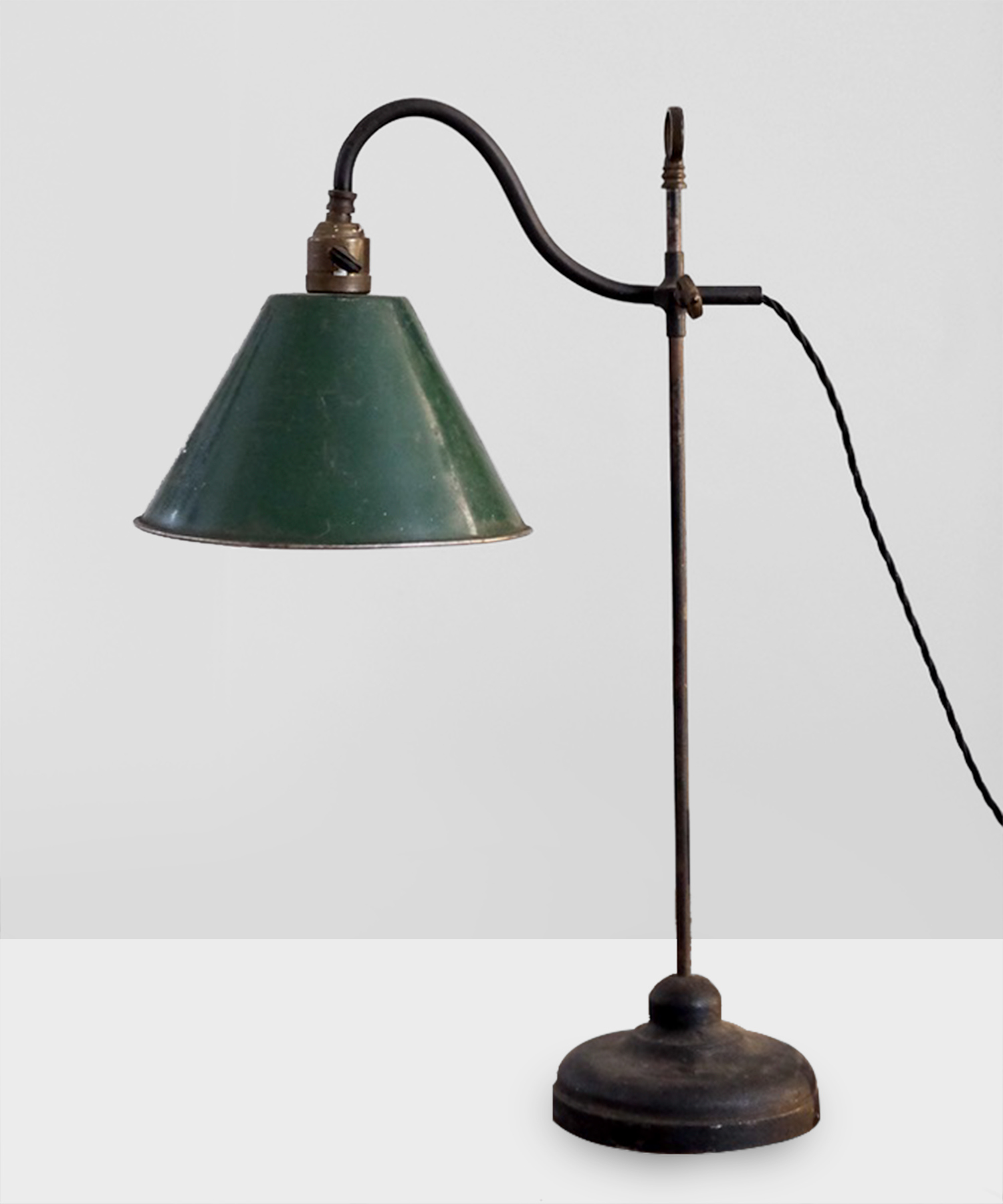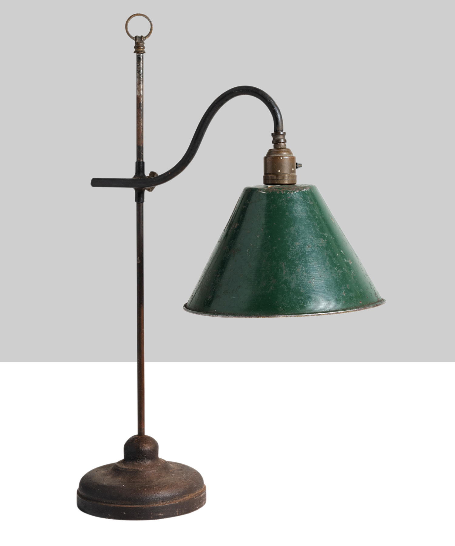Green enamel shade in original finish on beautiful patinated brass stand.