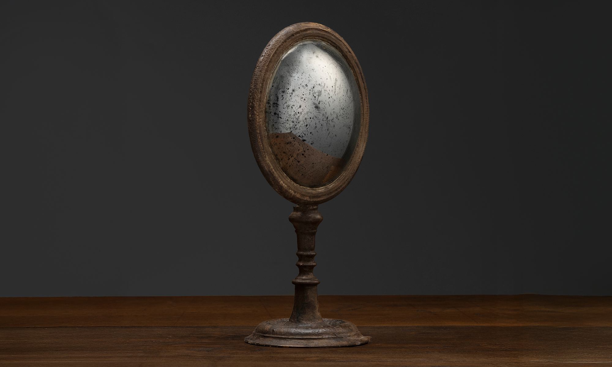 Free standing mirror with wood frame and original blue paint, convex mirror with foxing.