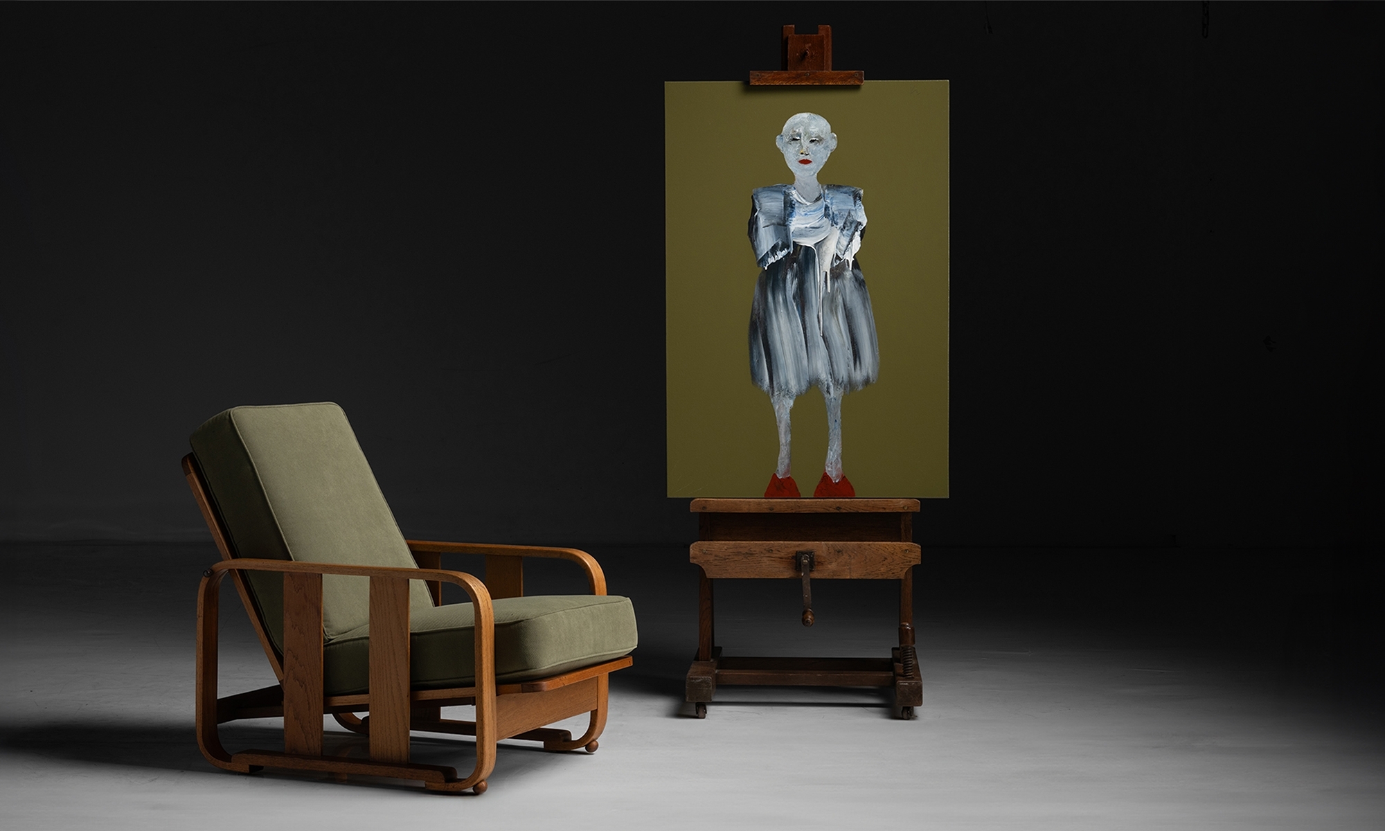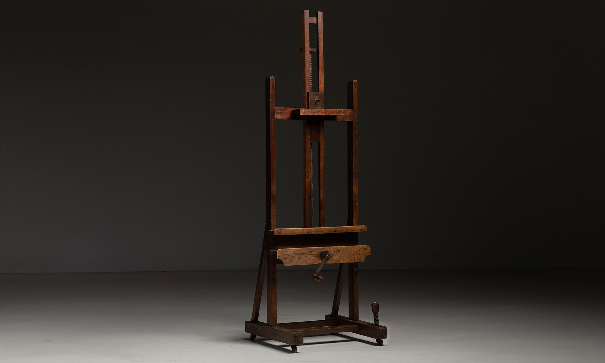 Antique Heals of London reclining frame with bentwood arms and original linen upholstery. "Olivia" by Marianne Kolb, mixed media on canvas. Elm and oak artist's easel originally used by Louis Keyne.
