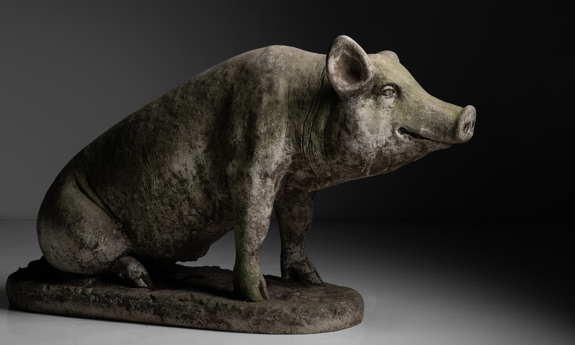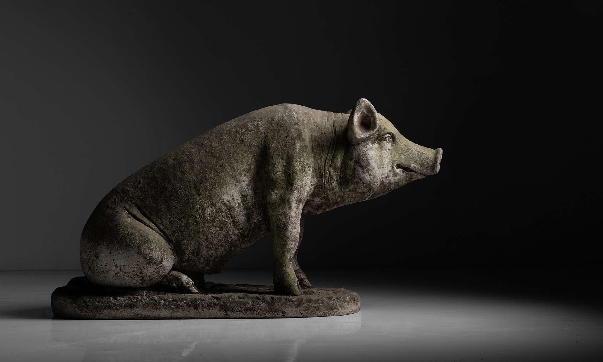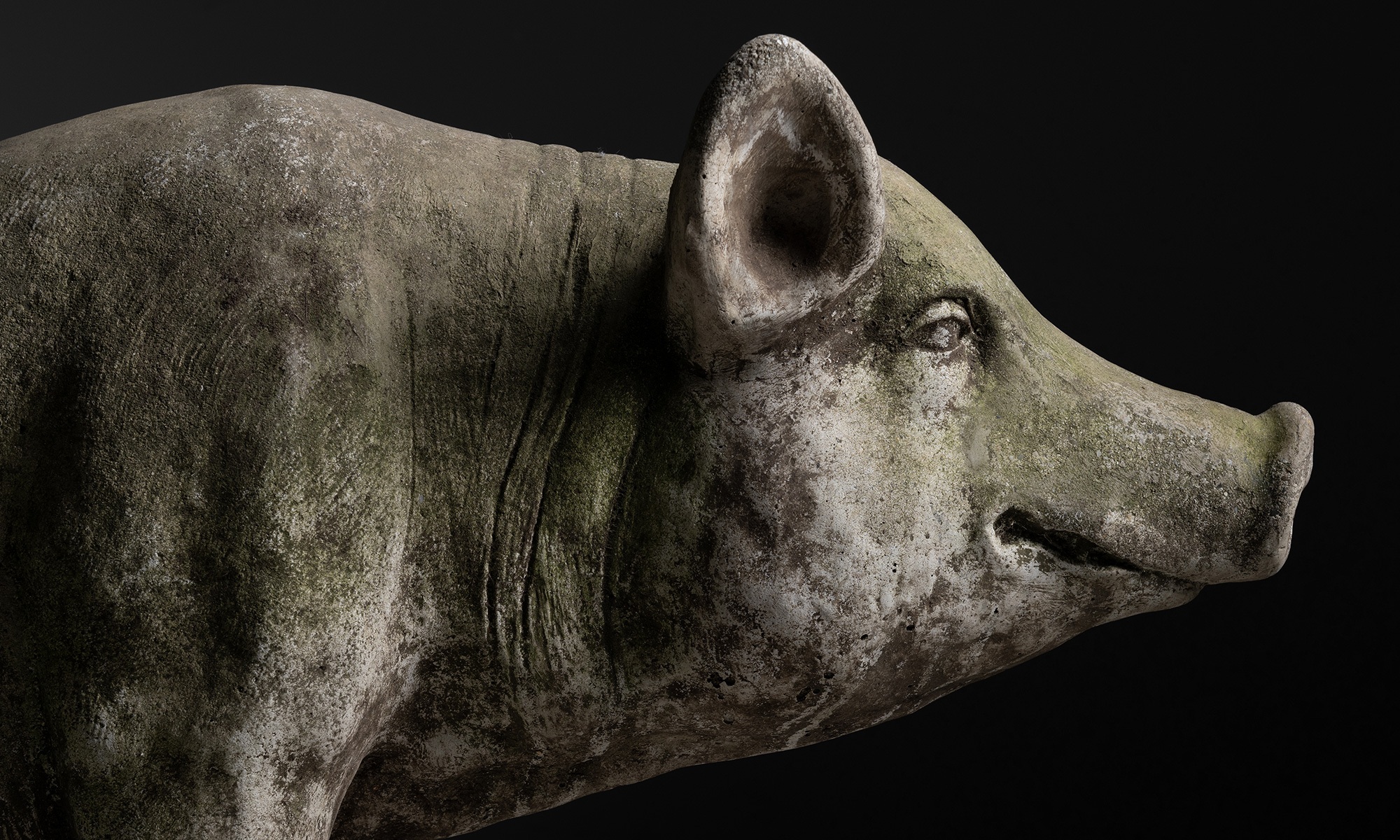 Garden statue of a pig with weathered patina and moss on surface.