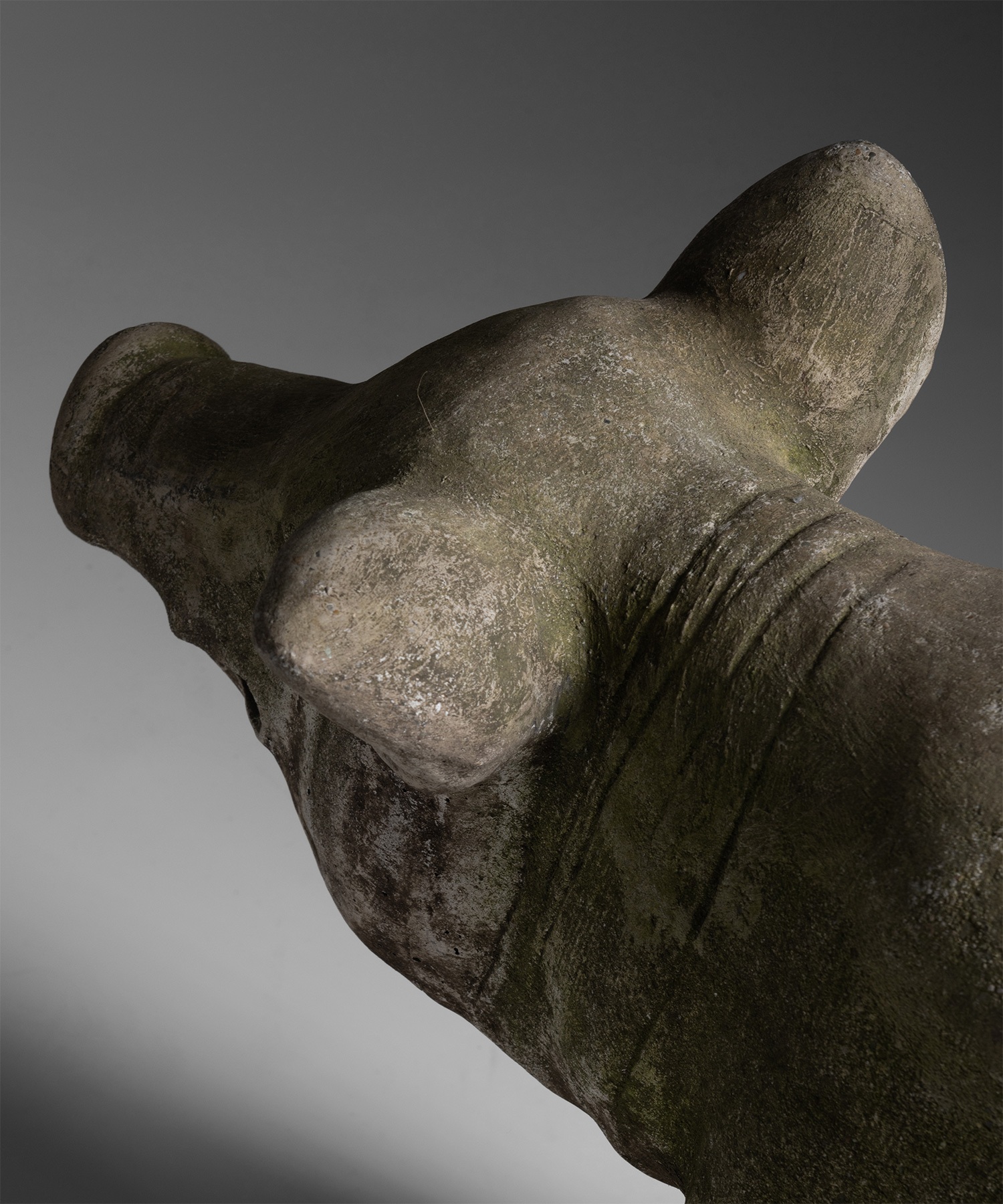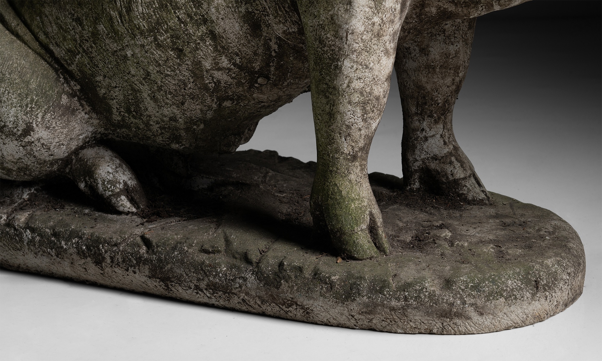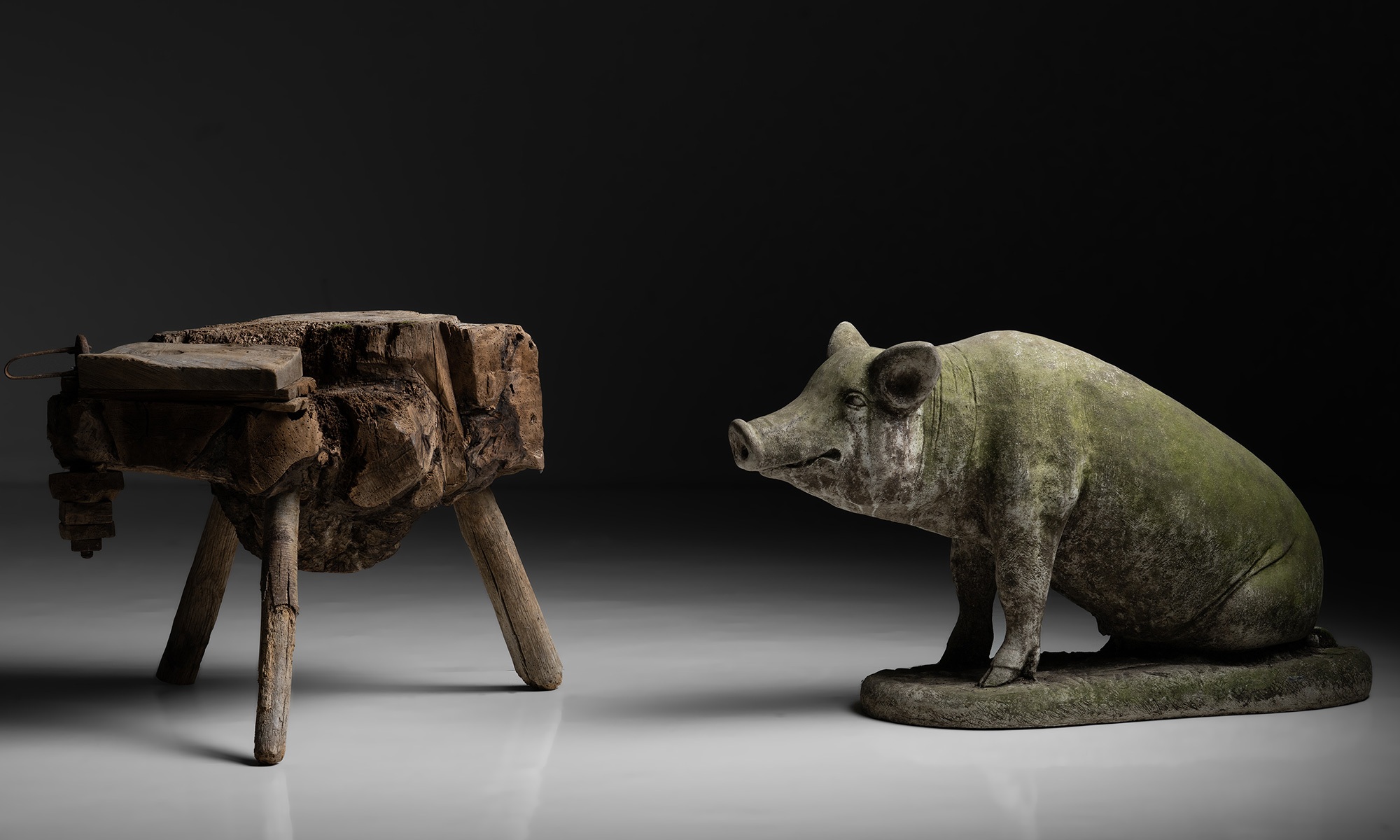 Garden statue of a pig with weathered patina and moss on surface.