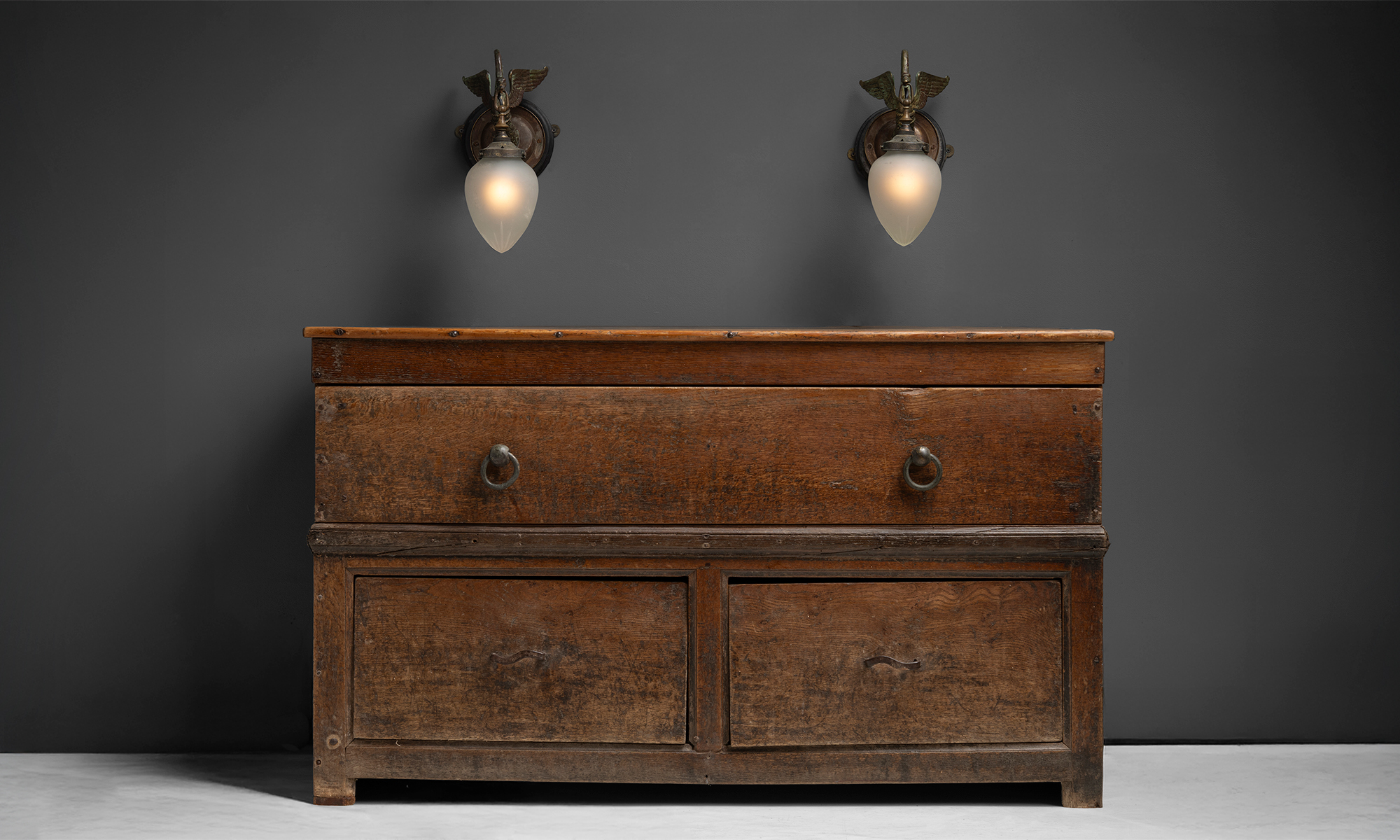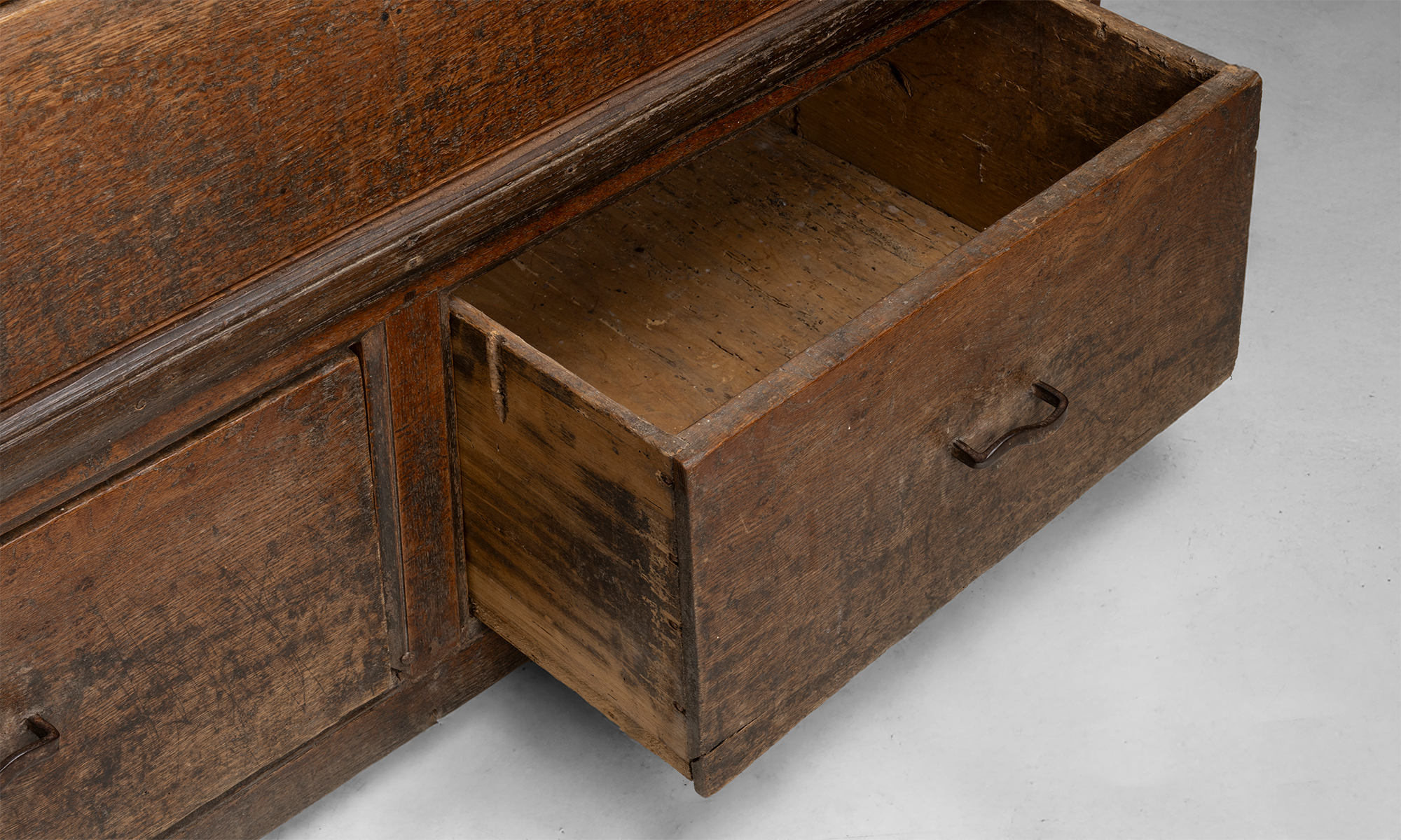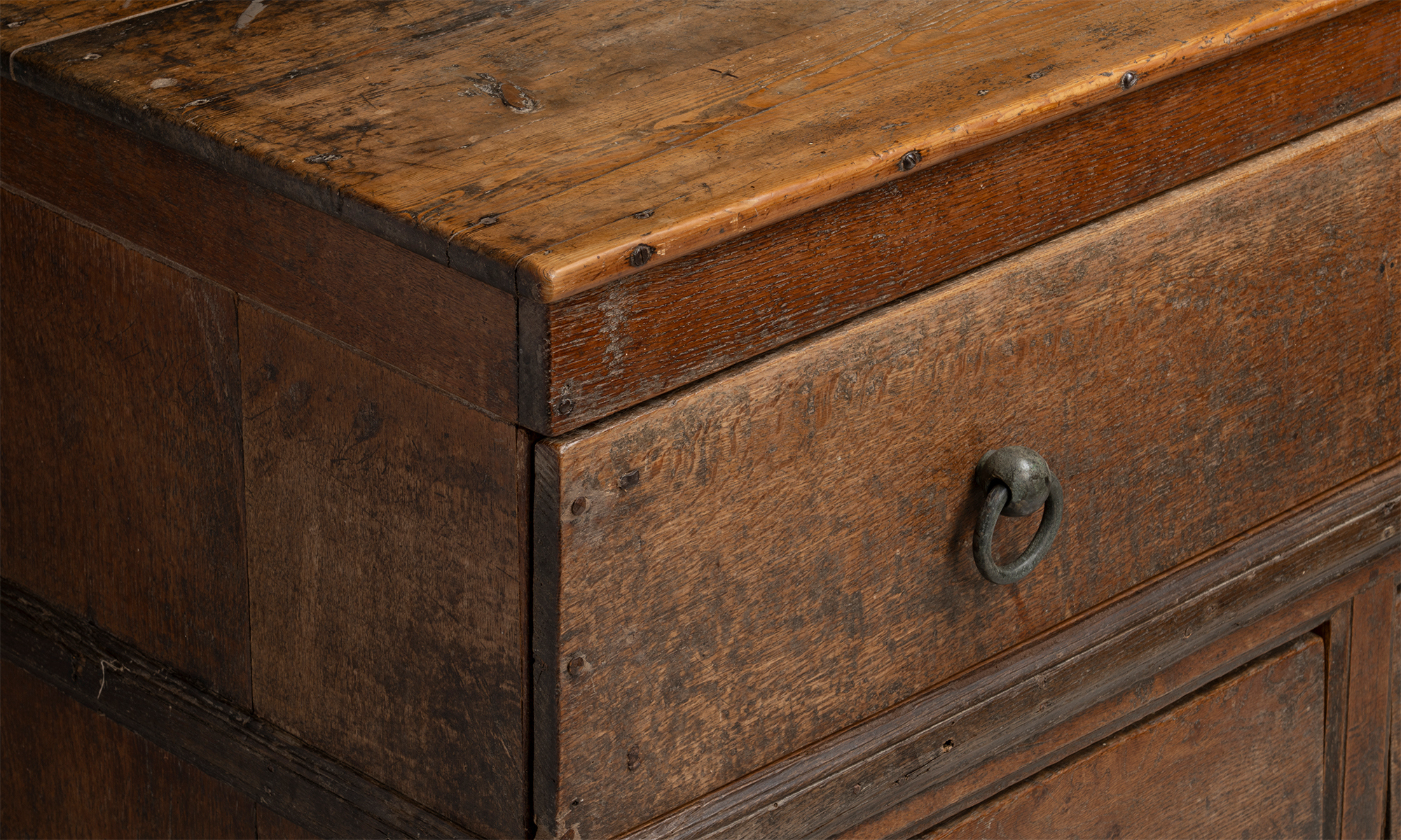 Large oak country dresser with 3 drawers, brass and iron pulls.