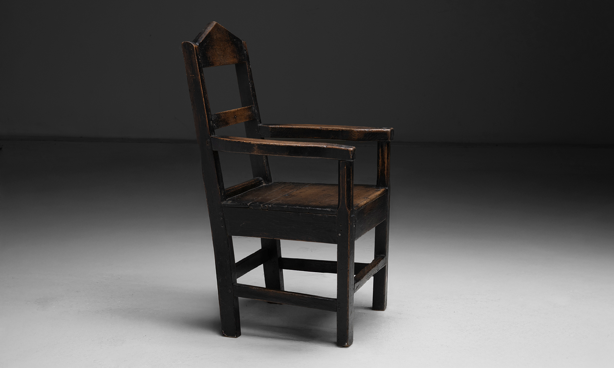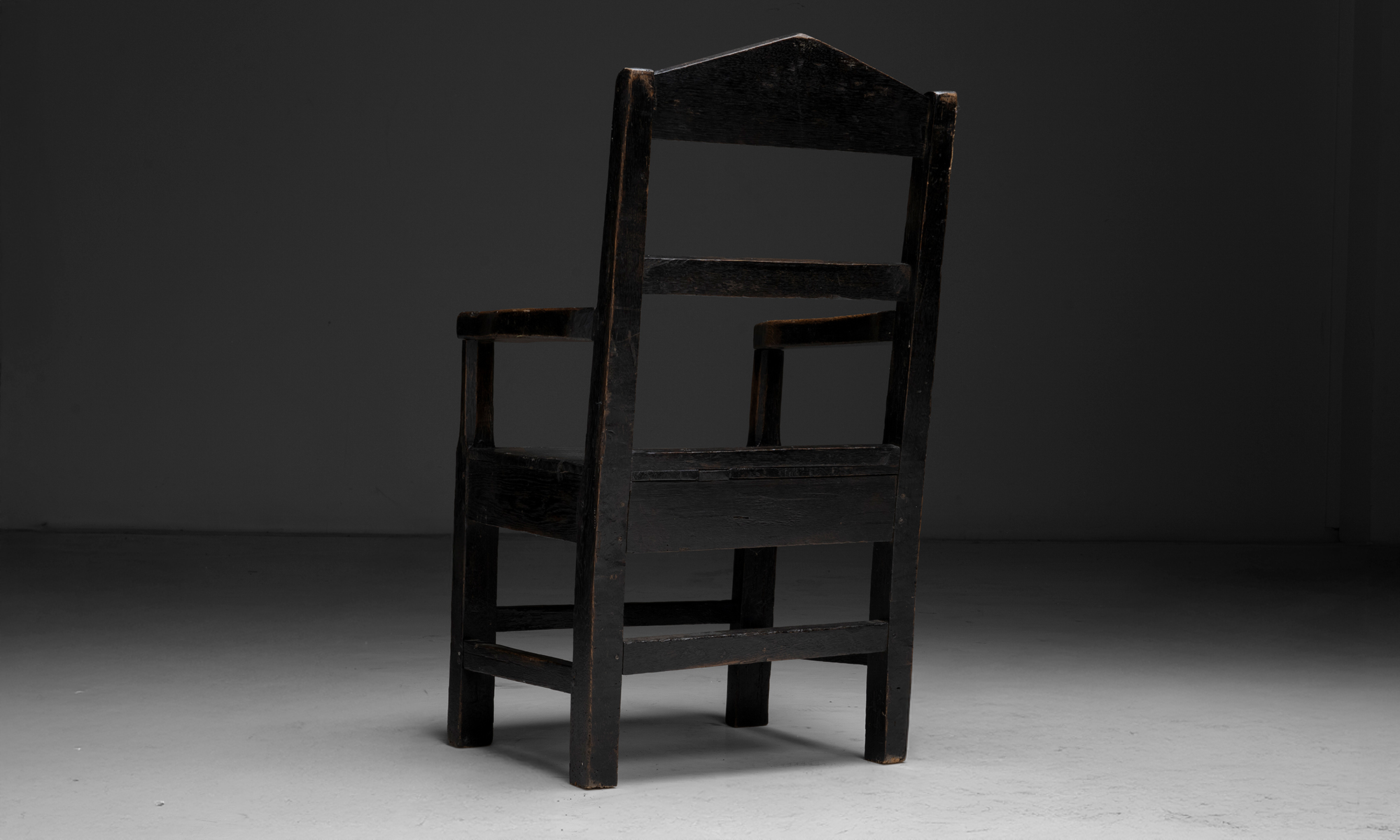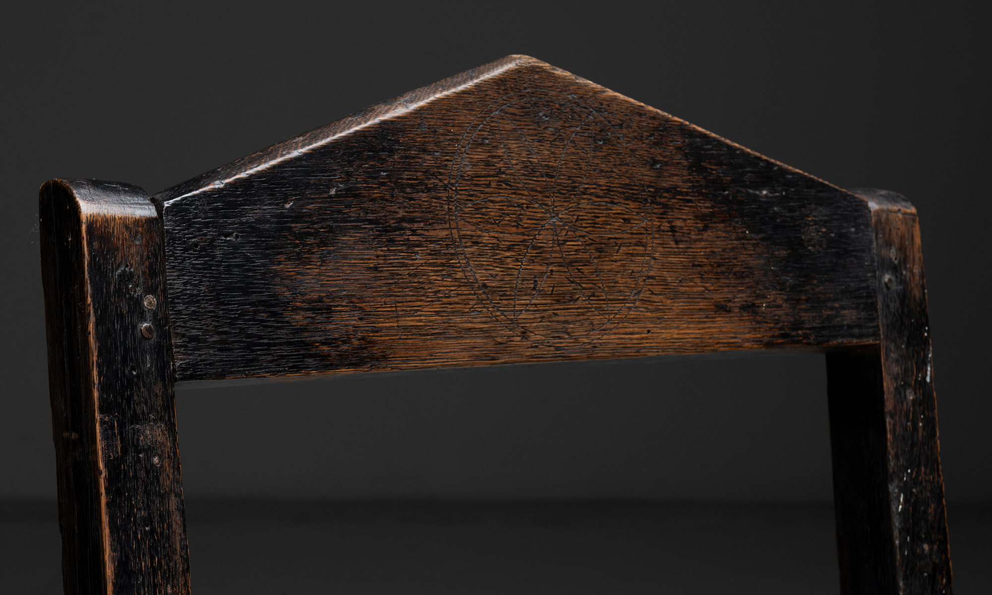 Oak armchair with carved daisy wheel on the backrest, meant to ward off evil spirits.