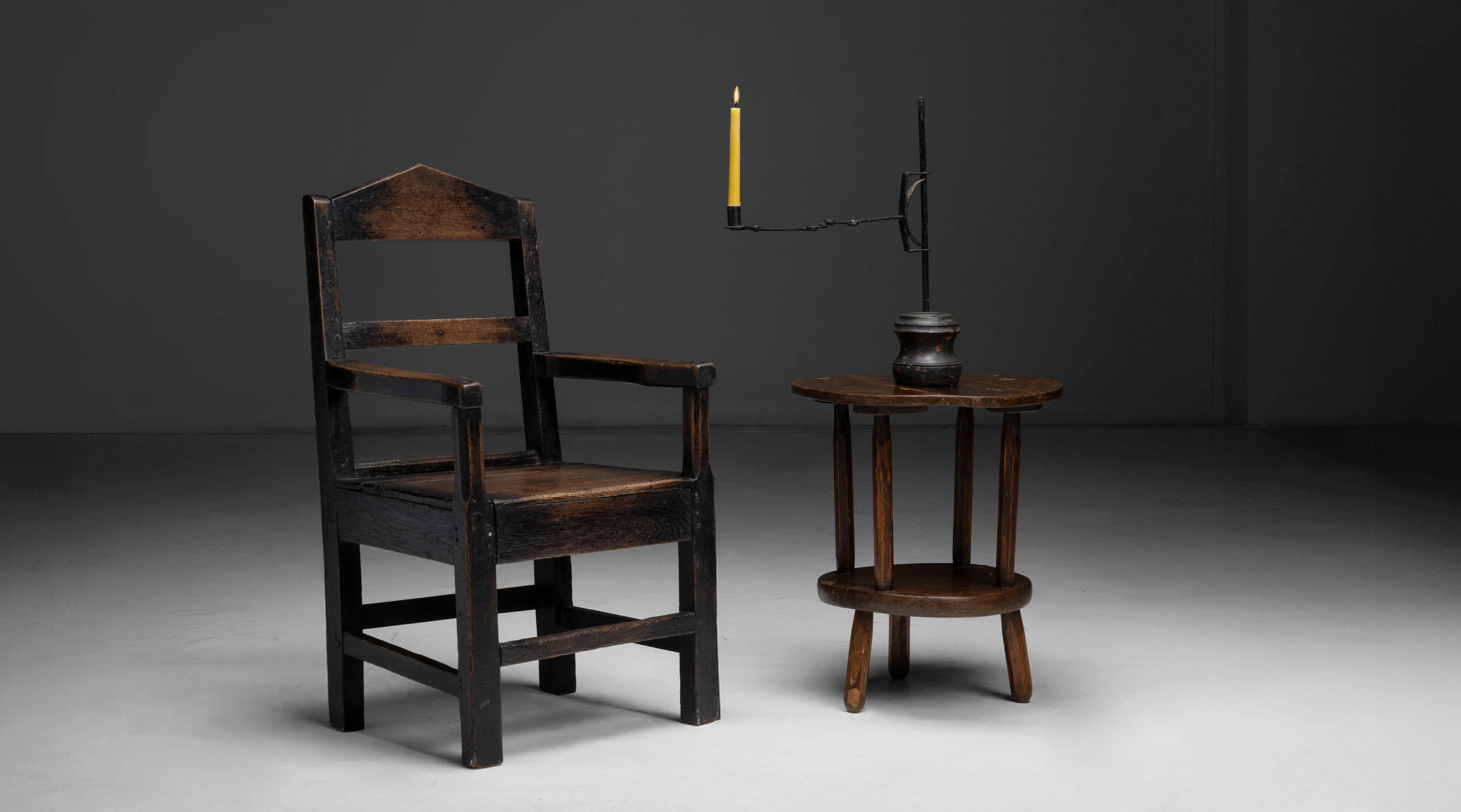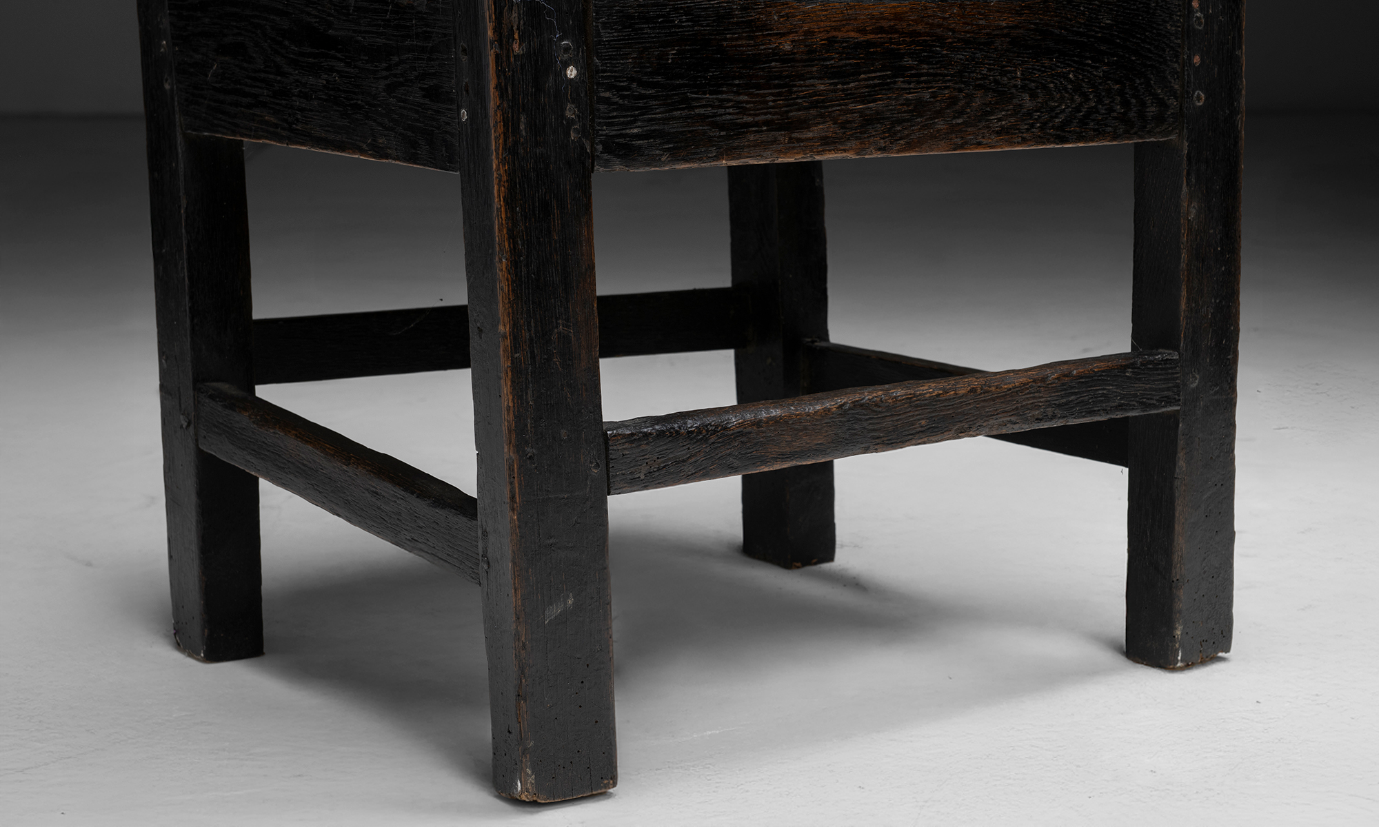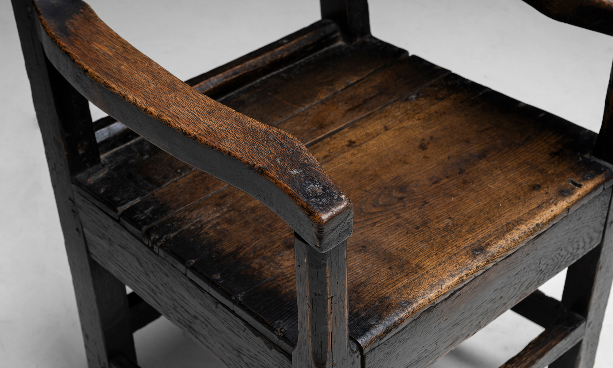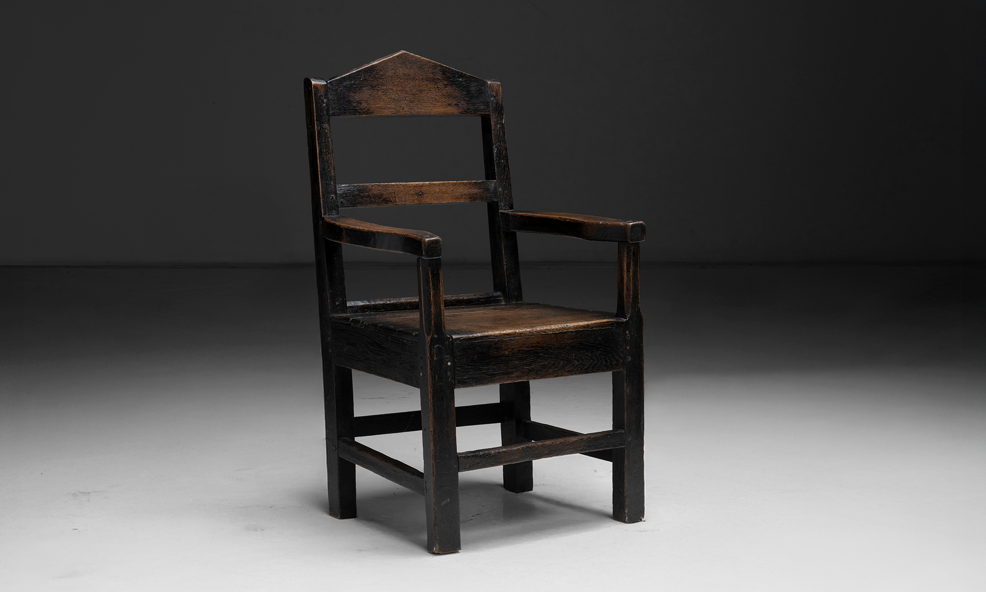 Oak armchair with carved daisy wheel on the backrest, meant to ward off evil spirits.