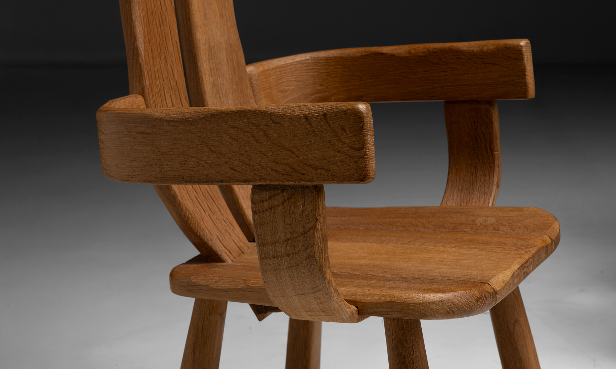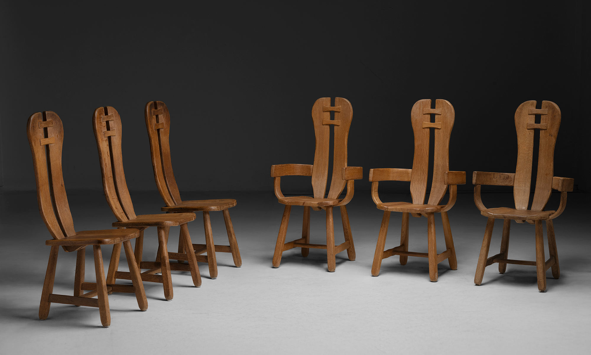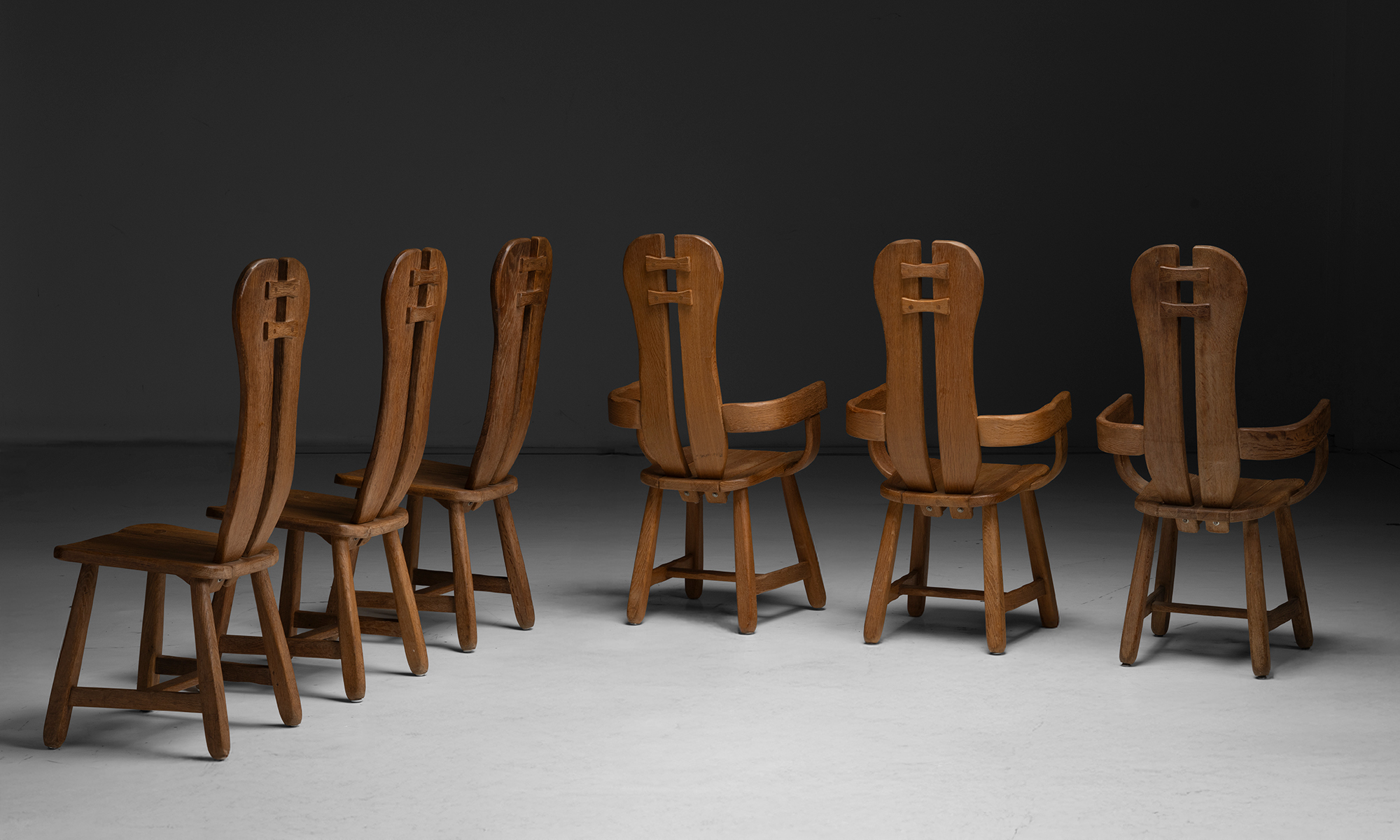 Brutalist dining chairs constructed in Oak. 3 with arms, 3 without.