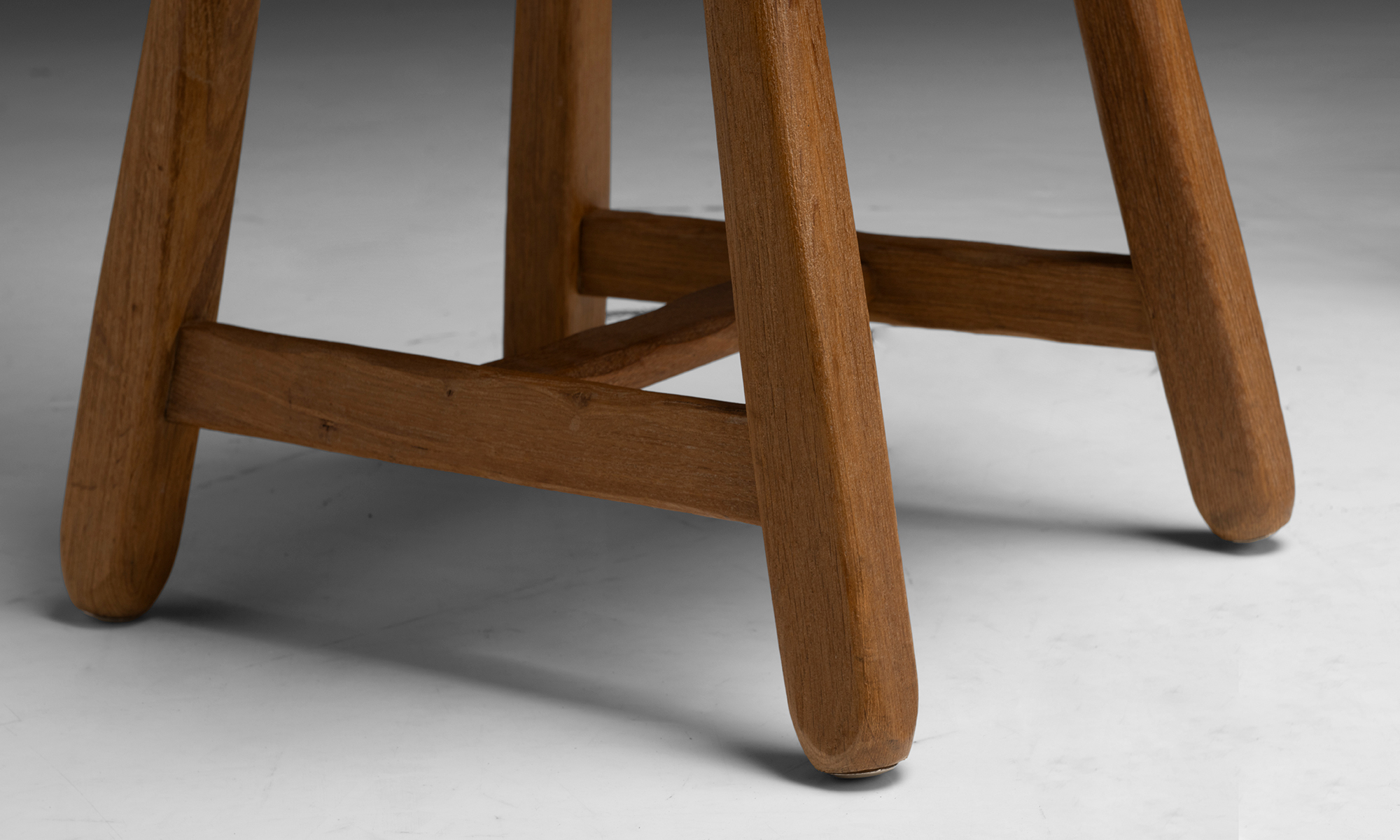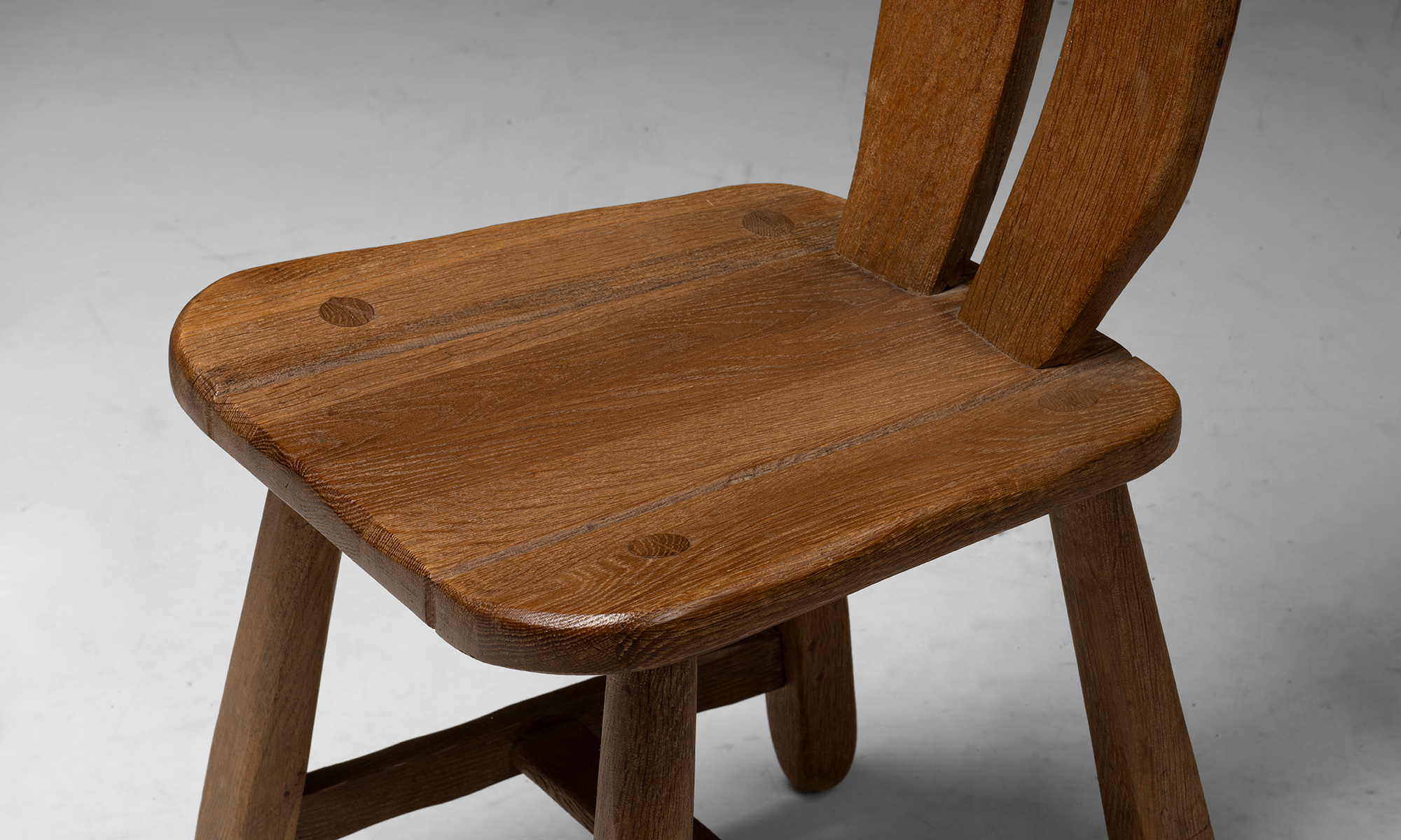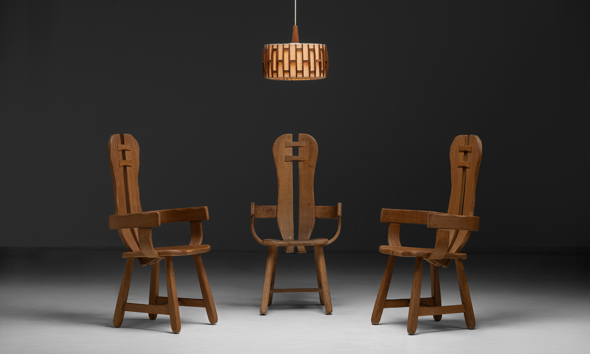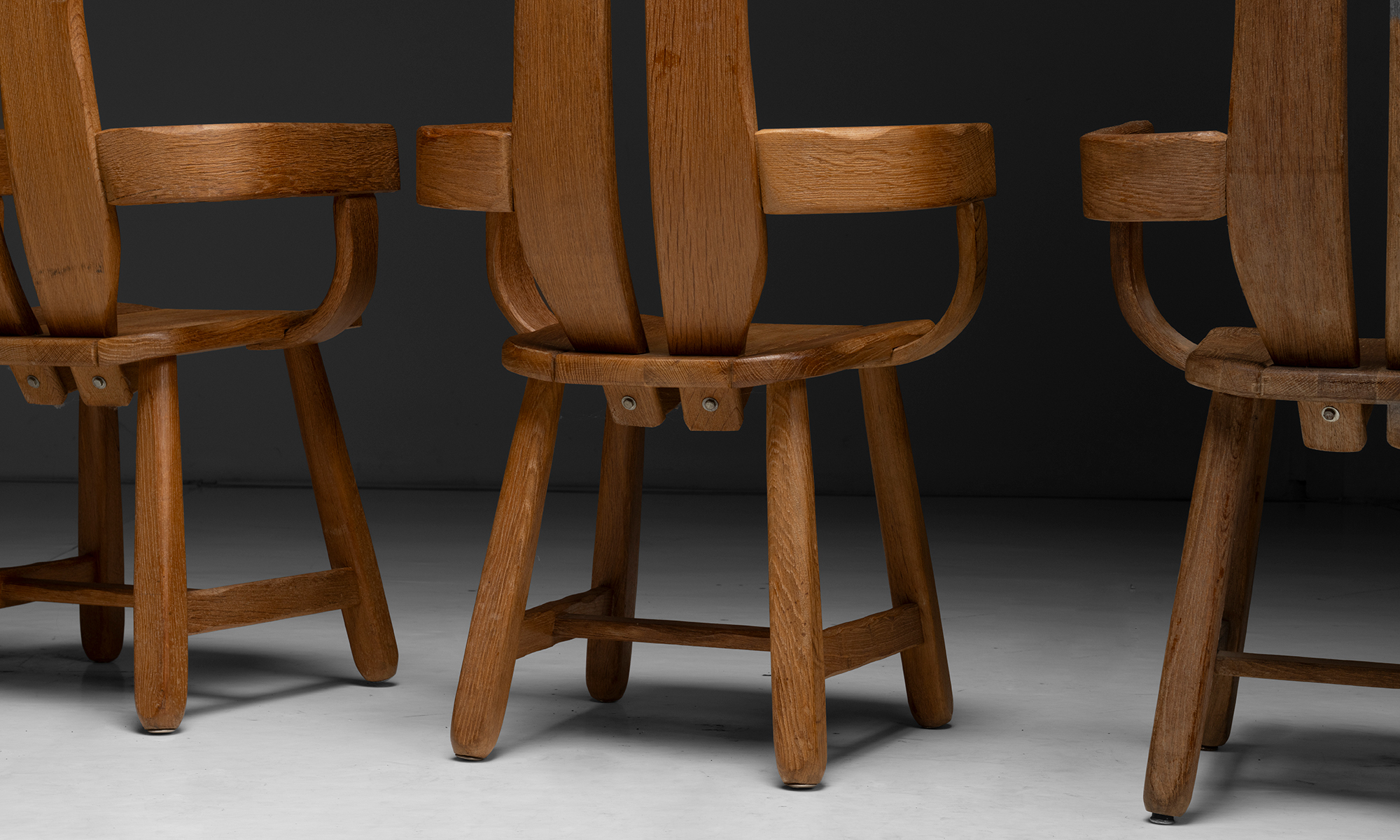 Brutalist dining chairs constructed in Oak. 3 with arms, 3 without.