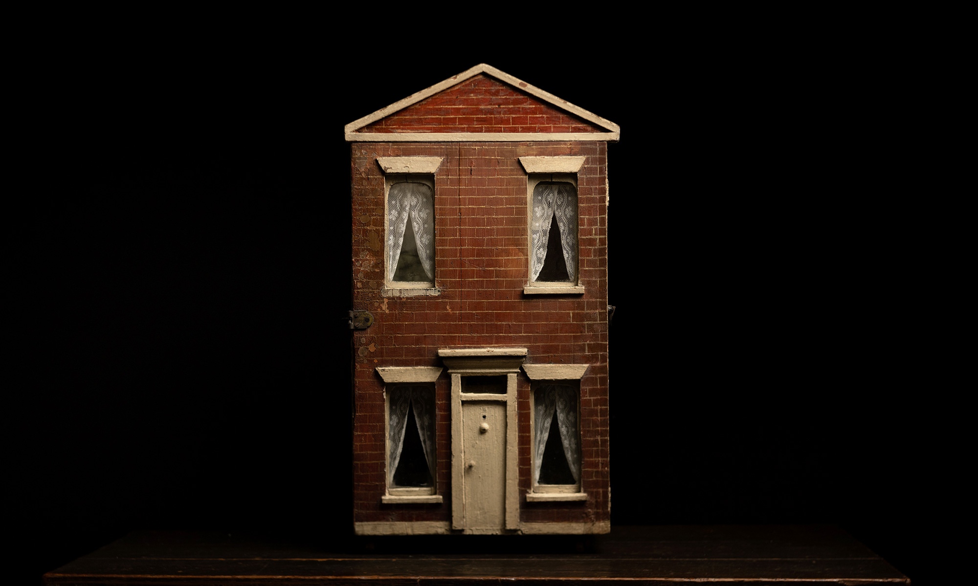 Handmade wooden doll house with brick facade, and wall papered interior.