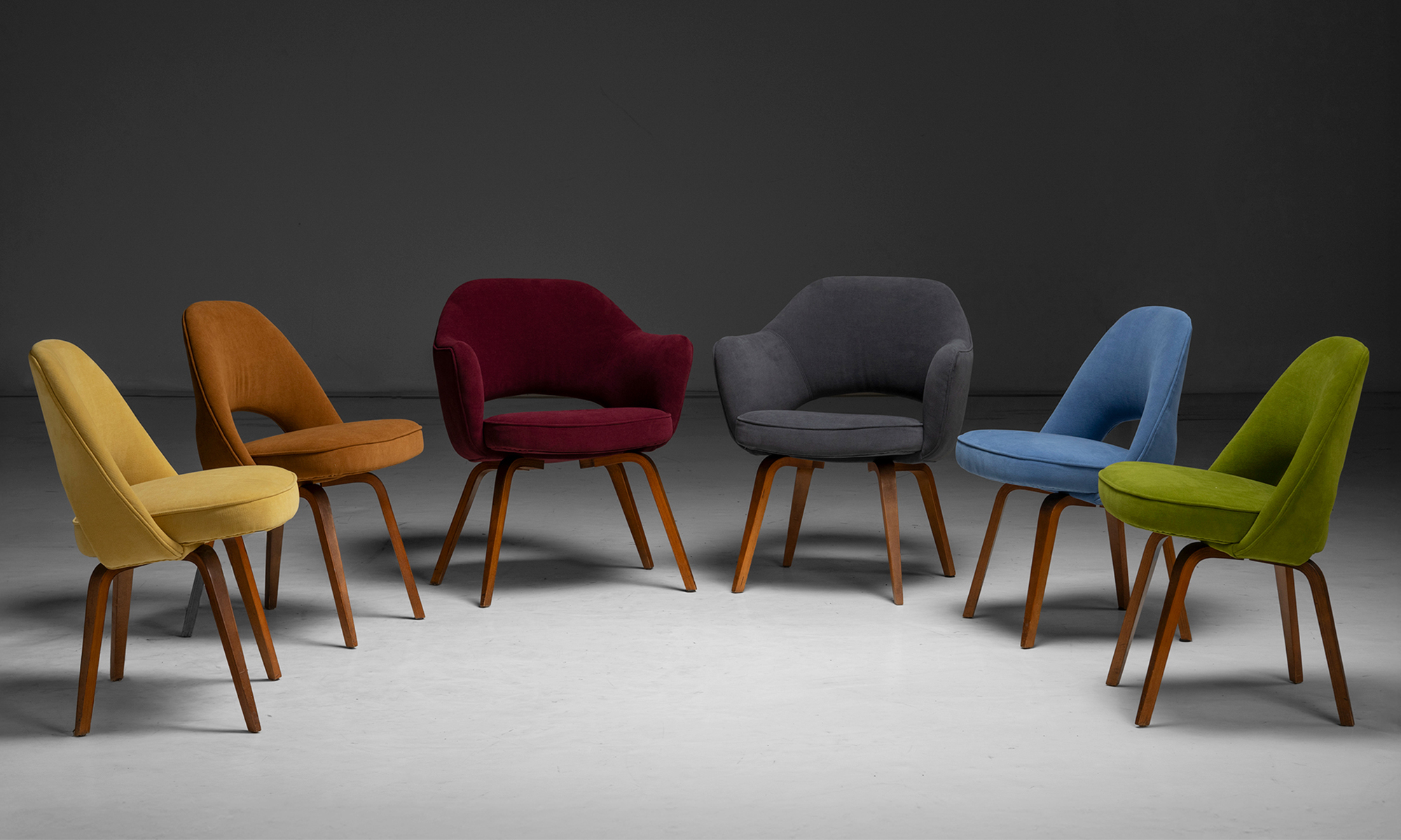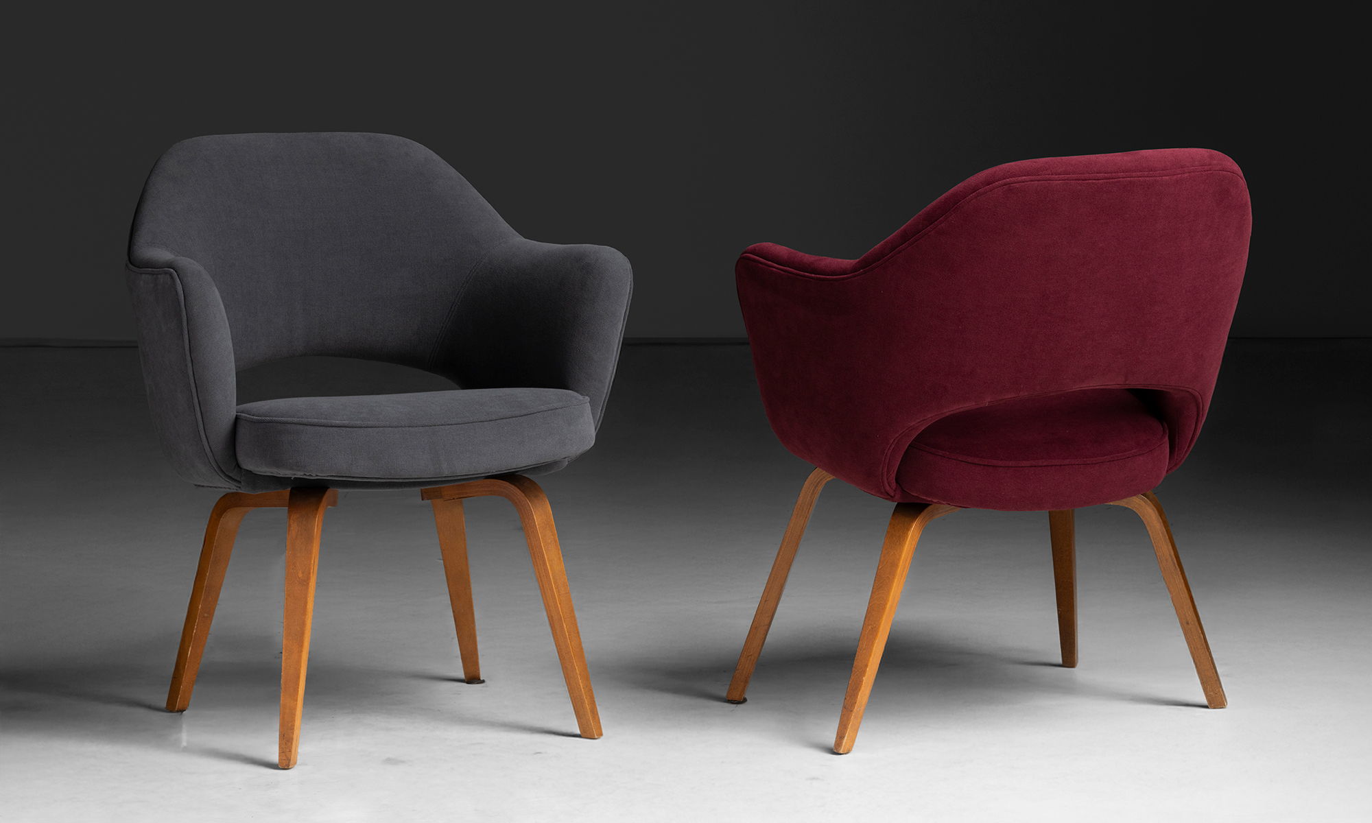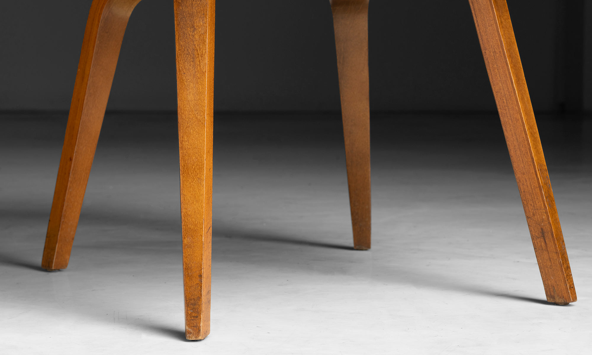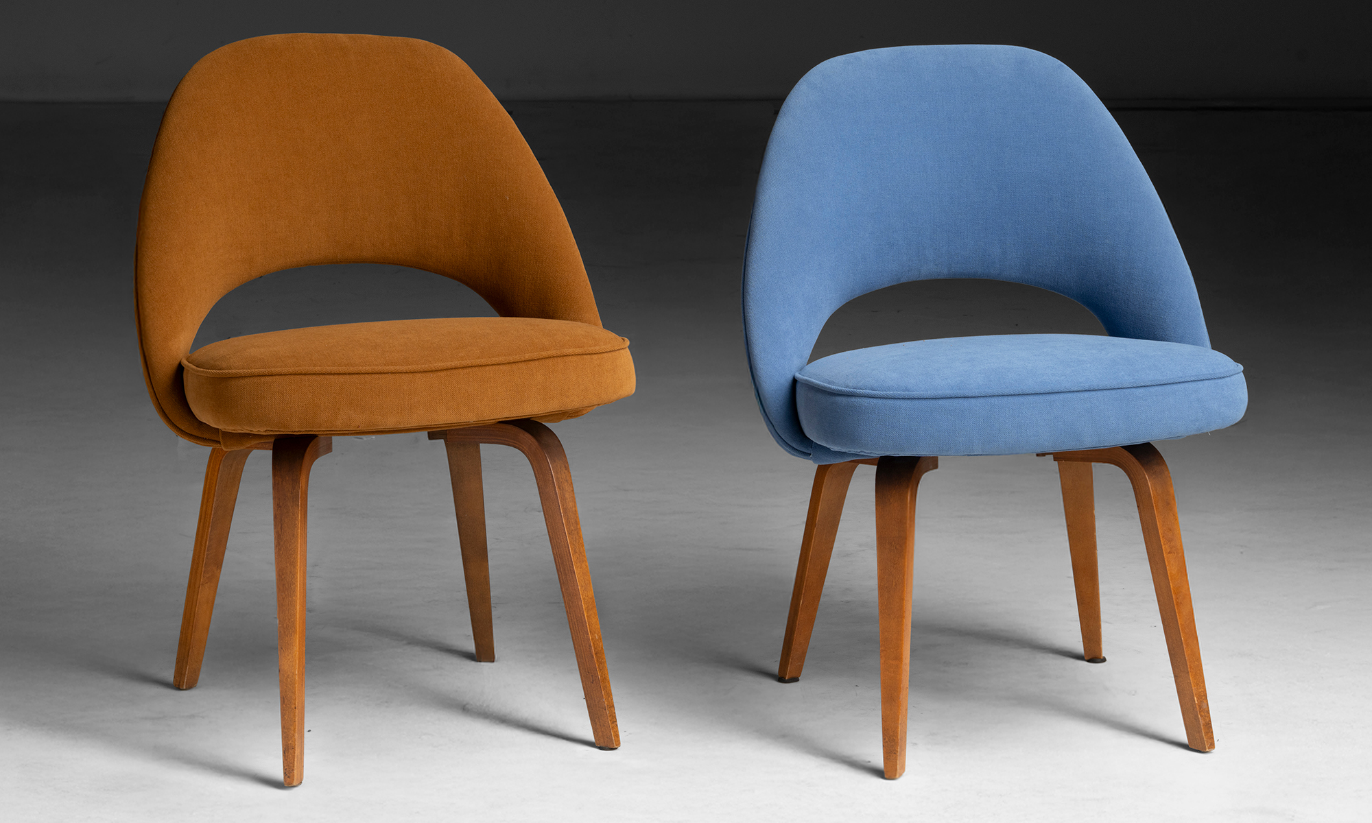 Walnut plywood legs, newly upholstered in Knoll fabric. 2 with arms, 4 without arms.