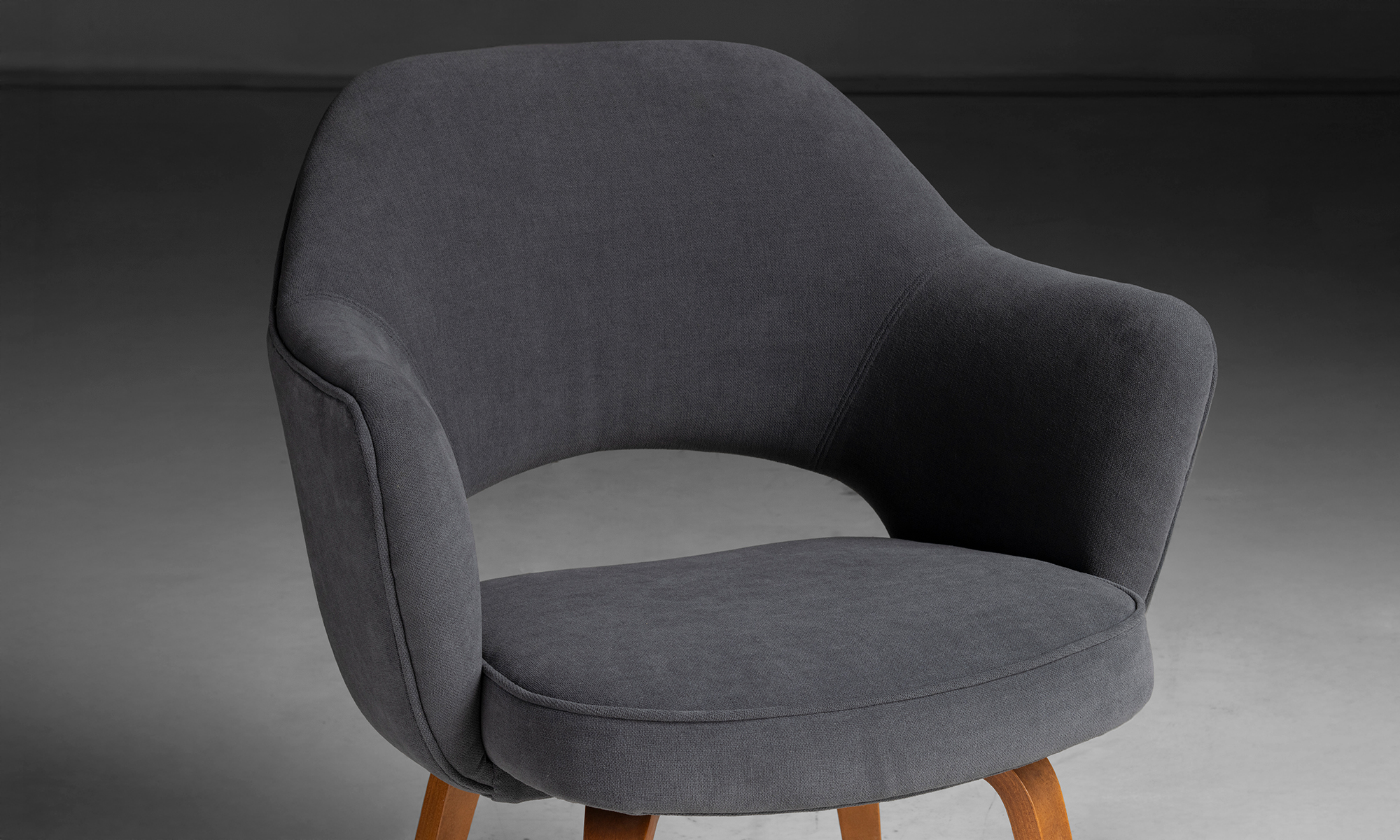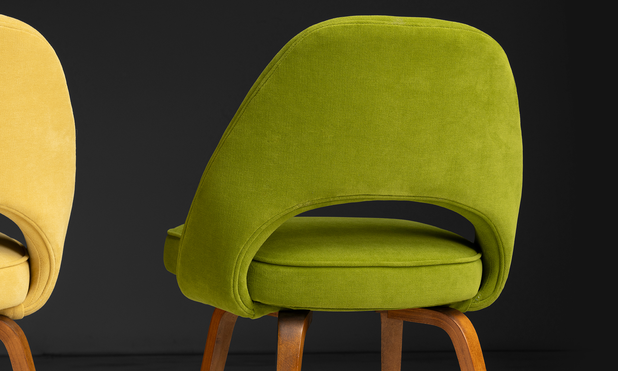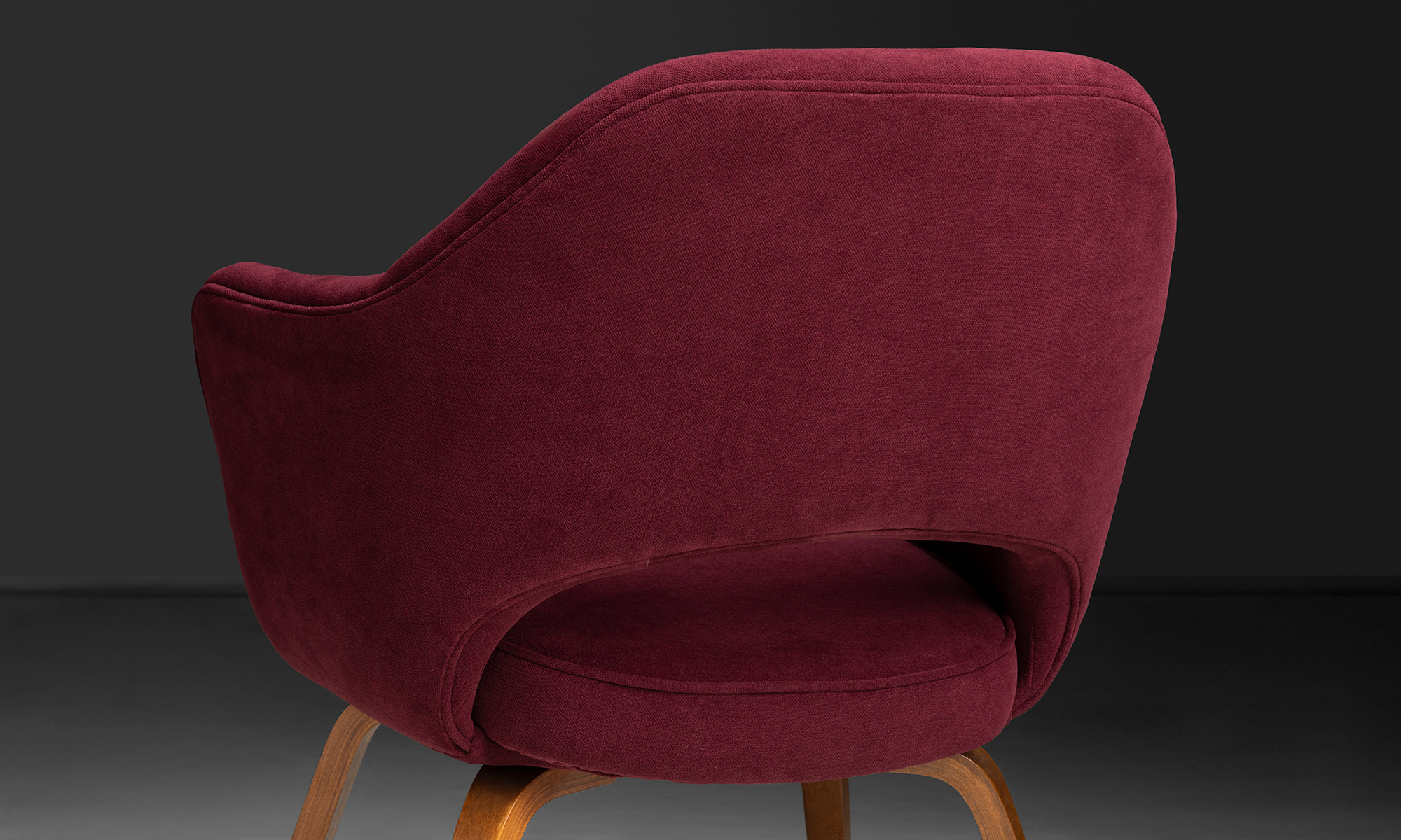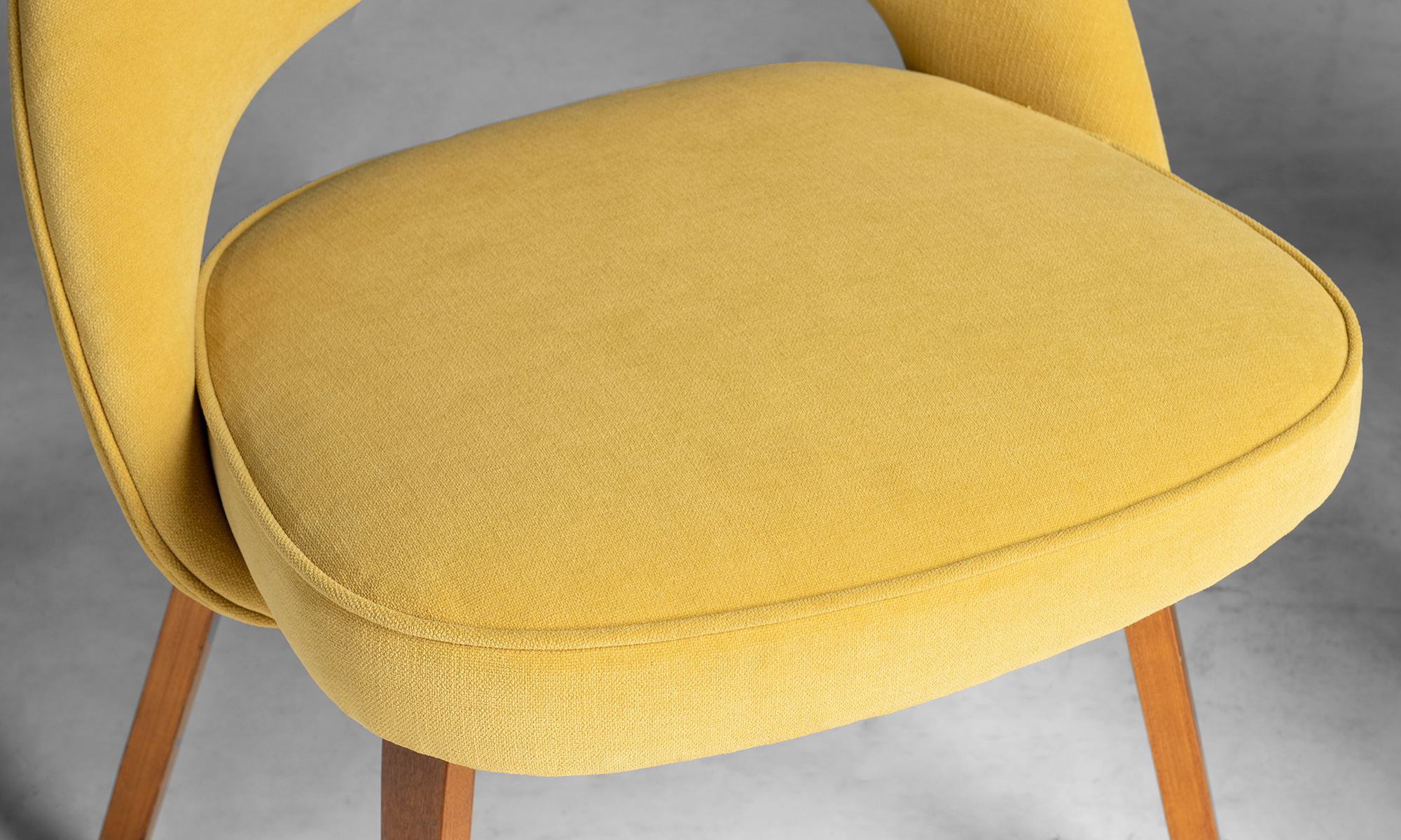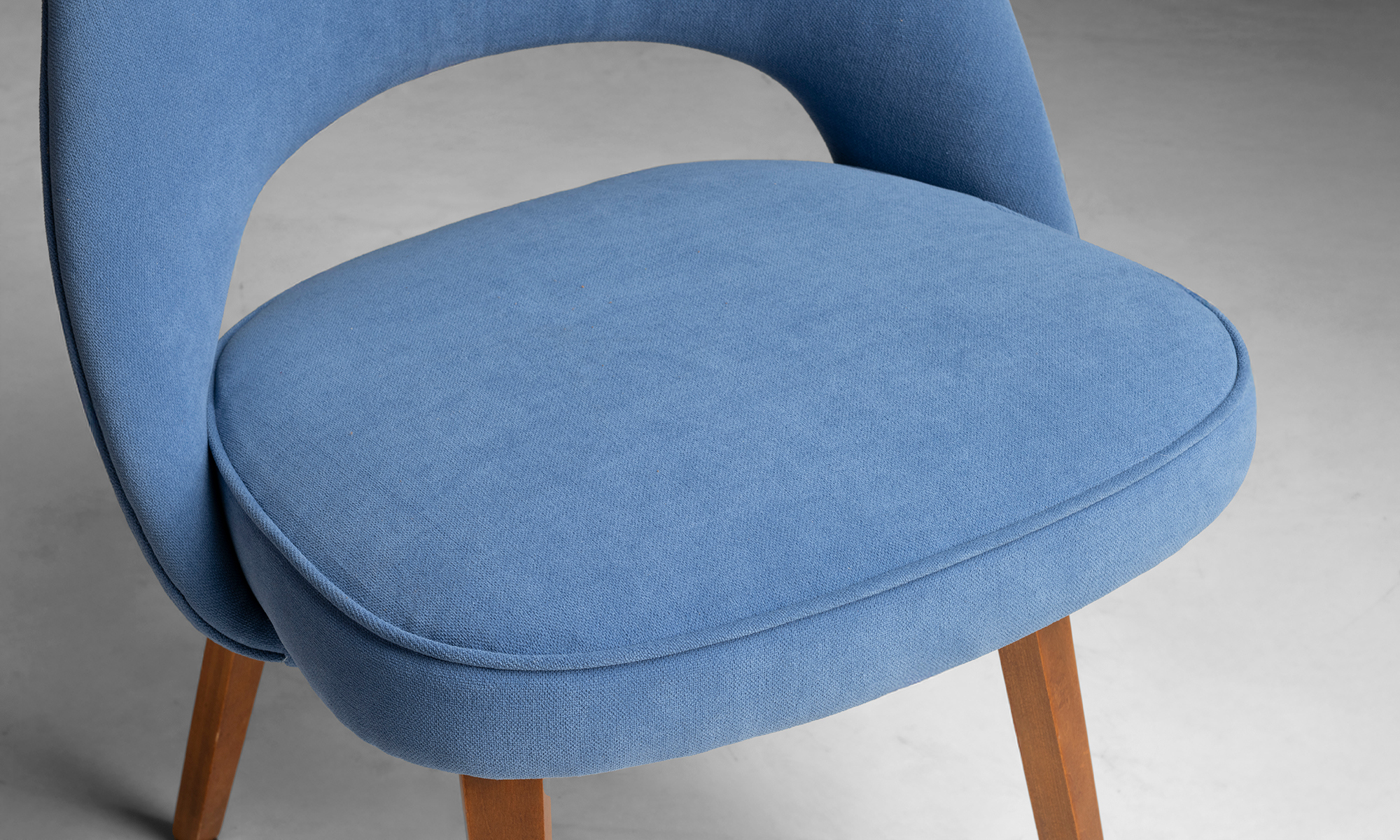 Walnut plywood legs, newly upholstered in Knoll fabric. 2 with arms, 4 without arms.