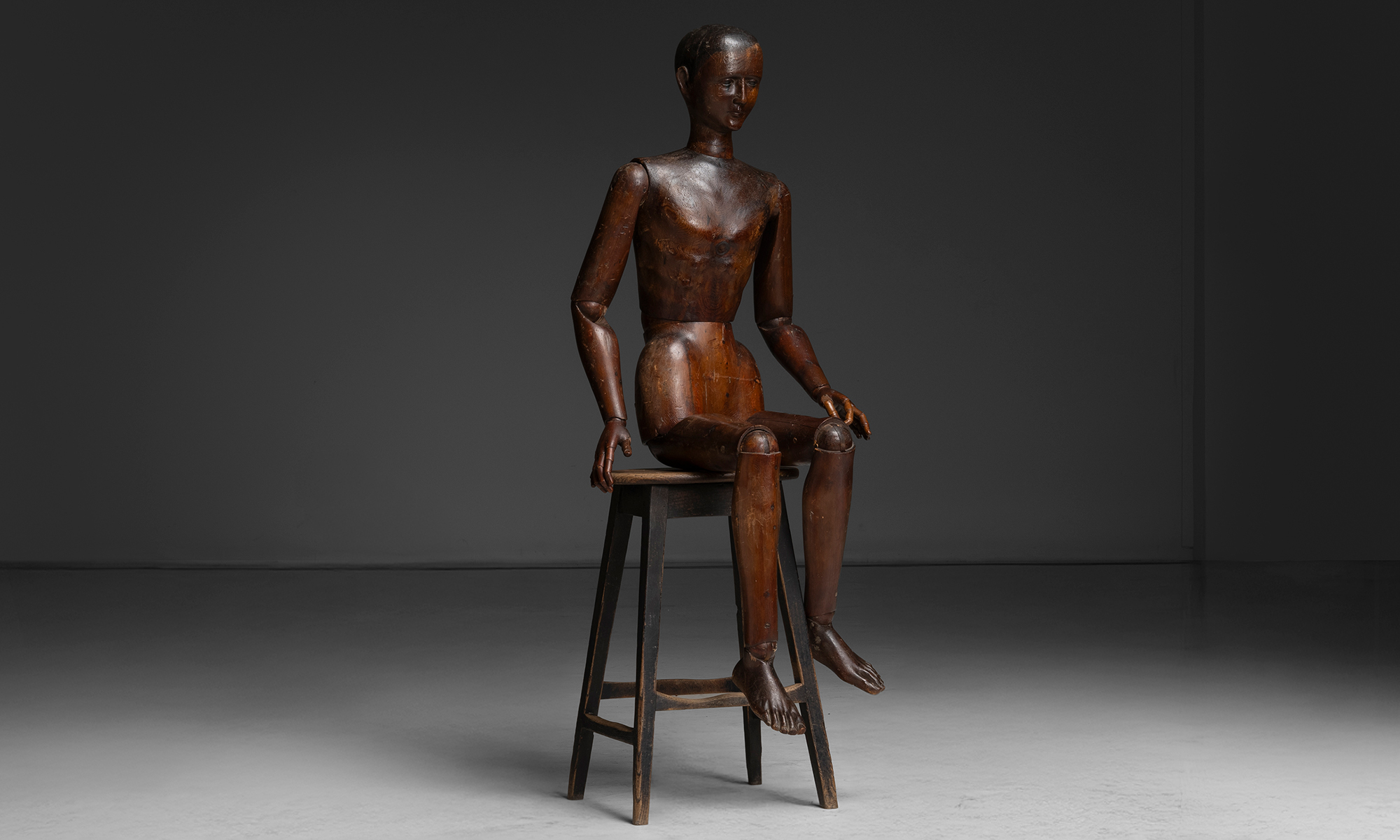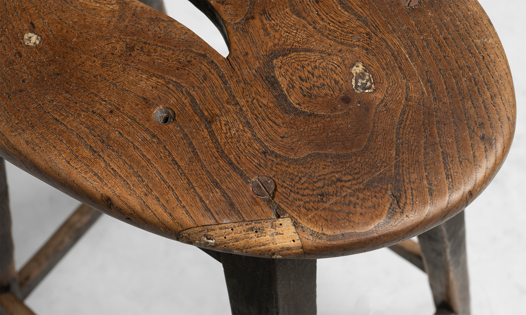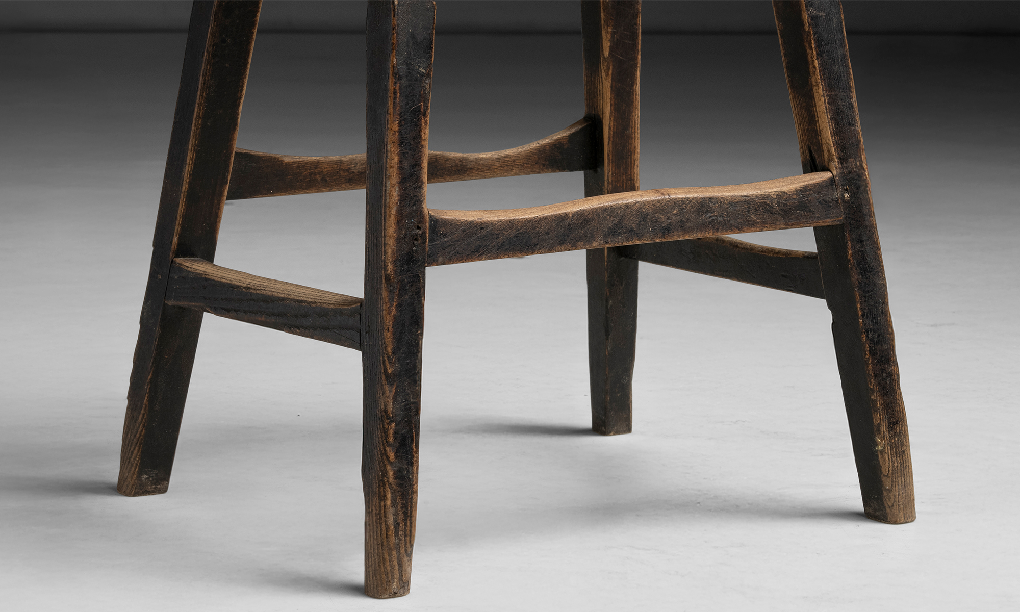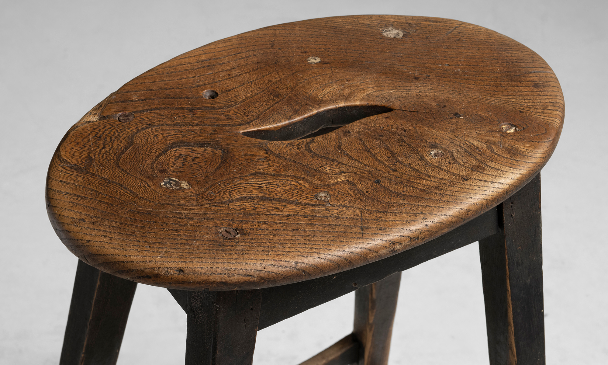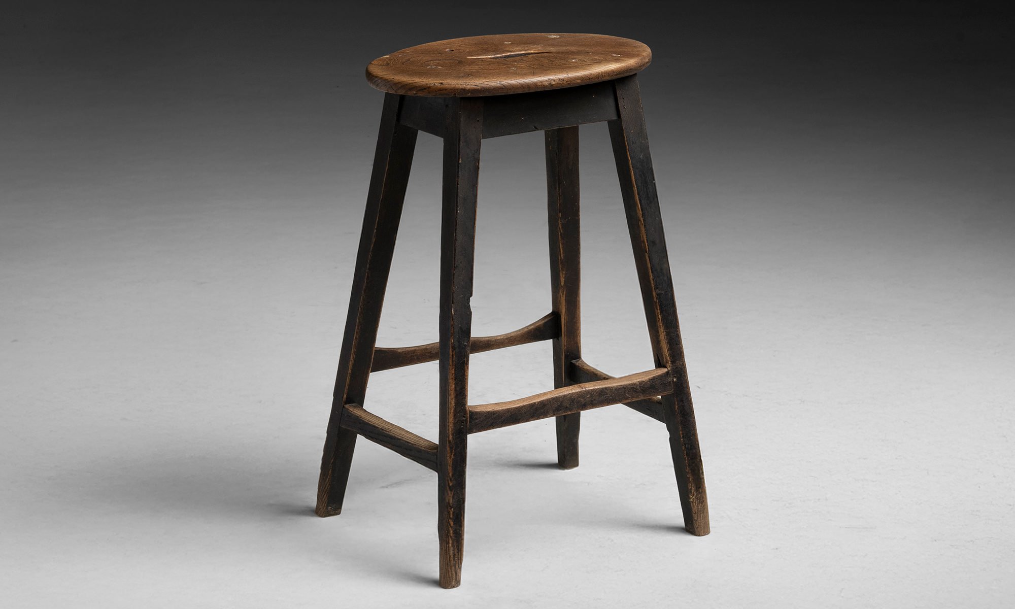 Simple country stool with oval elm seat, splayed legs, and worn black finish.