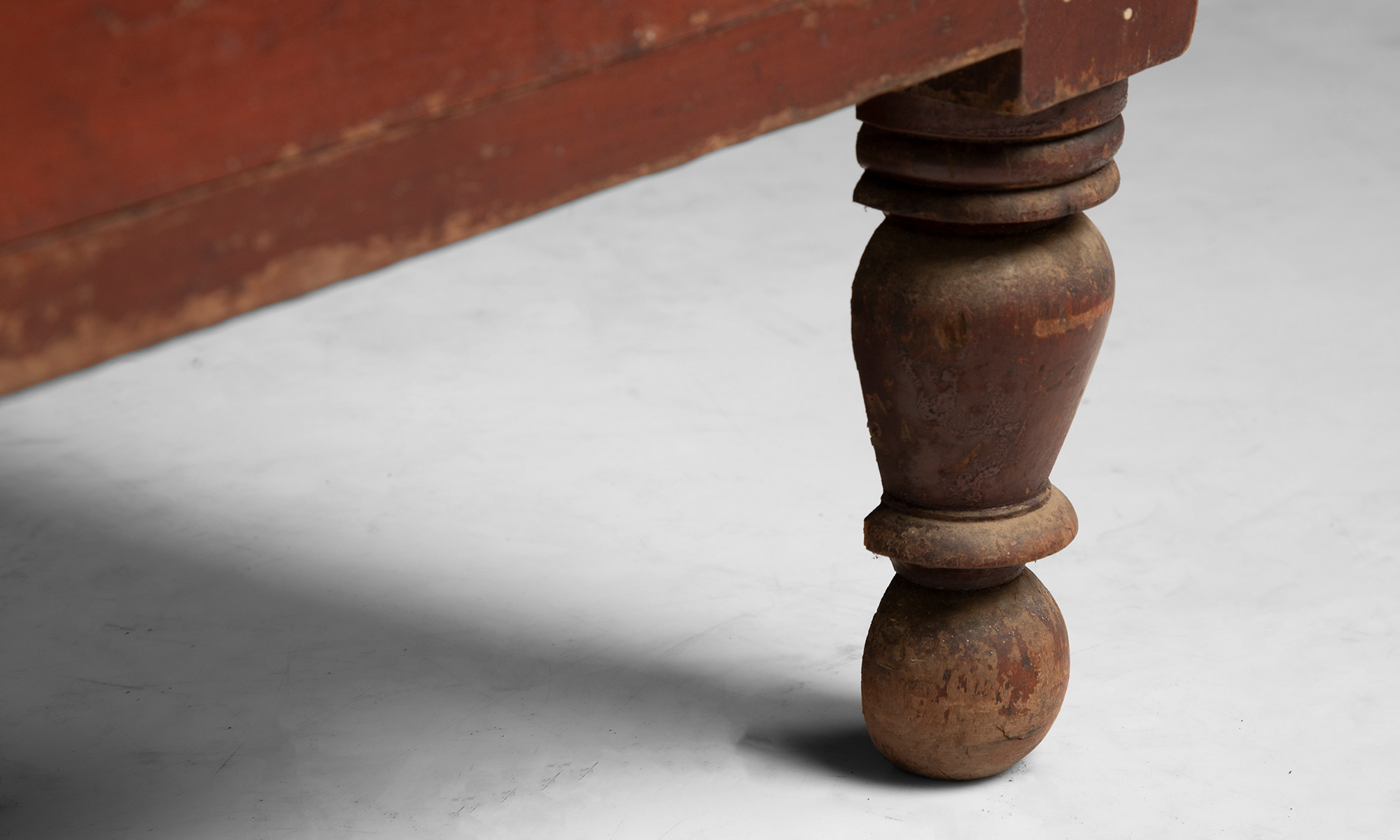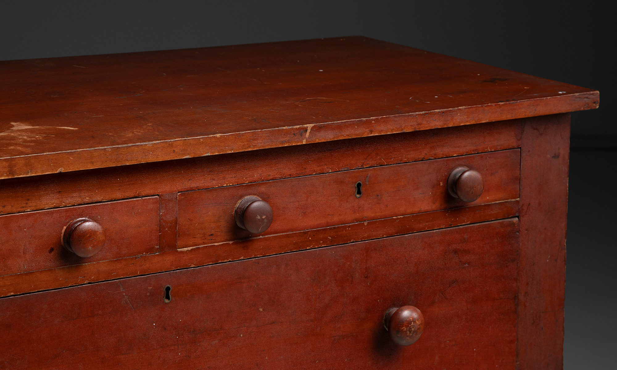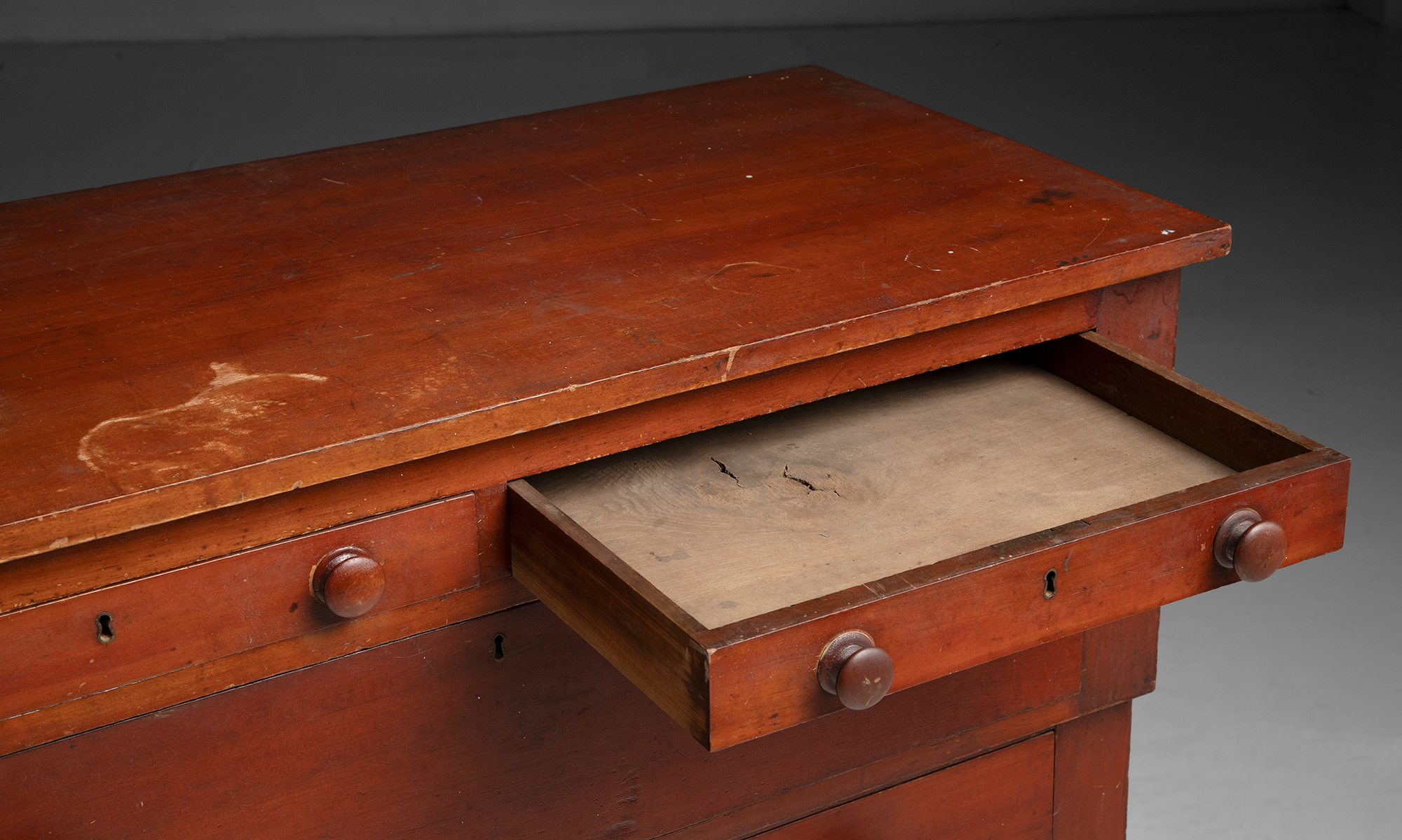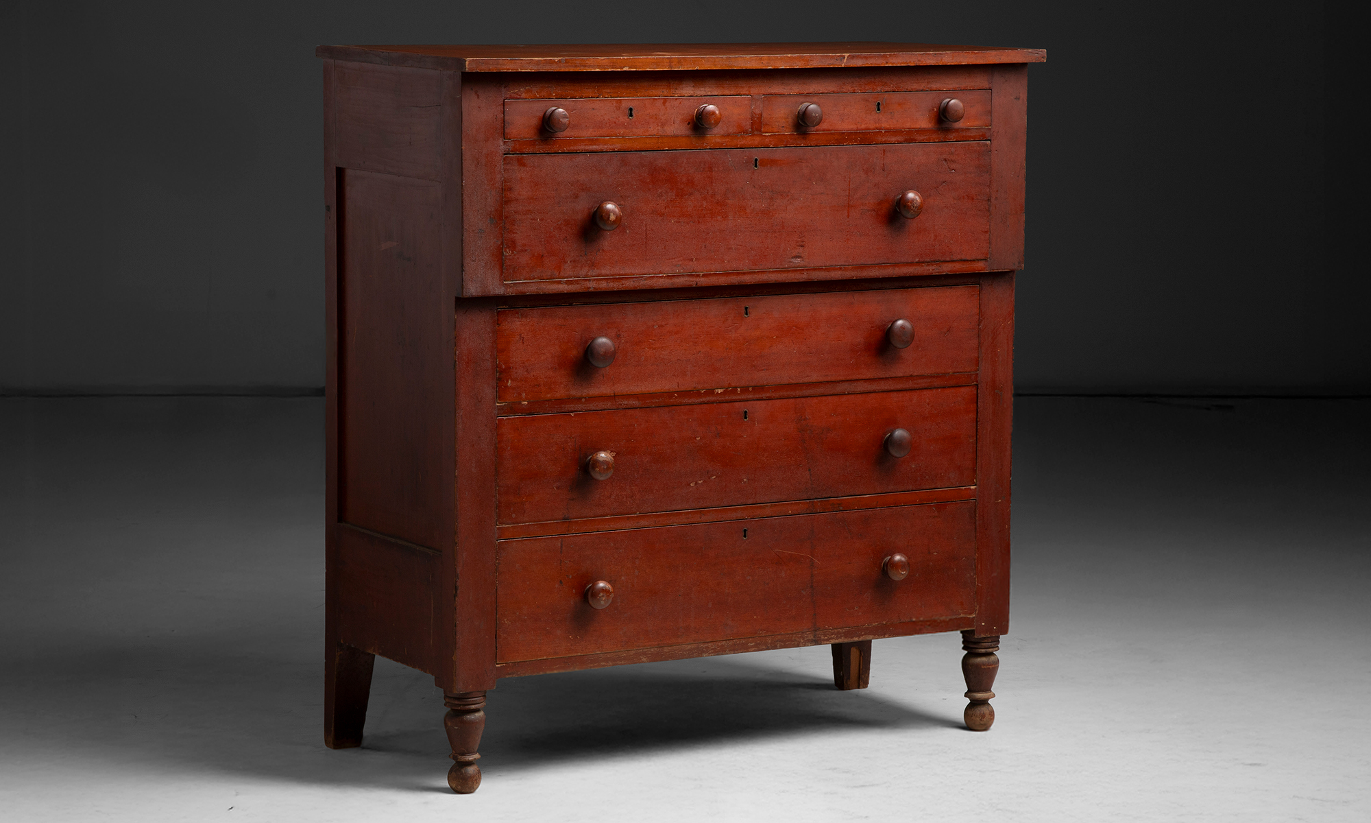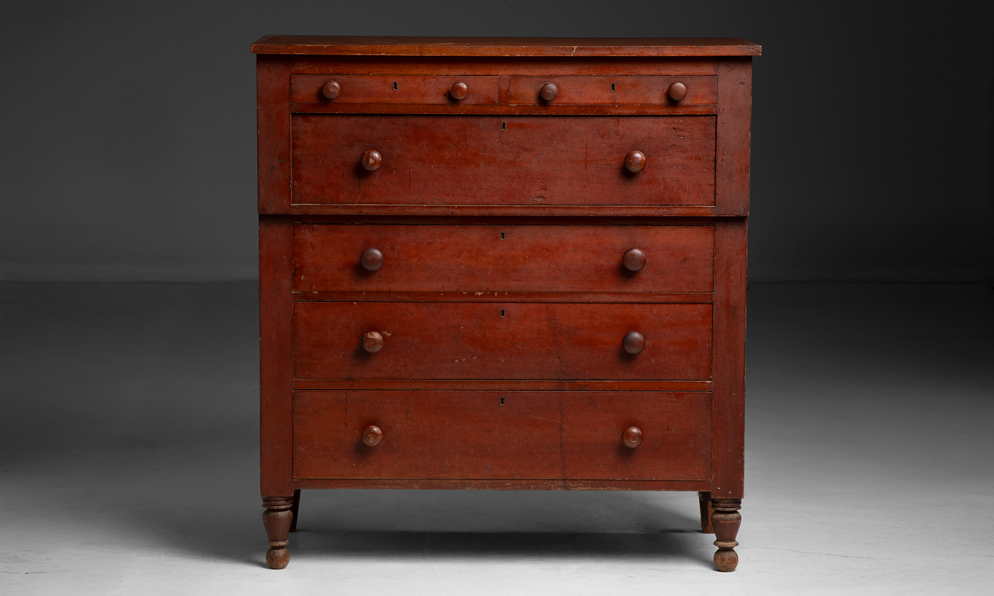 Cherry with poplar secondary. Paneled ends, two over four dovetailed drawers, turned front legs, and having old if not original finish.