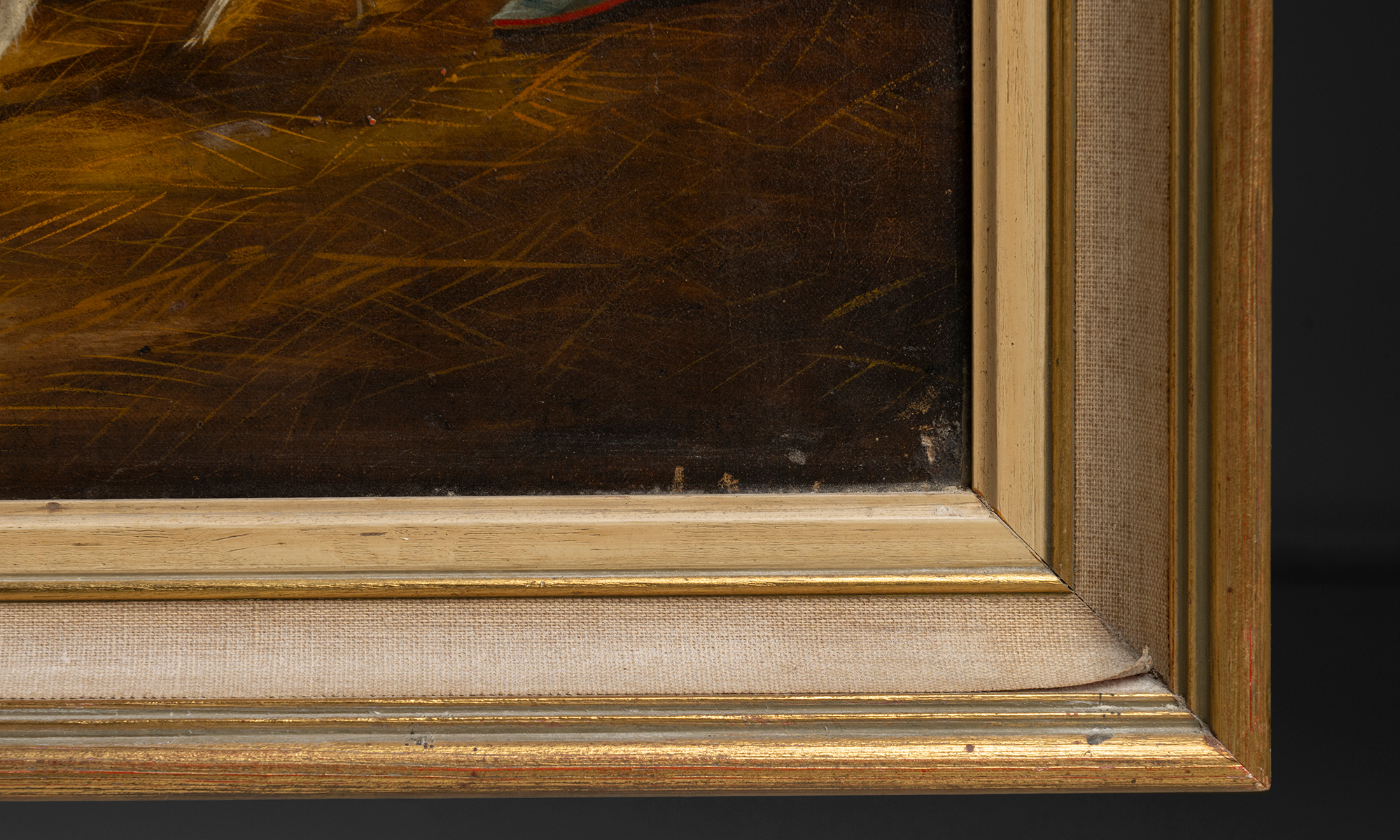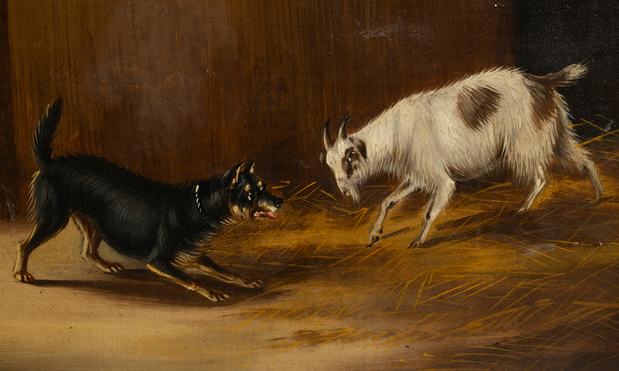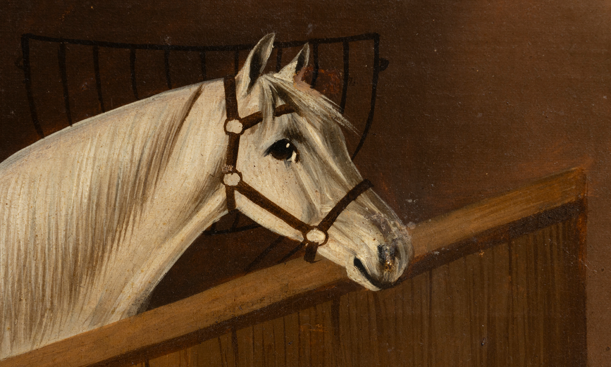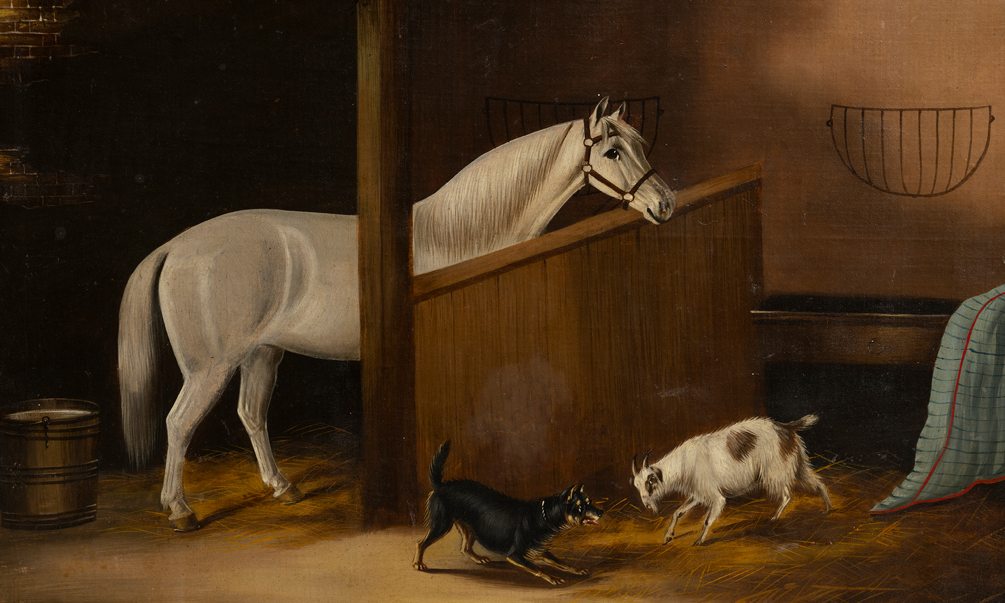 Oil on canvas of a grey horse with dogs and goat.