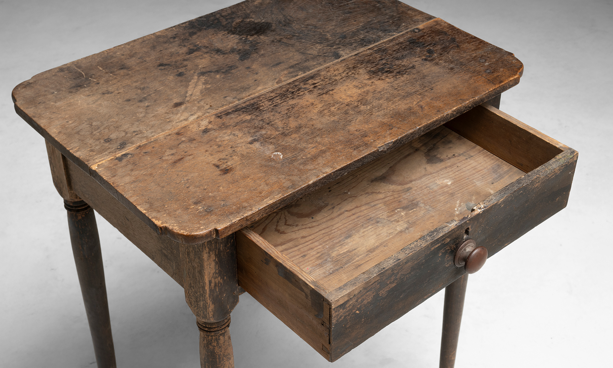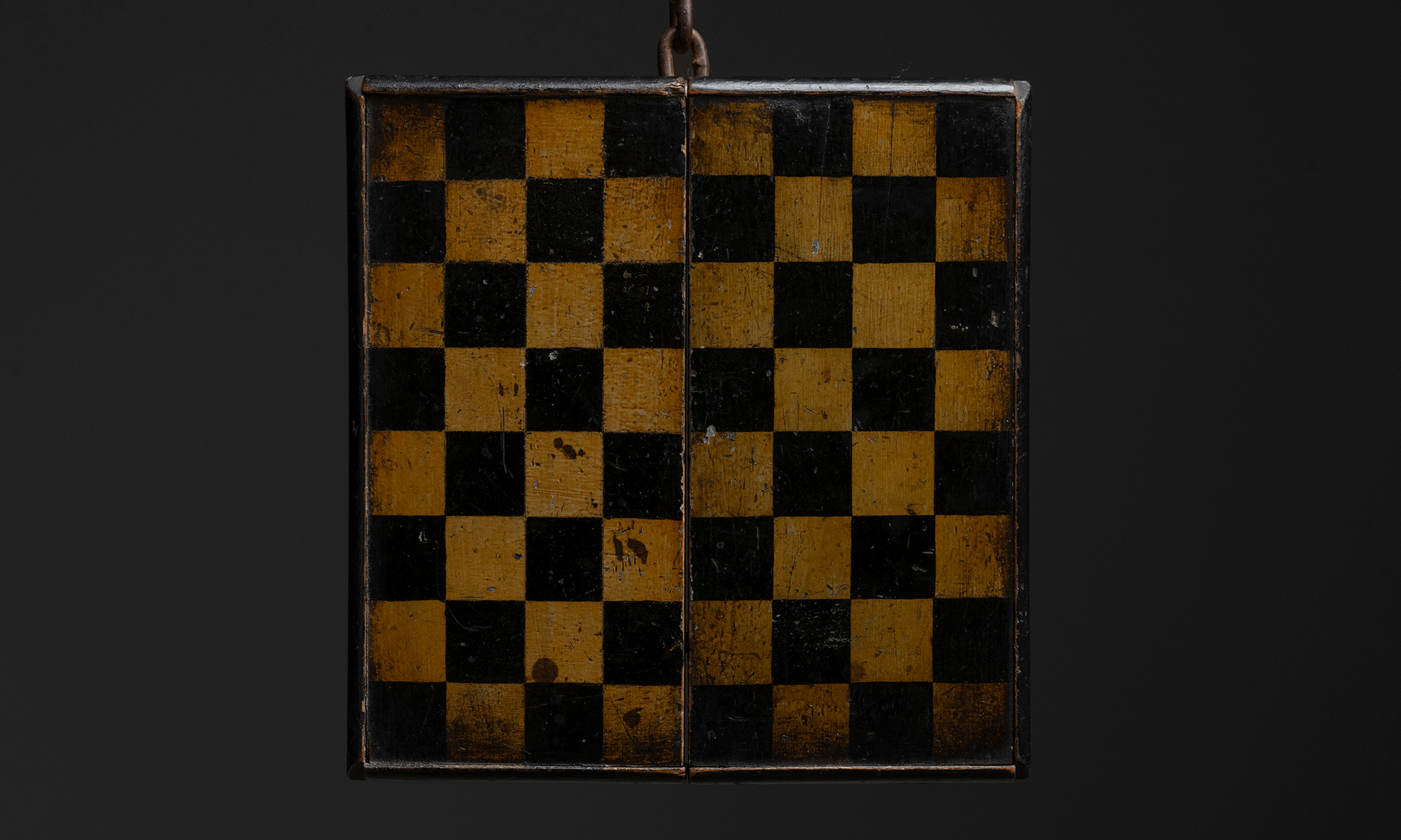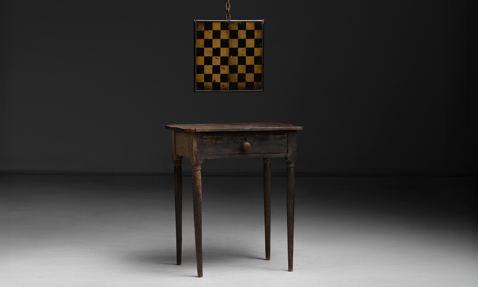 Folk art folding game board with black and yellow checkerboard and applied edge molding. Chess and checker pieces included. Walnut side table with two-board top and single full drawer, shaped corners and turned legs.