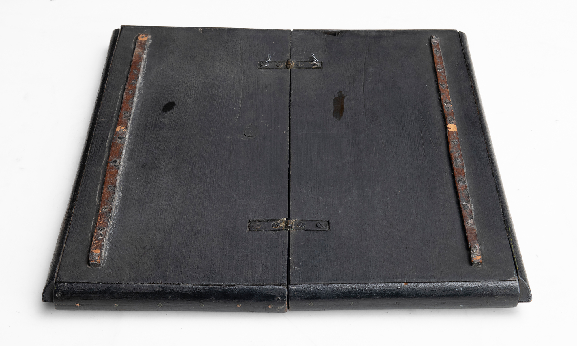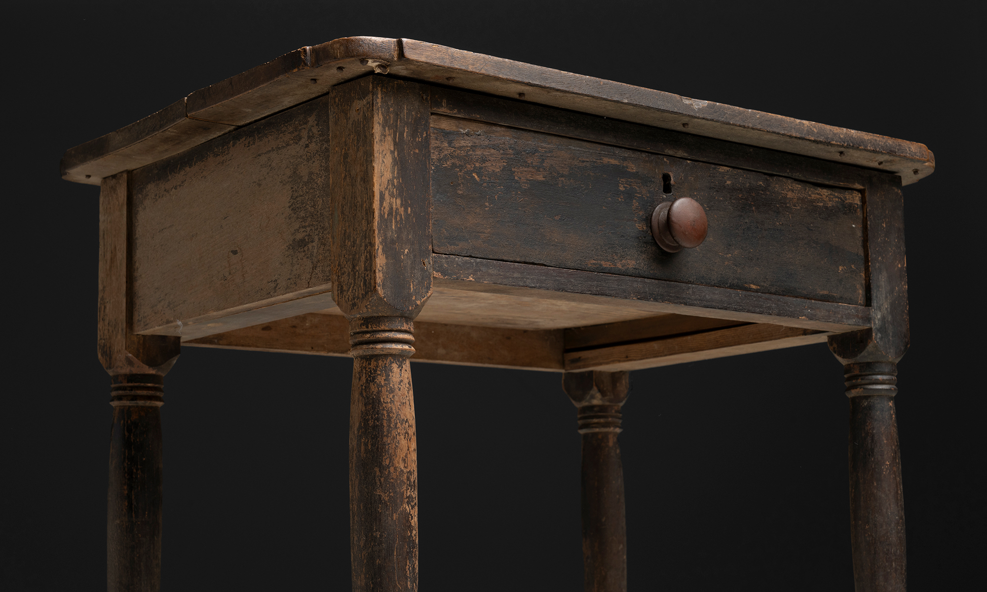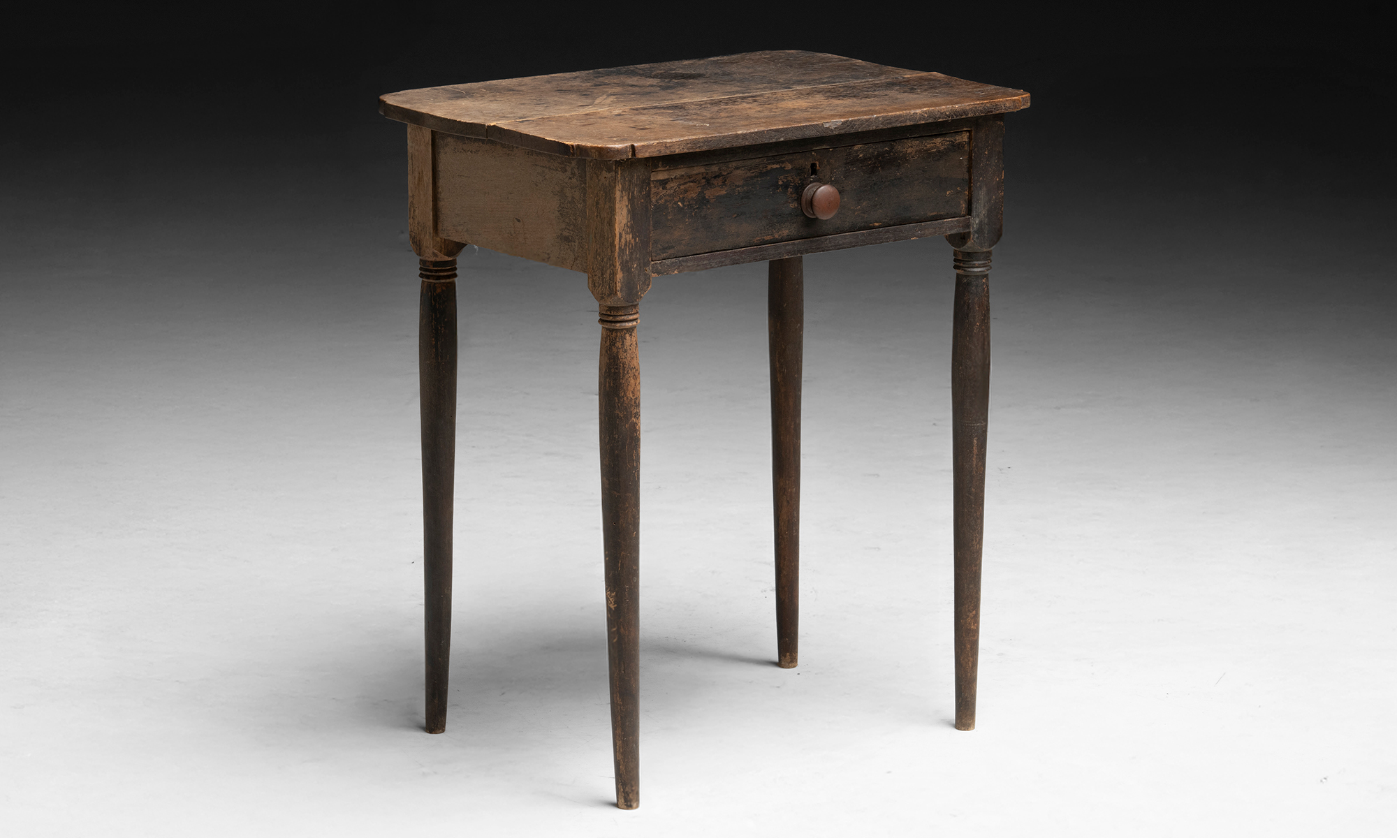 Folk art folding game board with black and yellow checkerboard and applied edge molding. Chess and checker pieces included. Walnut side table with two-board top and single full drawer, shaped corners and turned legs.