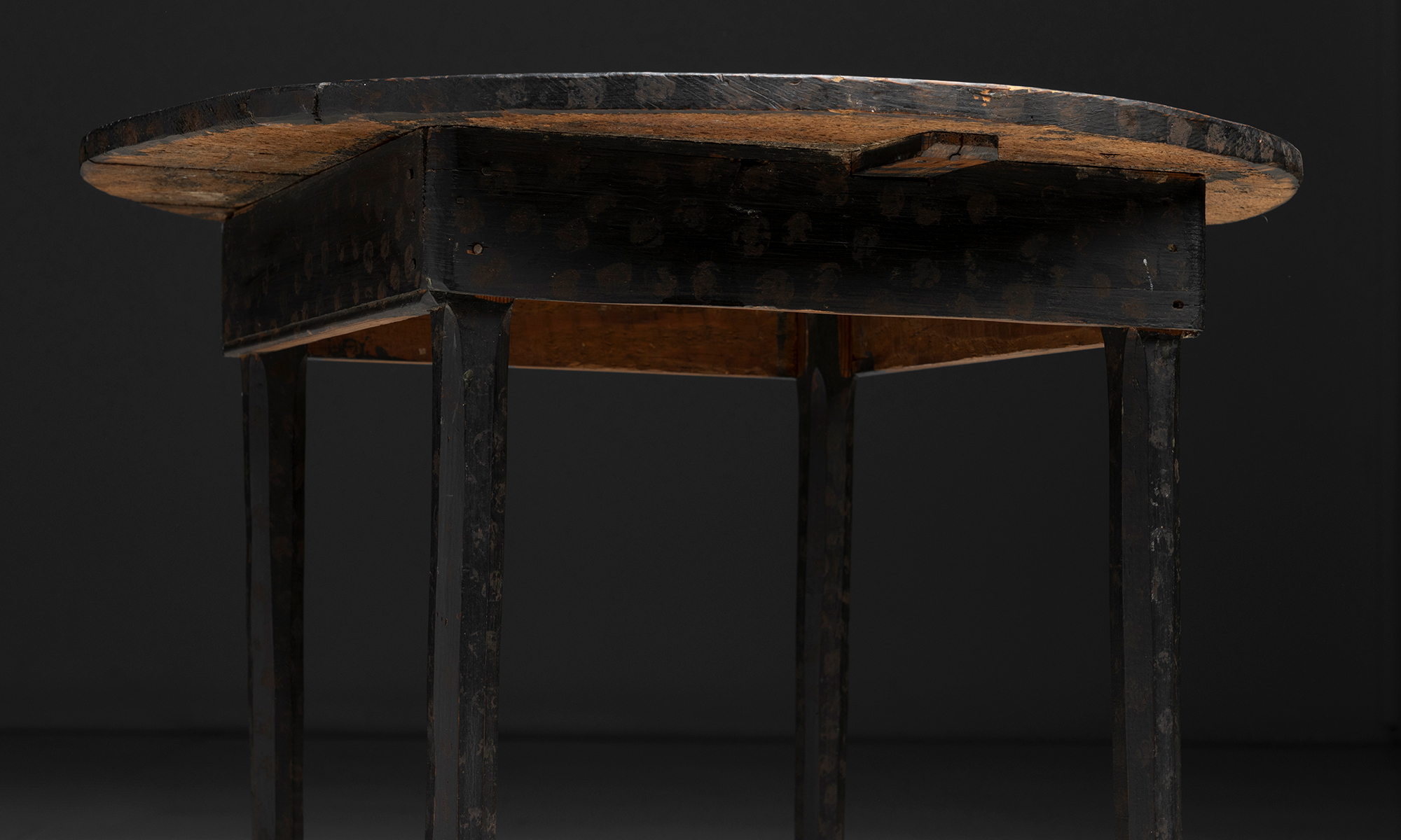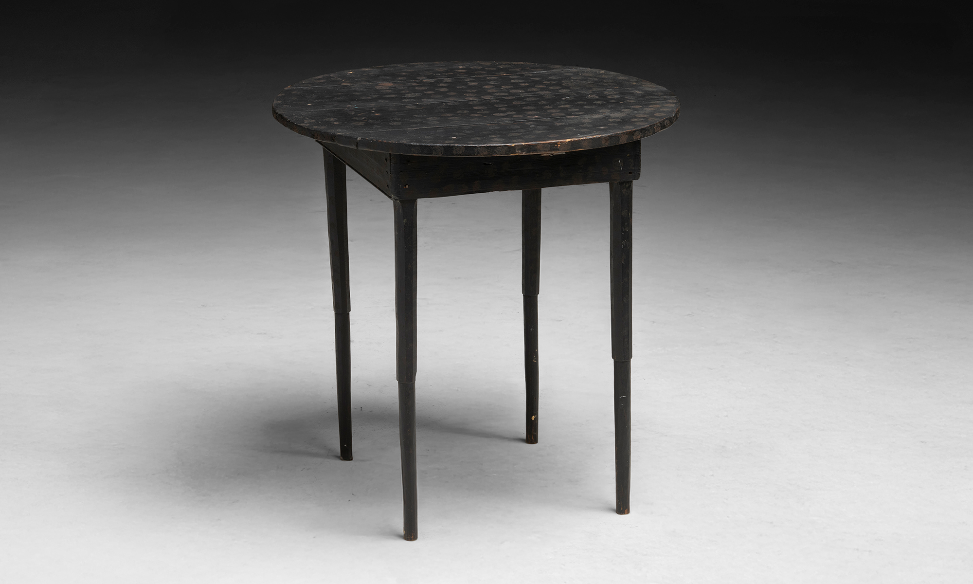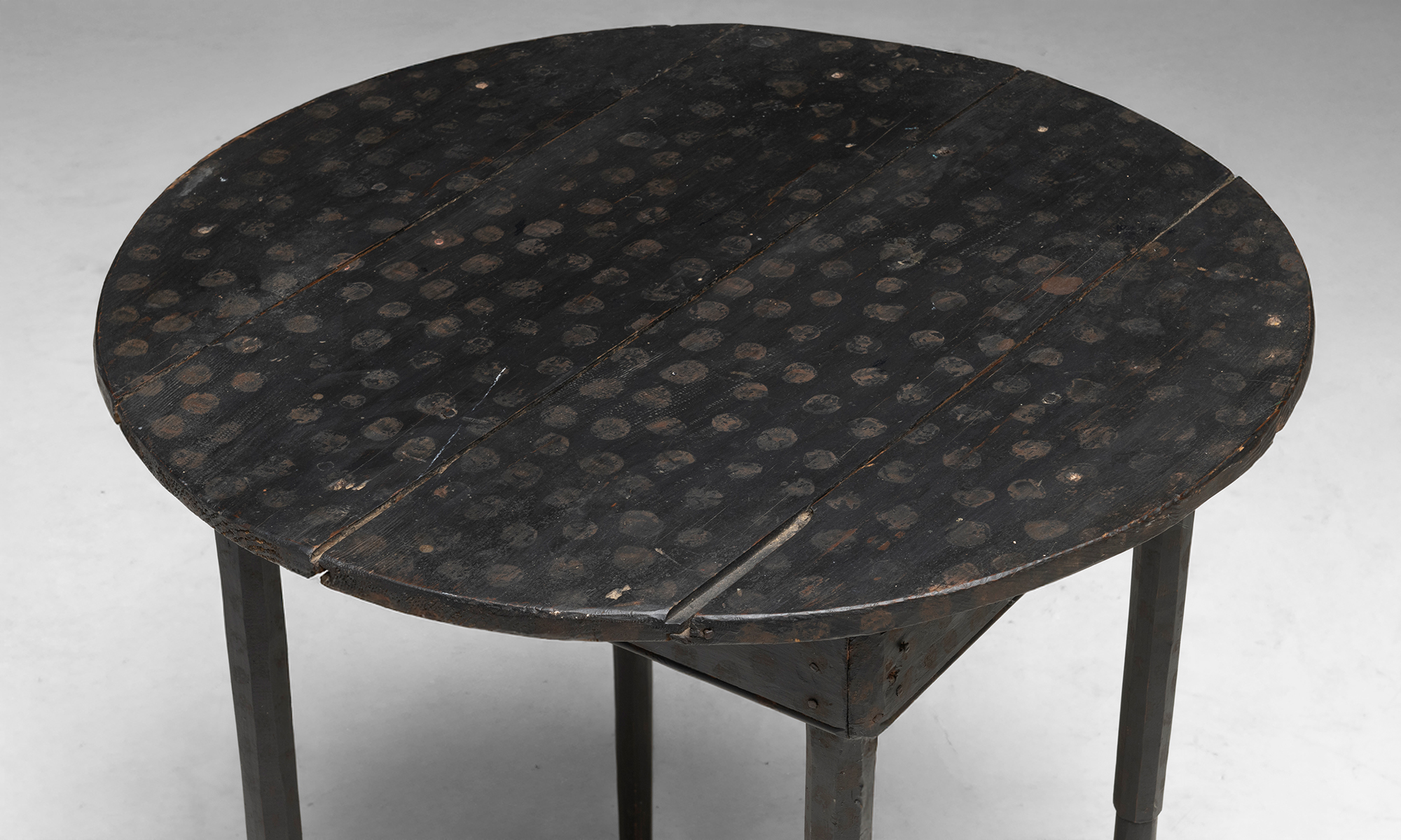 Folding gameboard with checker board to exterior and backgammon to inside. Decorated in black, red and blue paint. Pine side table with fine turned and chamfered legs and paint-decorated dots over the surface.