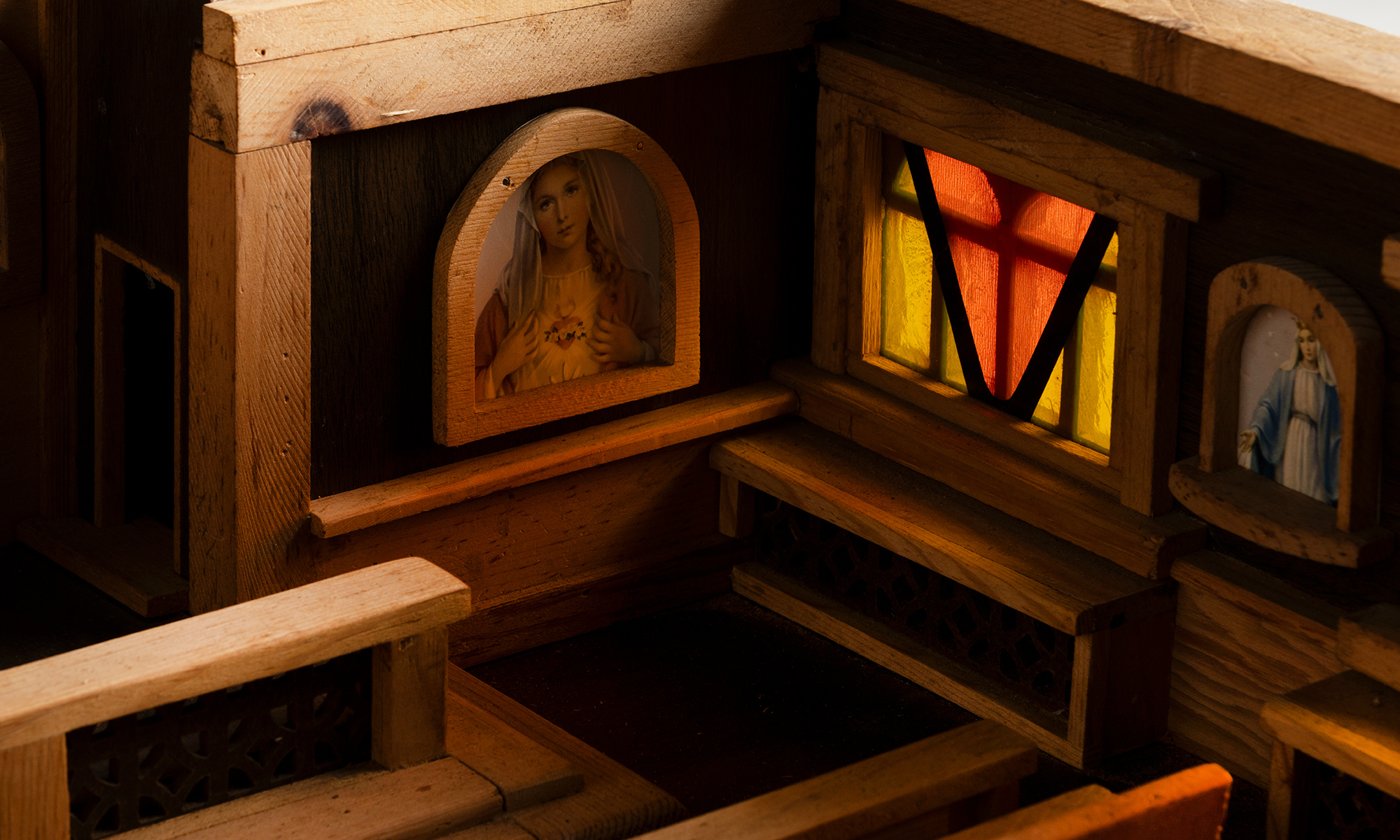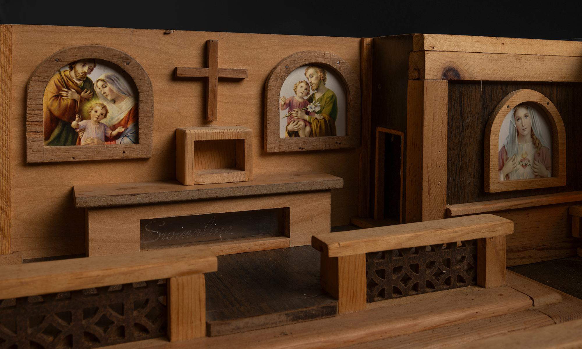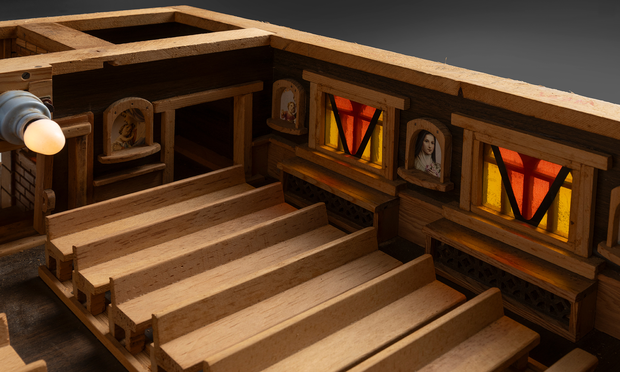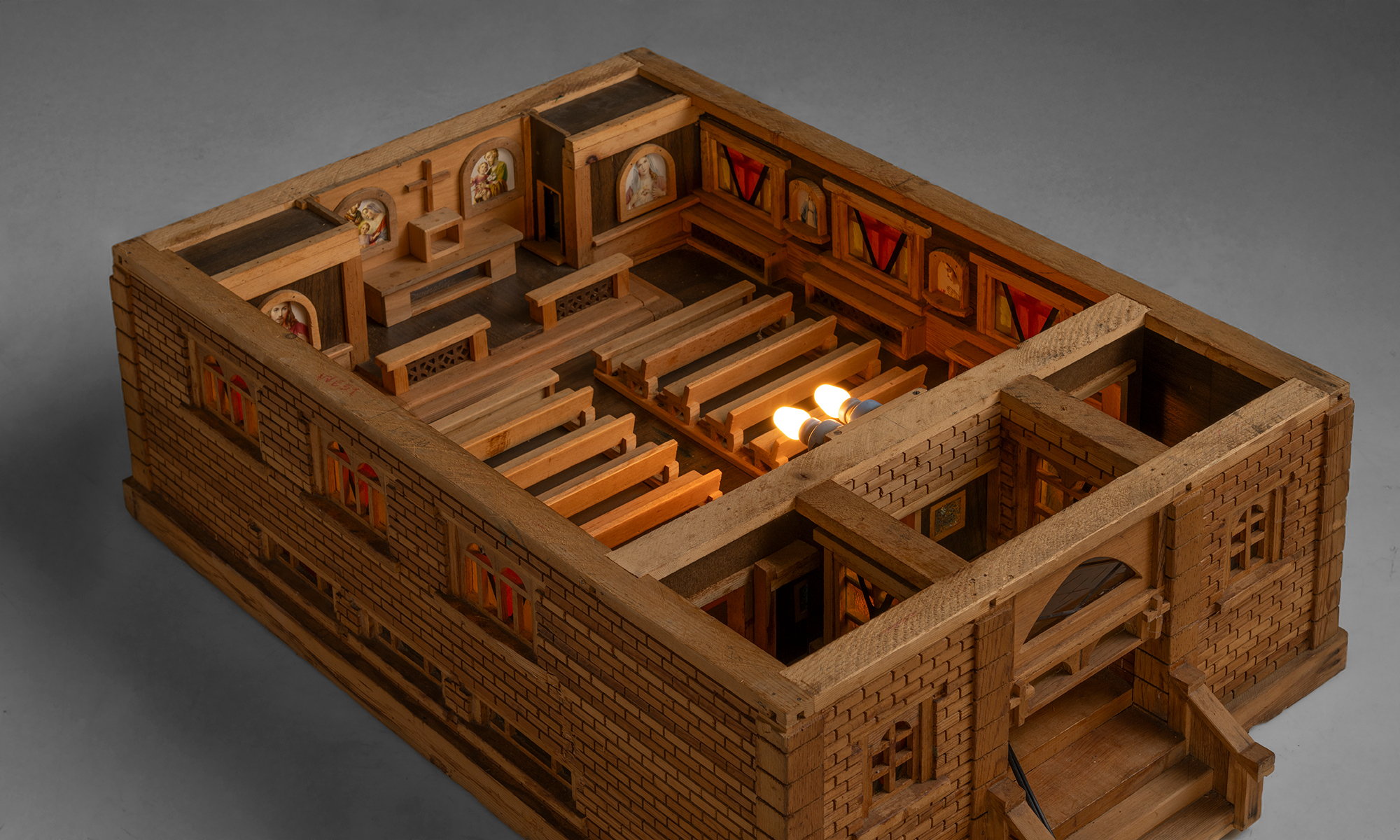 Built entirely from wood, the model showcases exceptional attention to architectural detail, including carved roof shingles, brickwork-style wall textures, and miniature window trims. The interior reveals a fully realized sanctuary, complete with wooden pews, altar, and pulpit. The walls are adorned with paper iconography of Christian saints and figures, with faux stained glass windows.