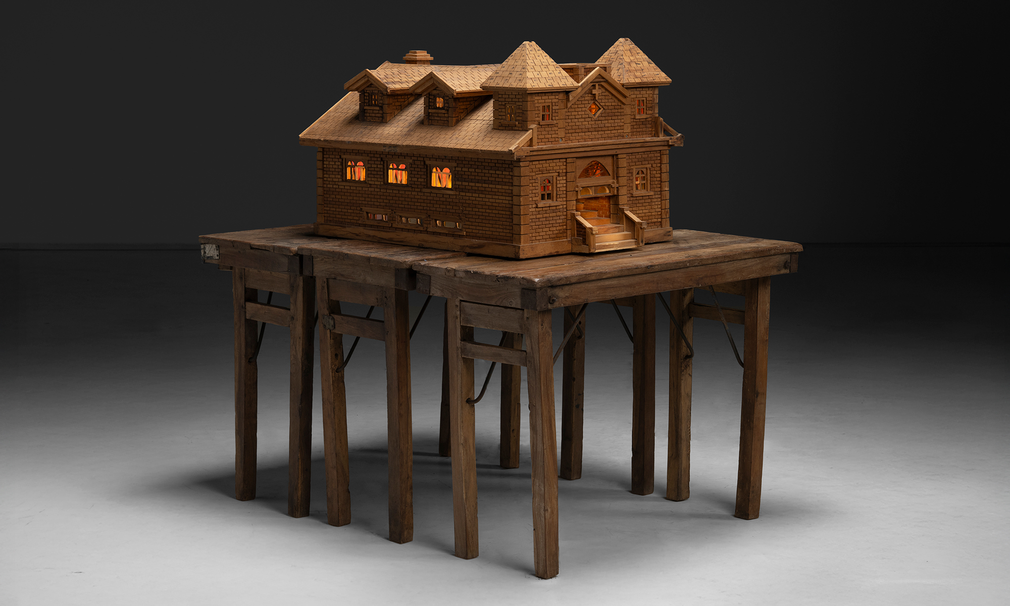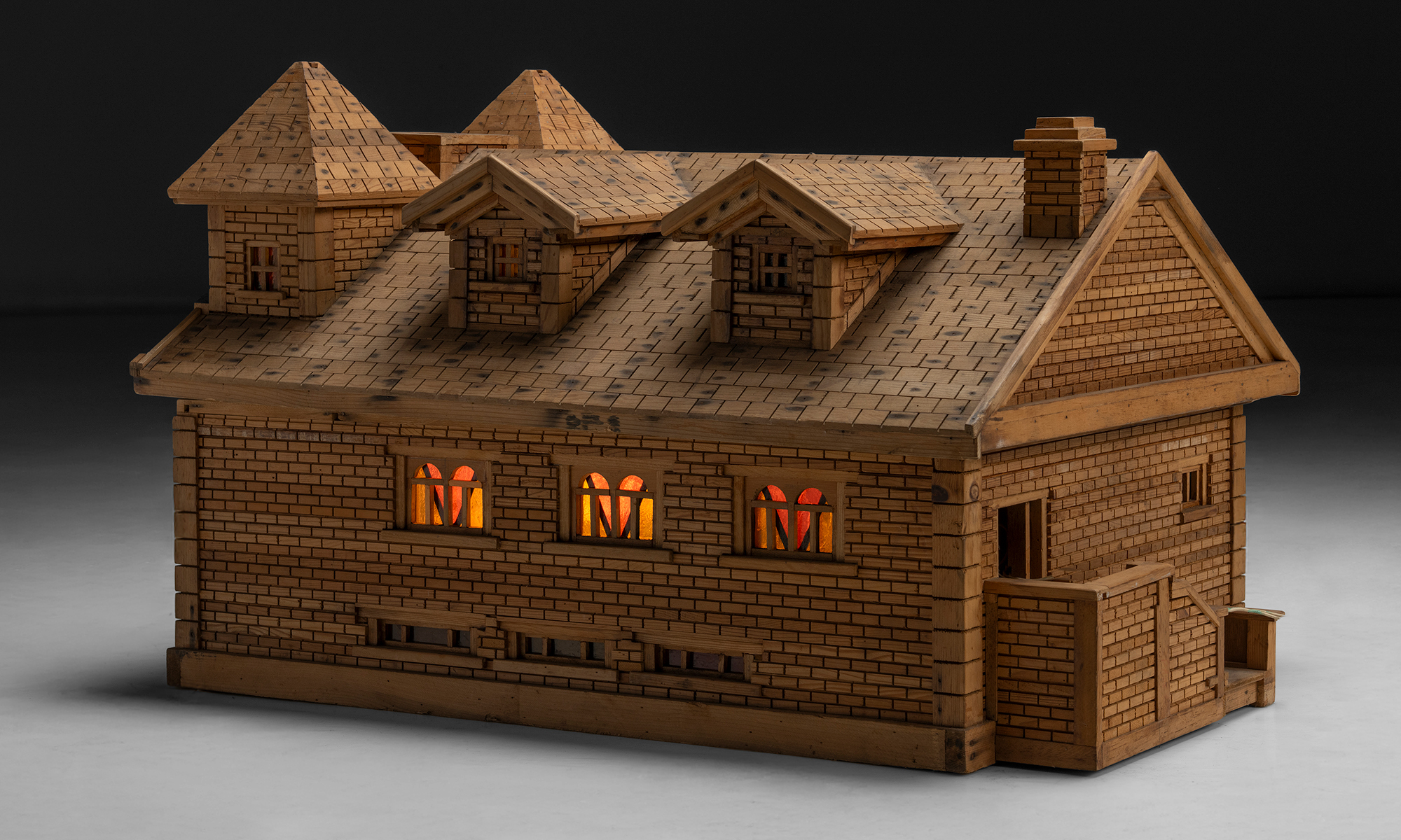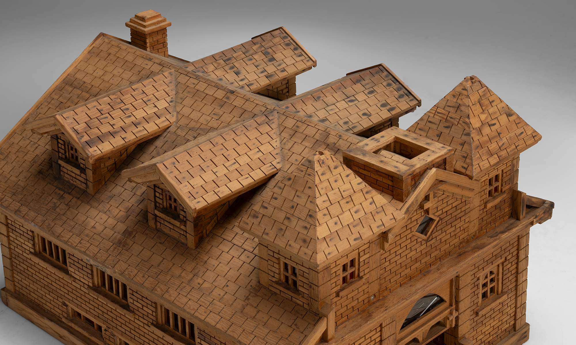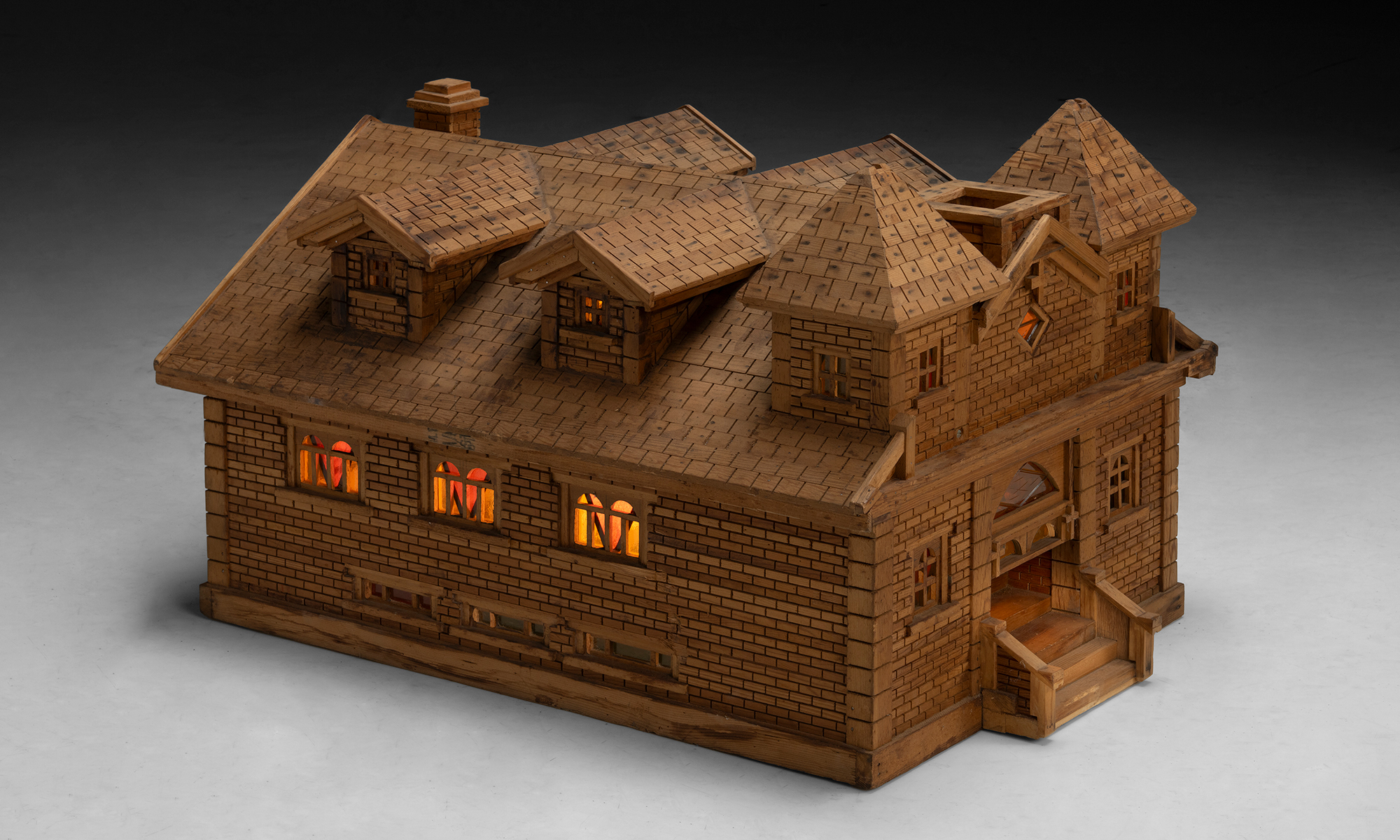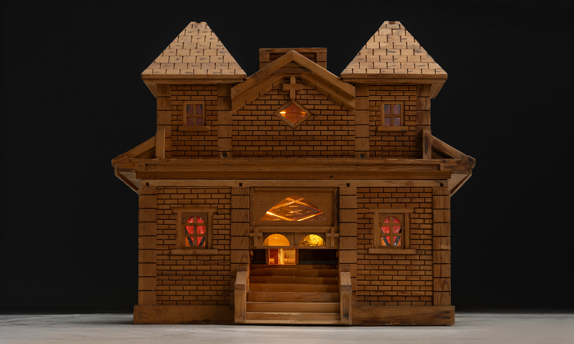Built entirely from wood, the model showcases exceptional attention to architectural detail, including carved roof shingles, brickwork-style wall textures, and miniature window trims. The interior reveals a fully realized sanctuary, complete with wooden pews, altar, and pulpit. The walls are adorned with paper iconography of Christian saints and figures, with faux stained glass windows.