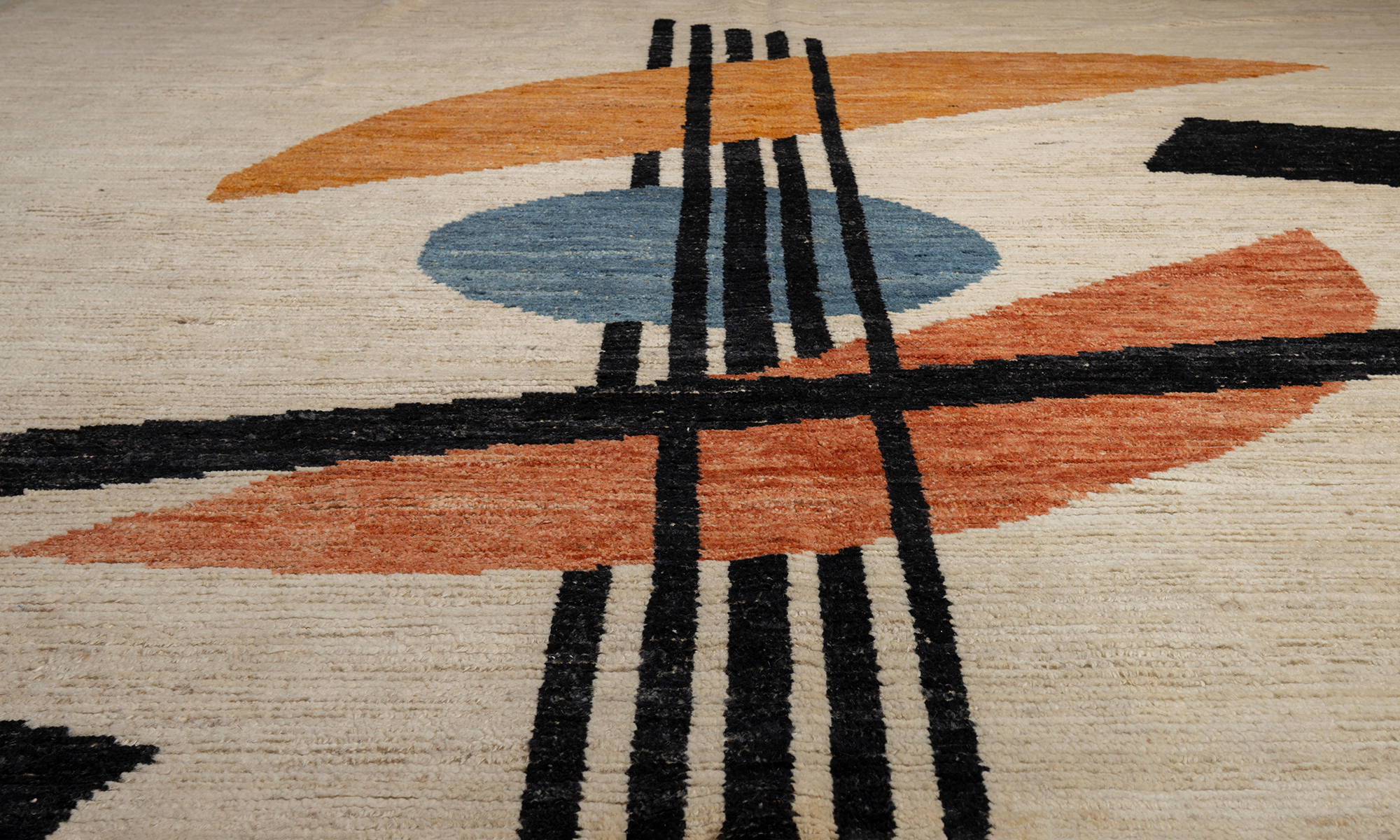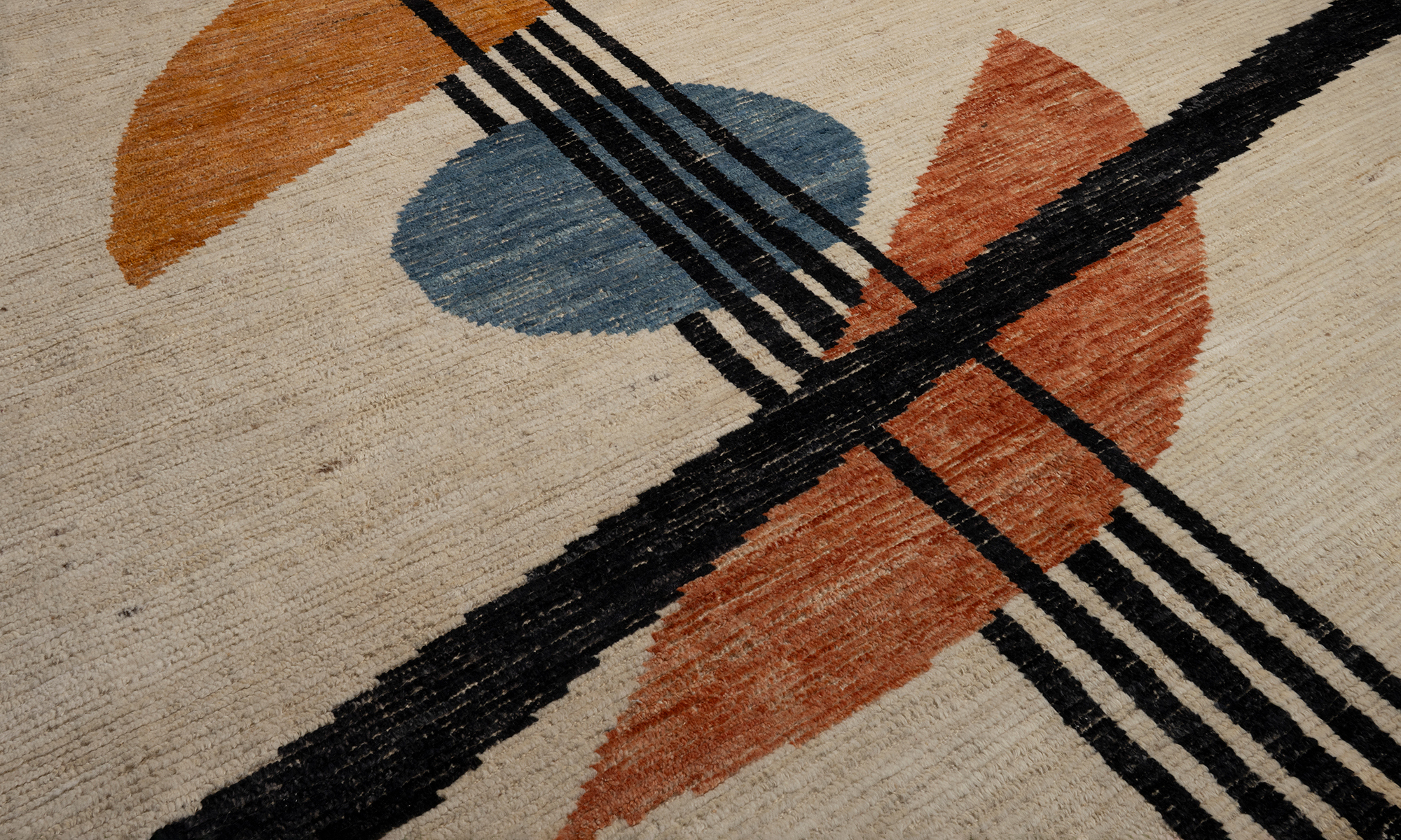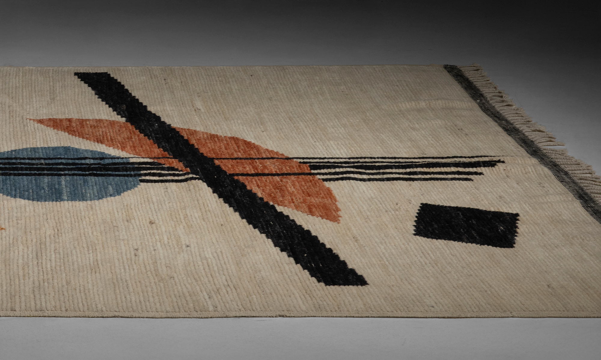 Low pile rug with abstract geometric design.