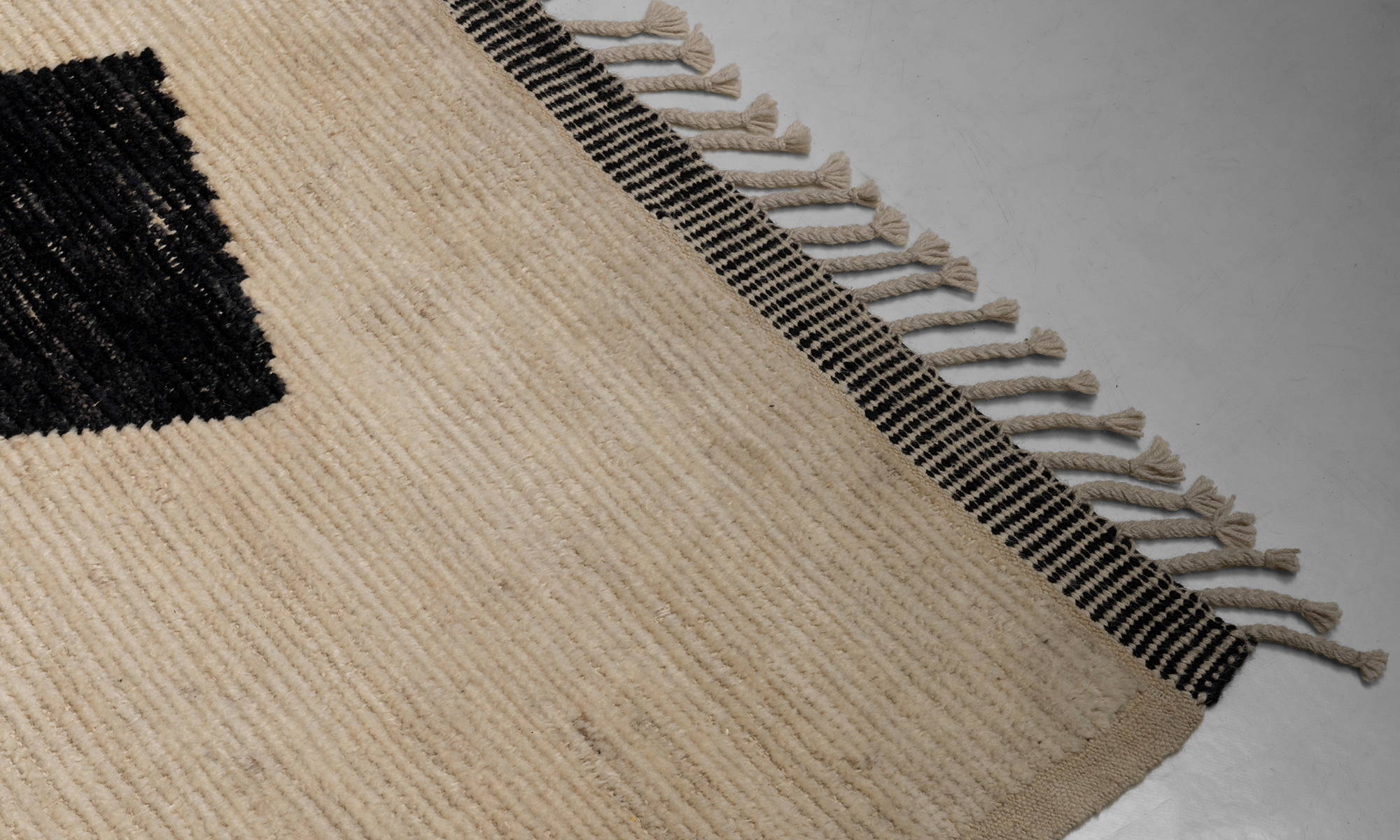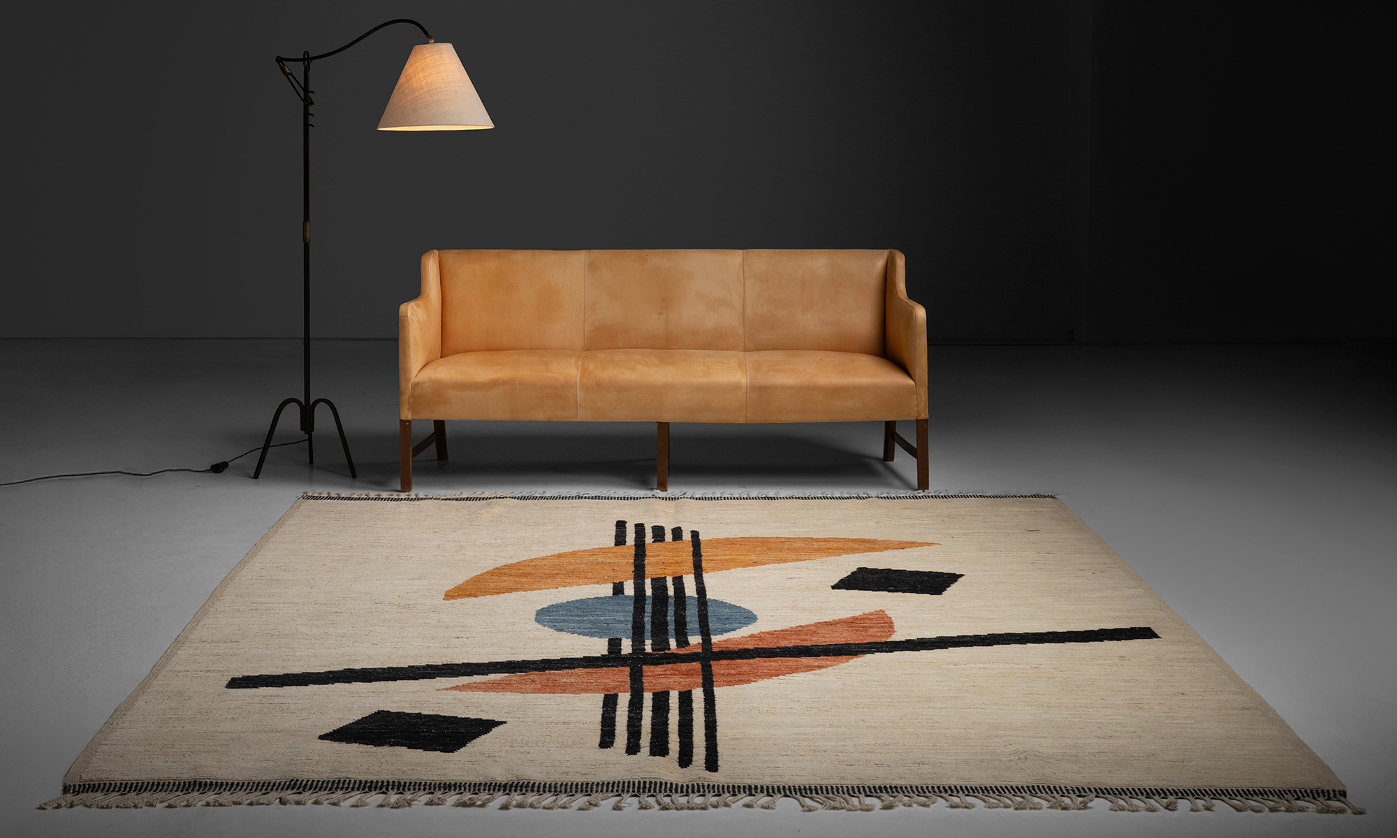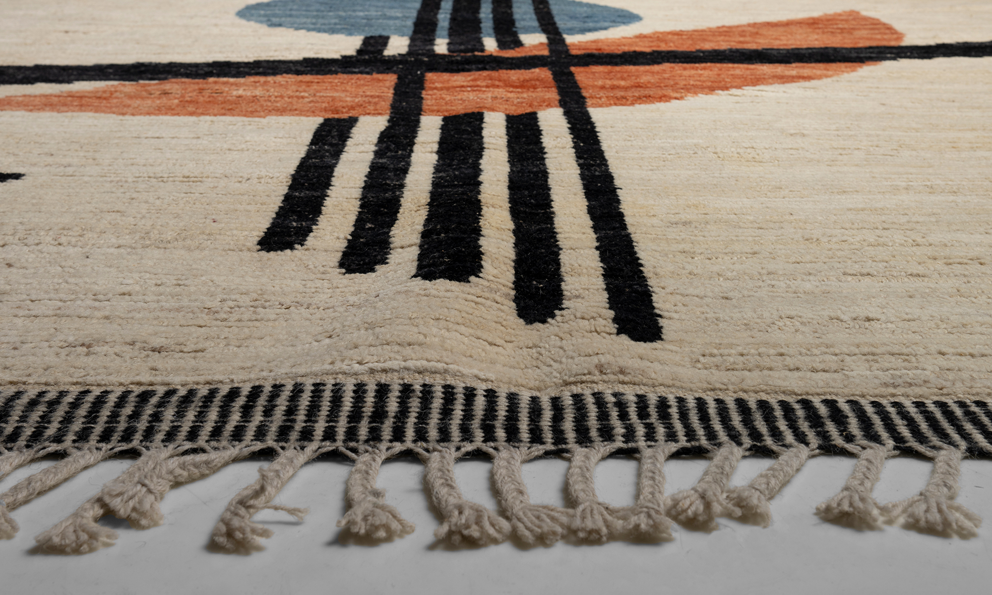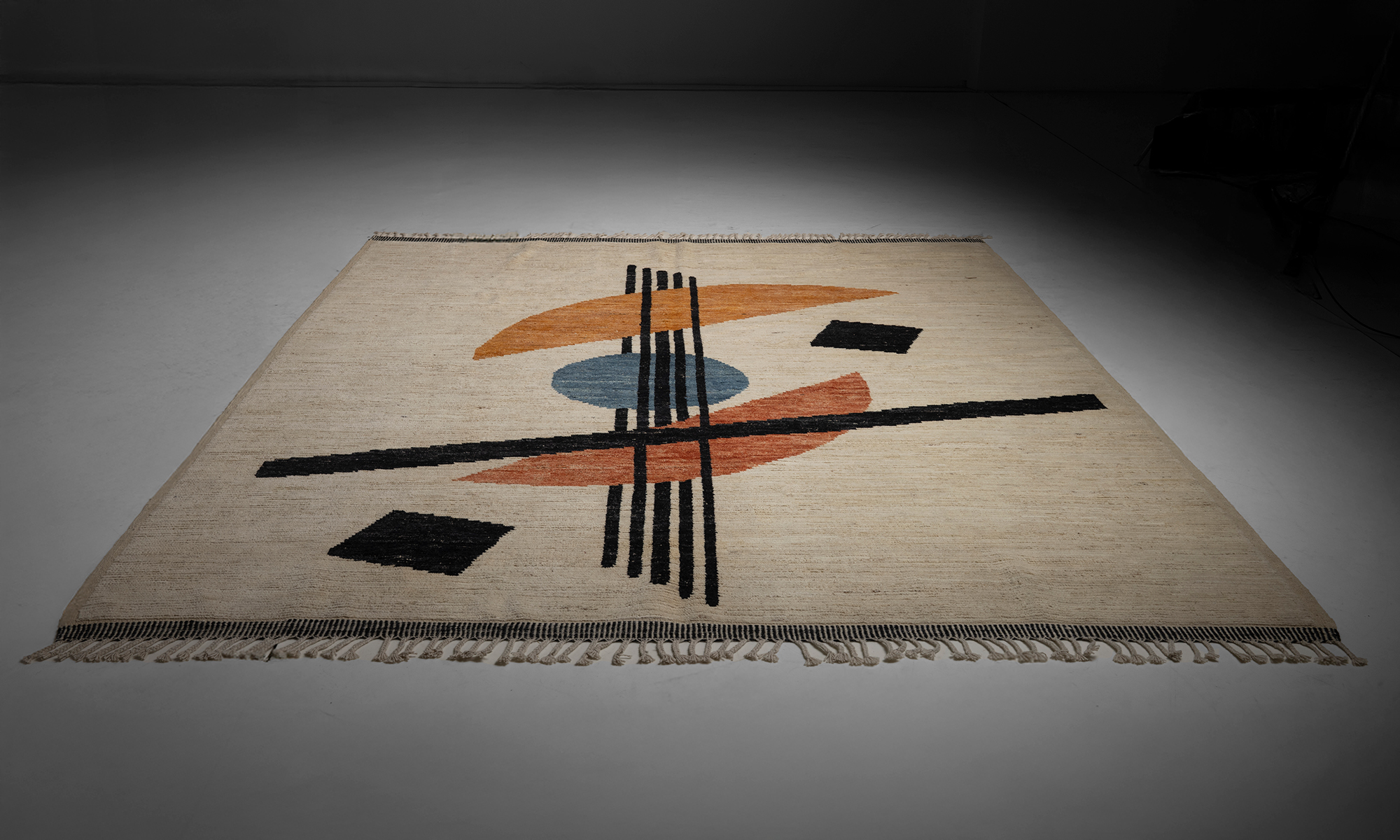 Low pile rug with abstract geometric design.