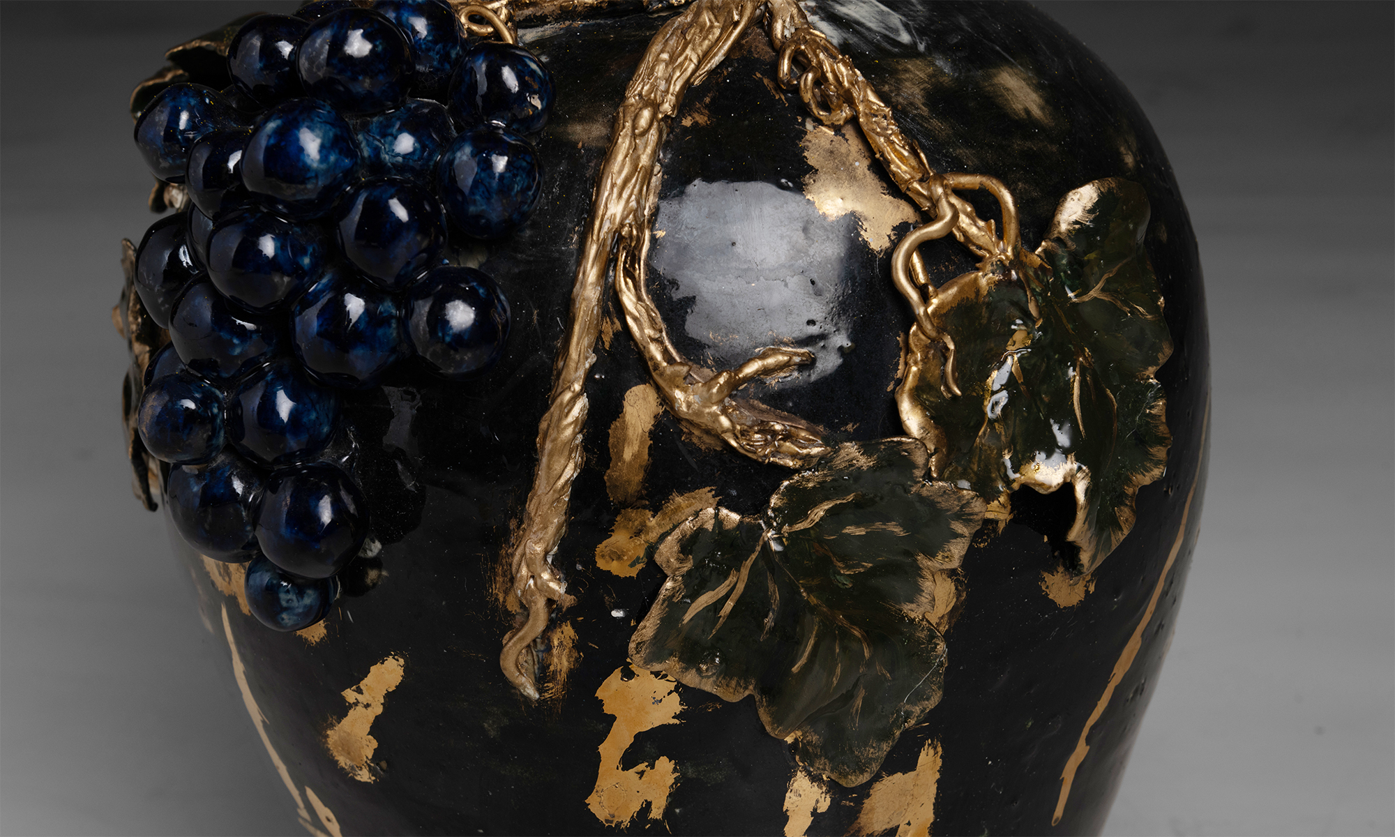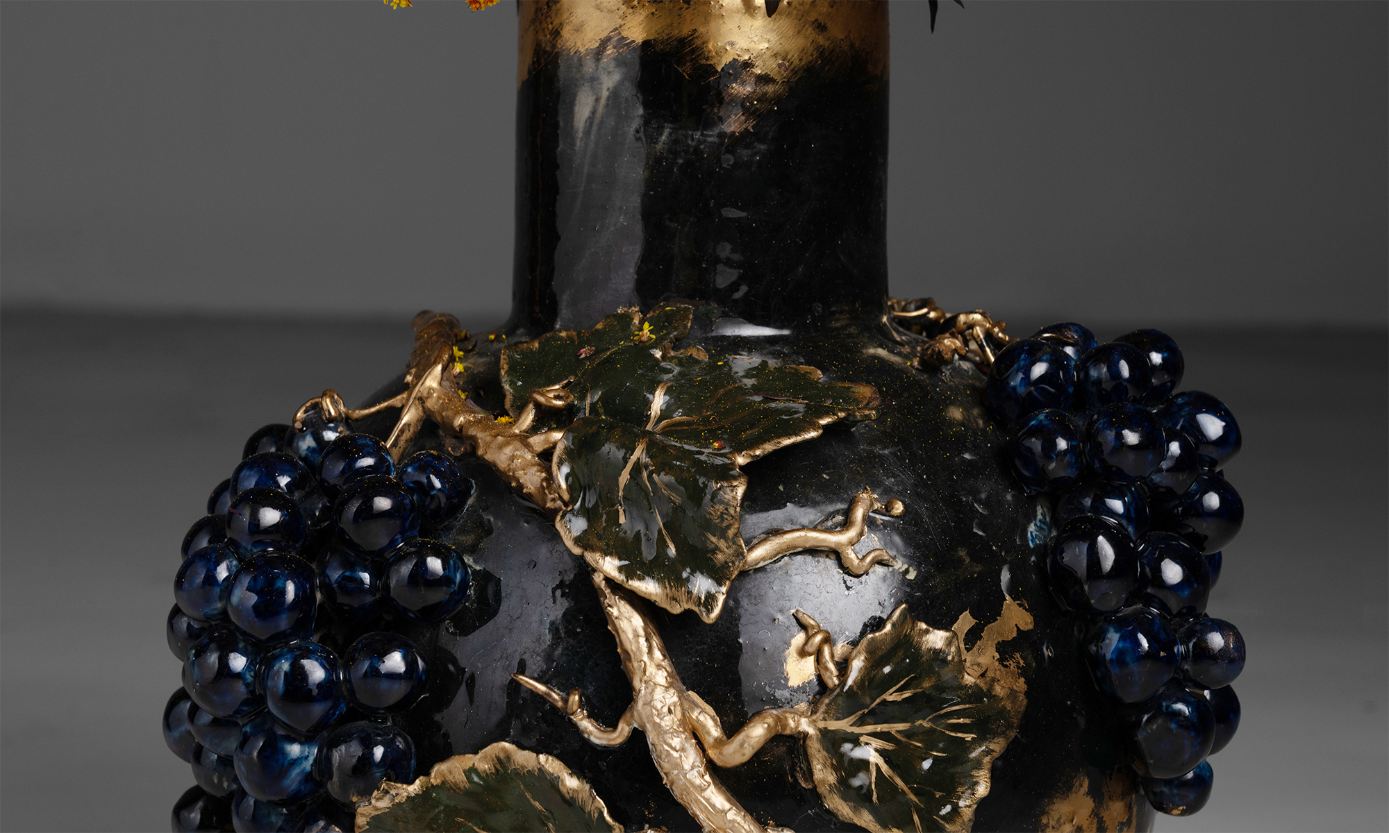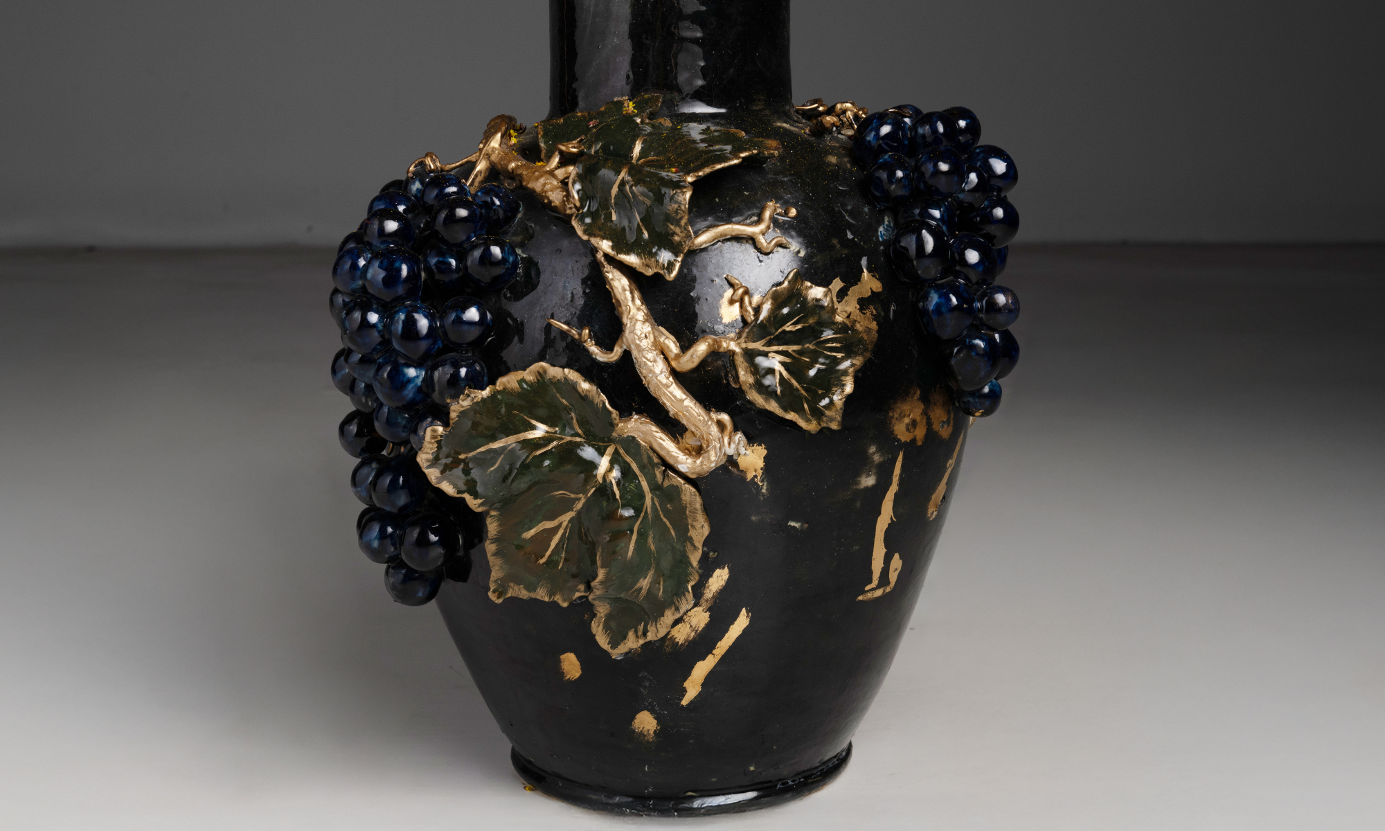 Intricate thrown vase with handmade details of grapes and leaves on surface. Multi colored glaze. Signed "Baldwell" on base.
