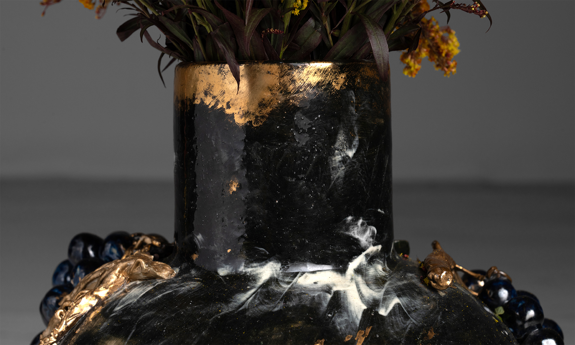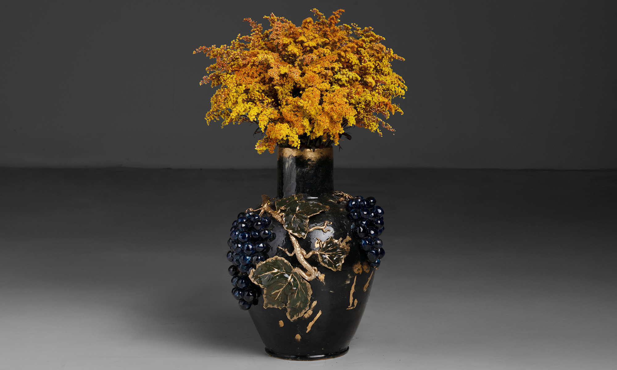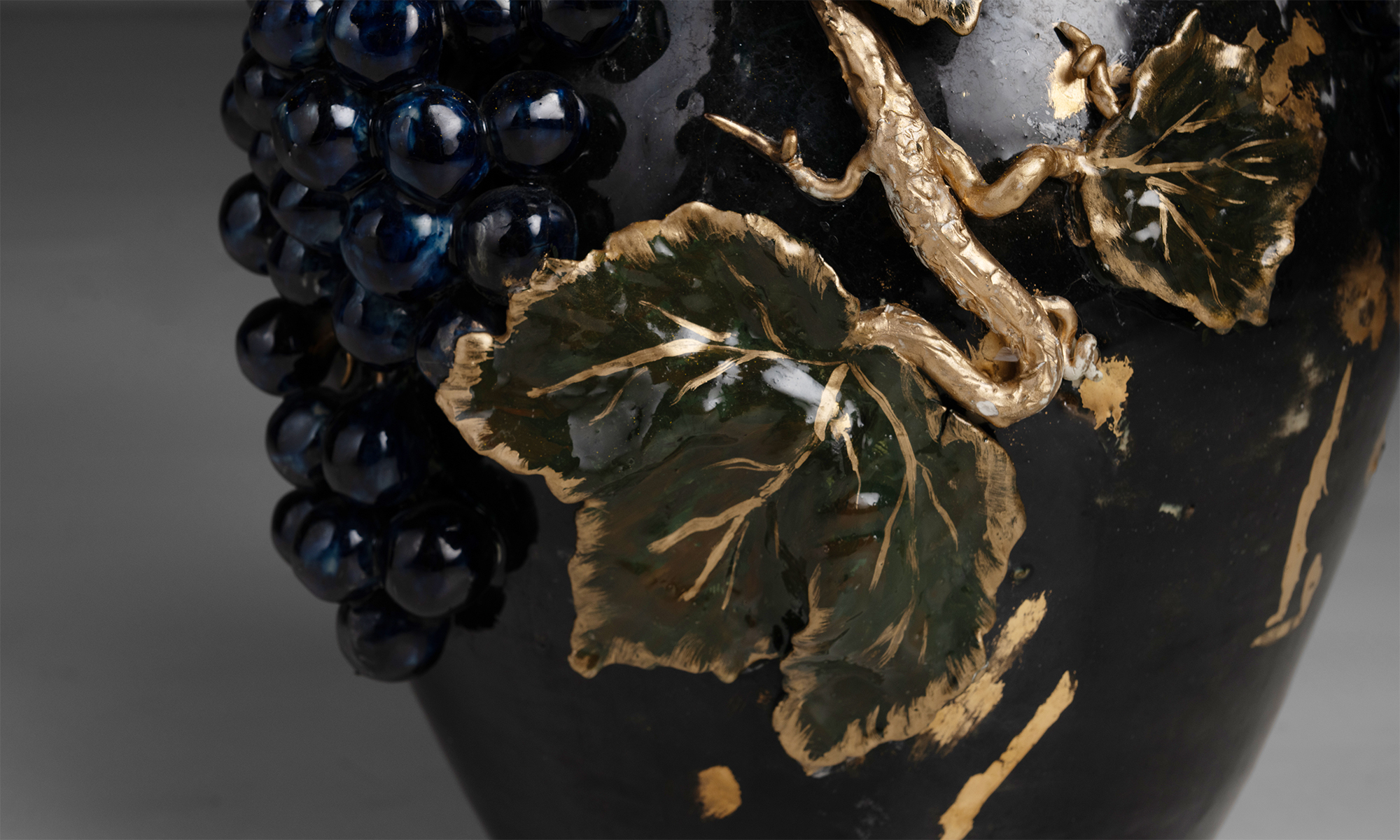 Intricate thrown vase with handmade details of grapes and leaves on surface. Multi colored glaze. Signed "Baldwell" on base.