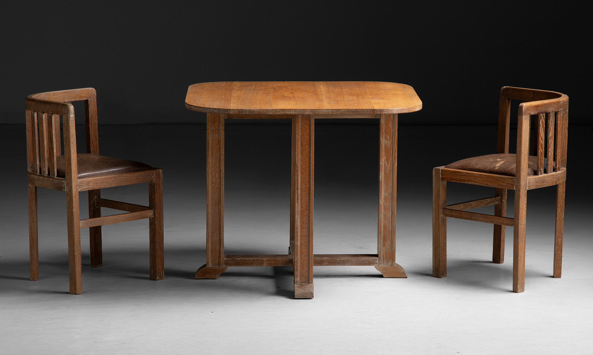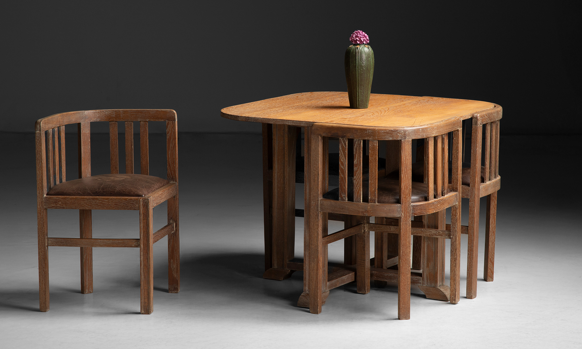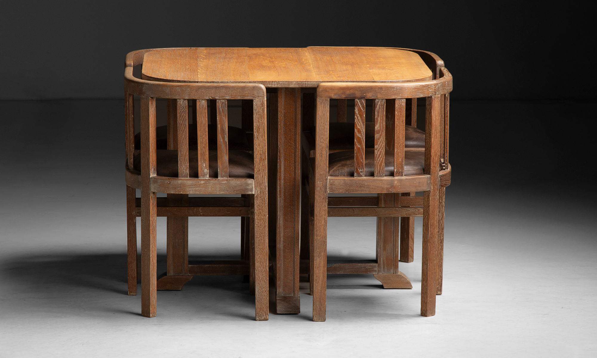 Slatted oak garden table and dining chairs with leather seats by Heal's of London.