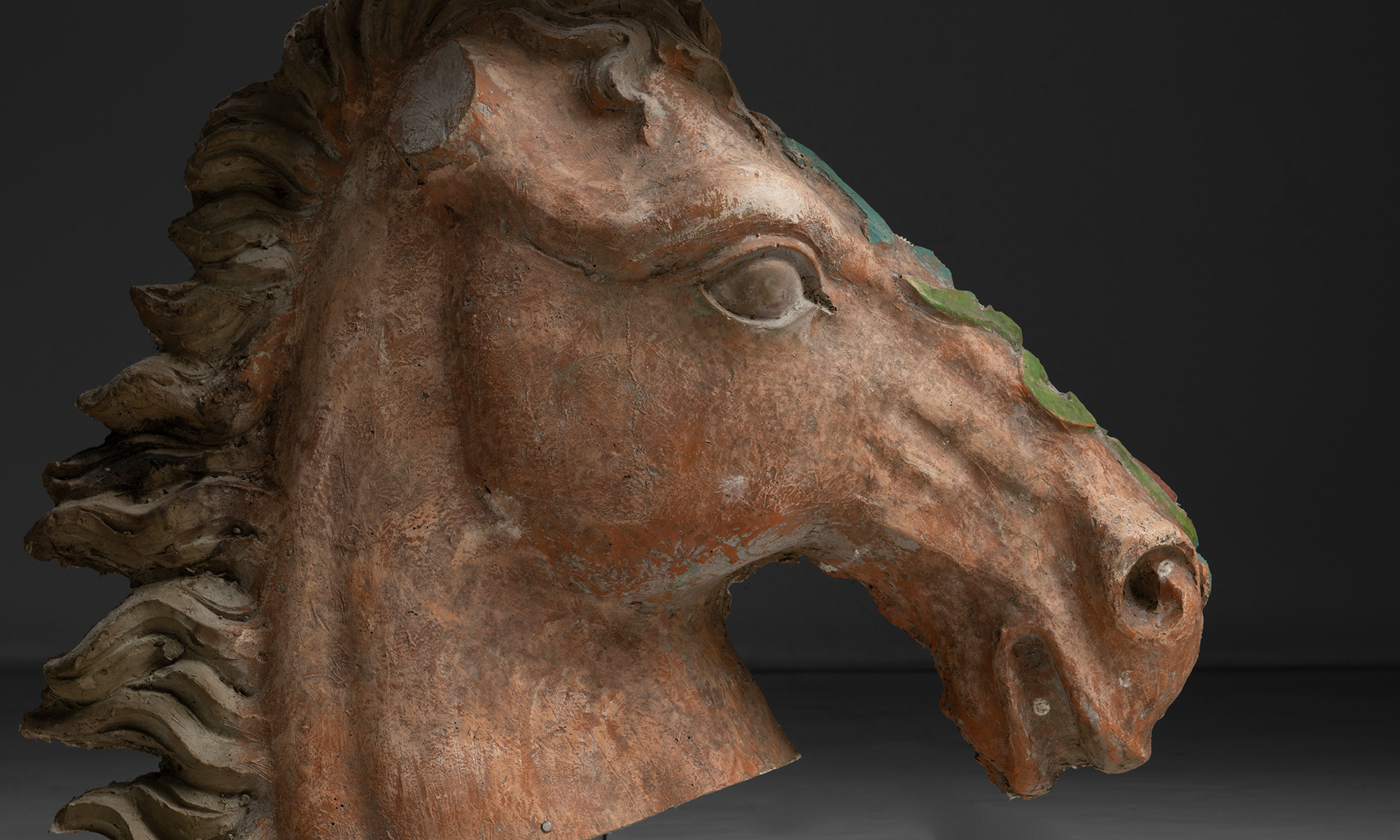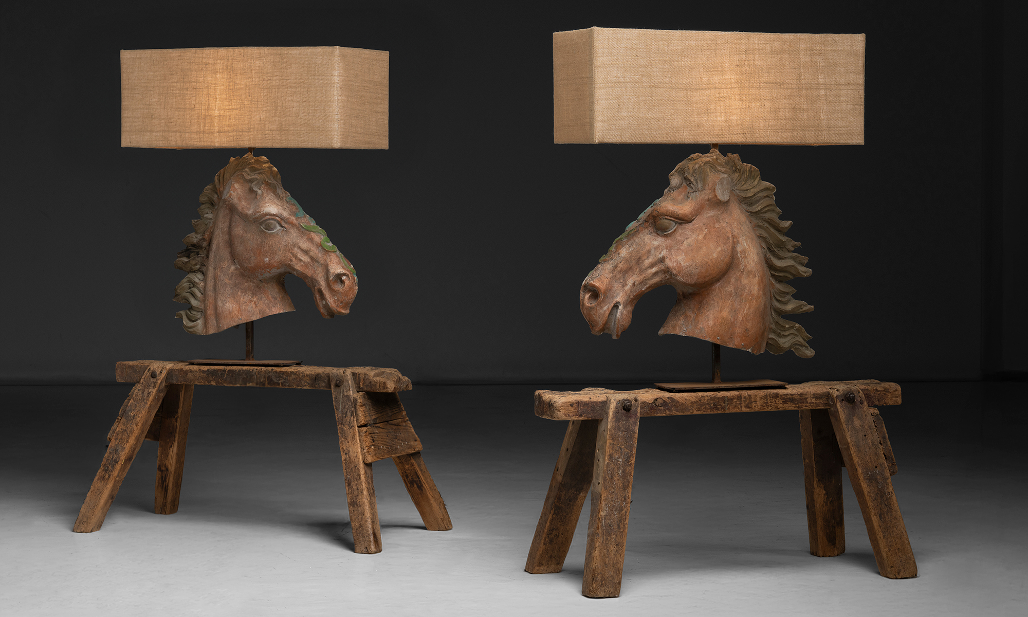 Painted fiber glass horse head lamps with newly made linen shades. Primitive trestle benches made of pine, each unique and stamped with maker's mark.