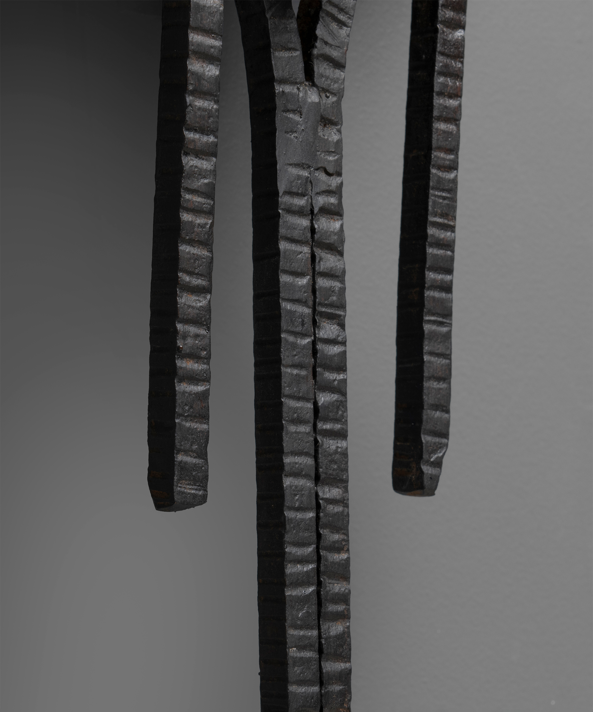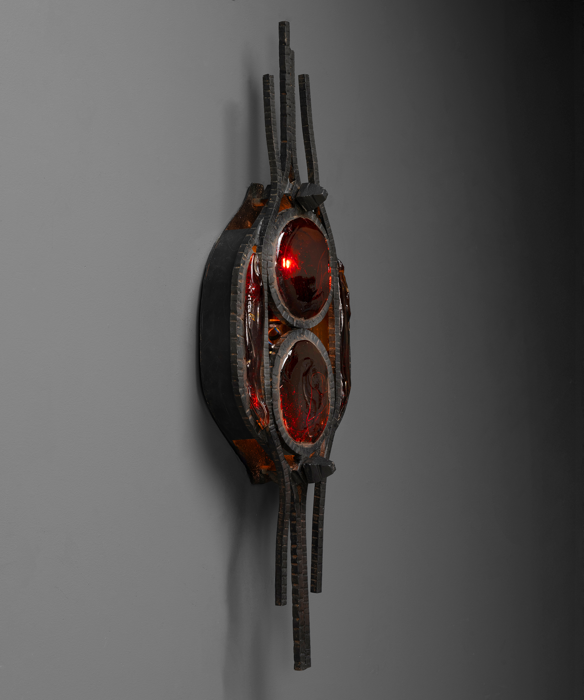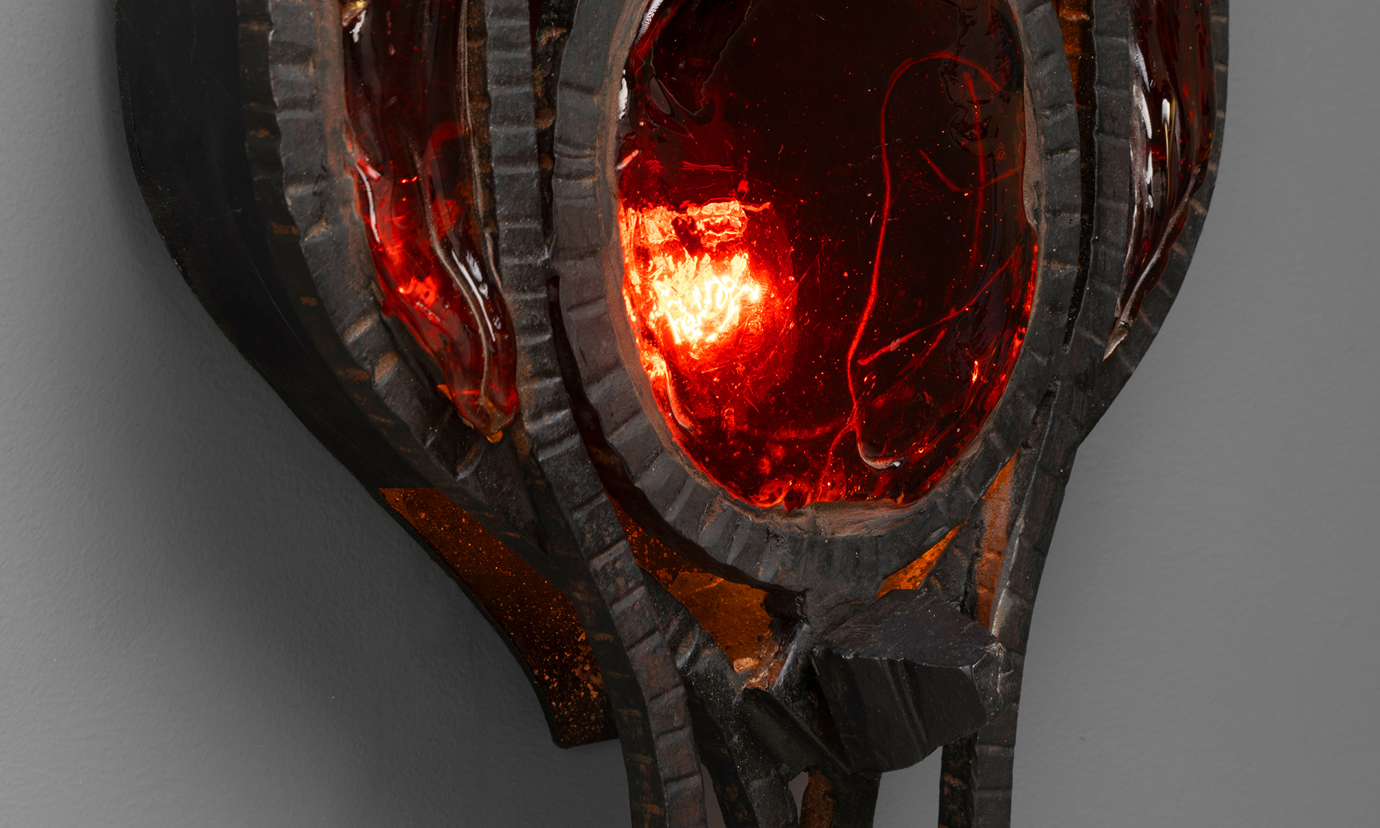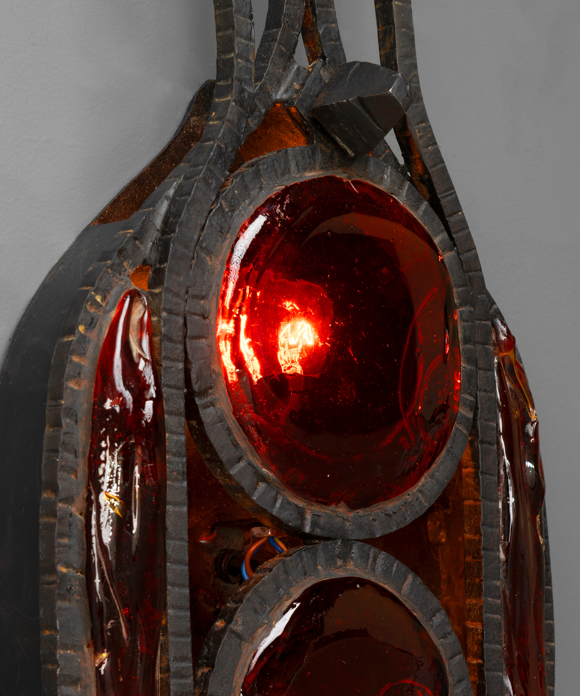 Brutalist iron sconces with red glass shades.