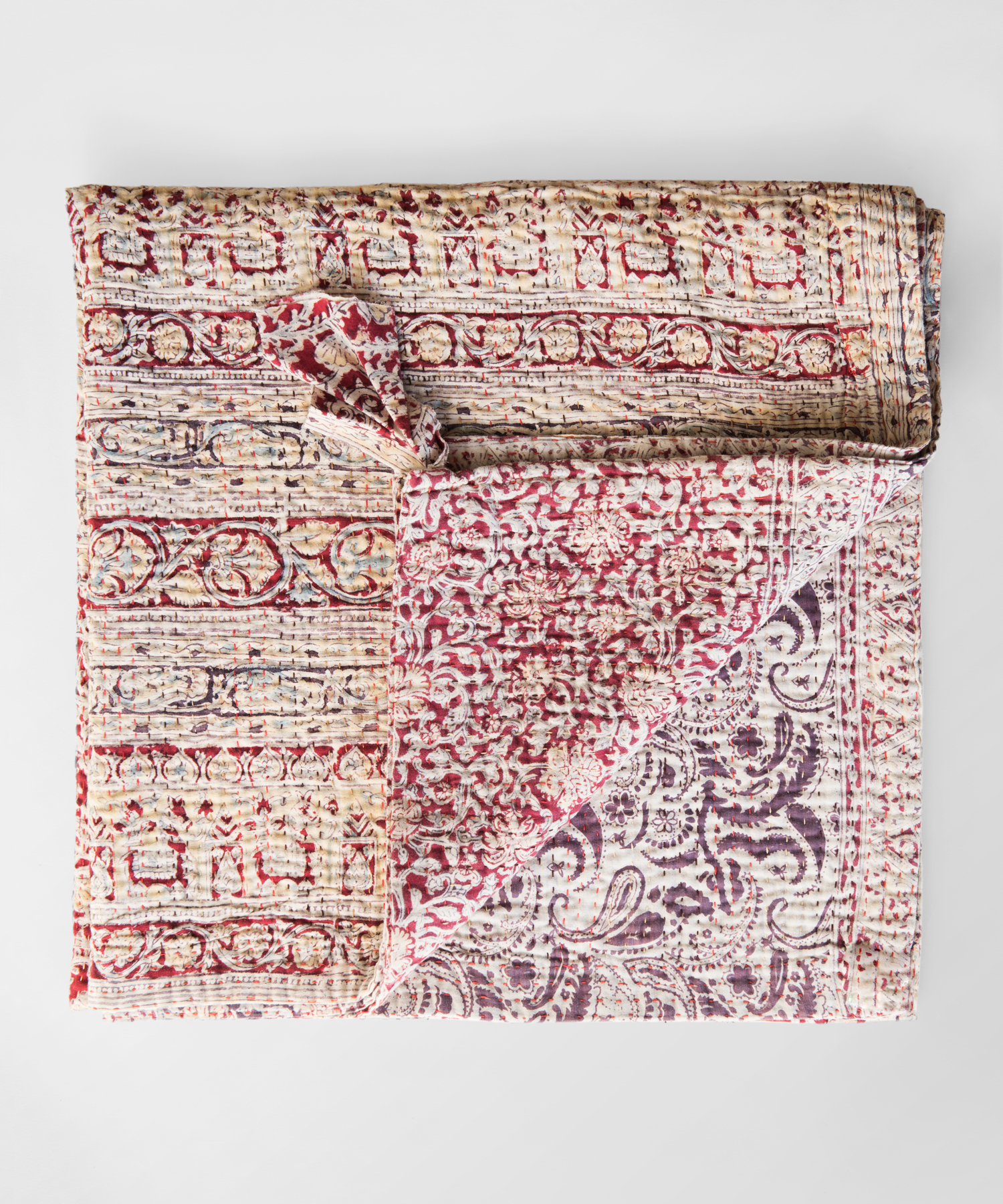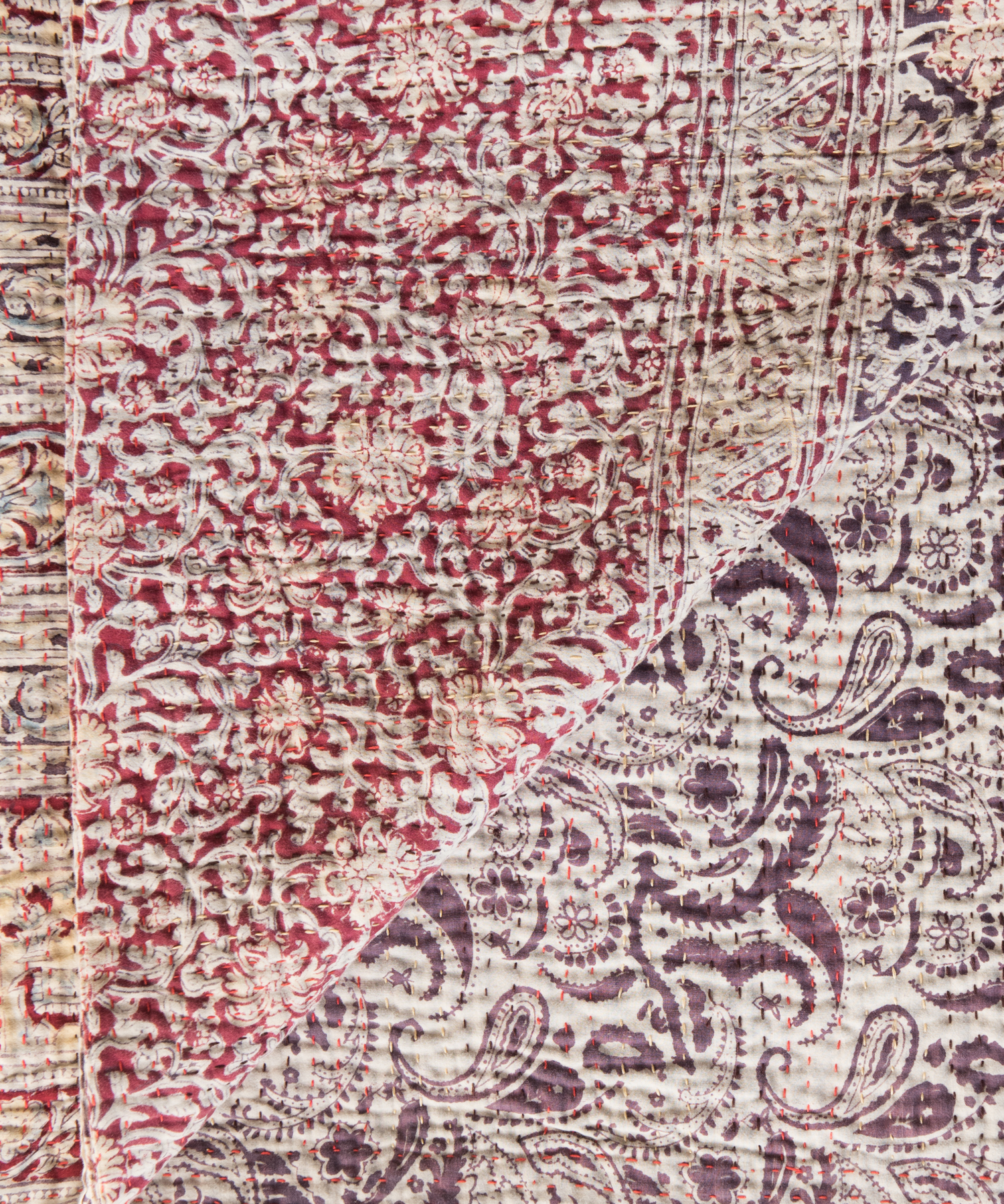 Kantha quilt made from a patchwork of layers of cotton sari joined by a simple running stitch that produces a rippled effect. Each piece is unique.