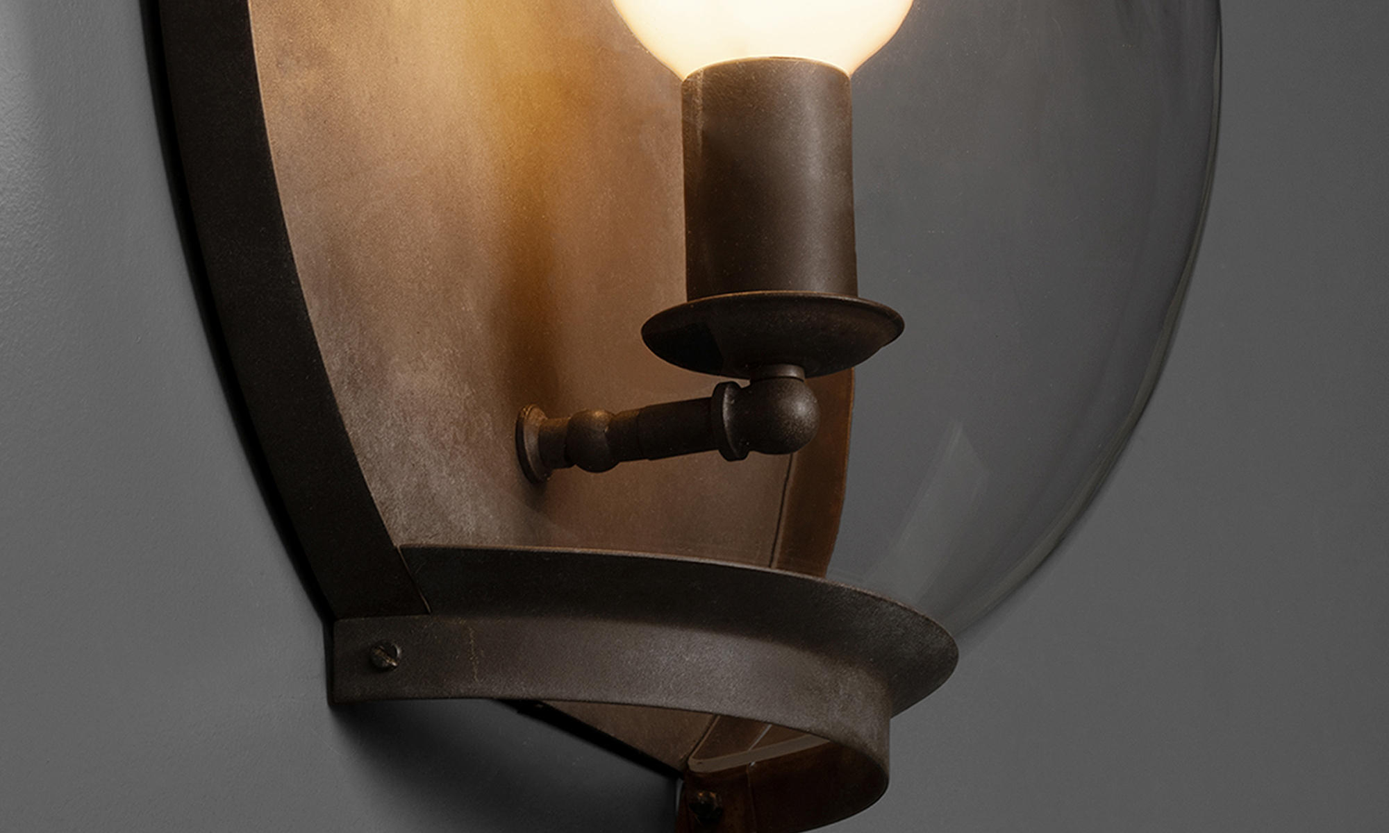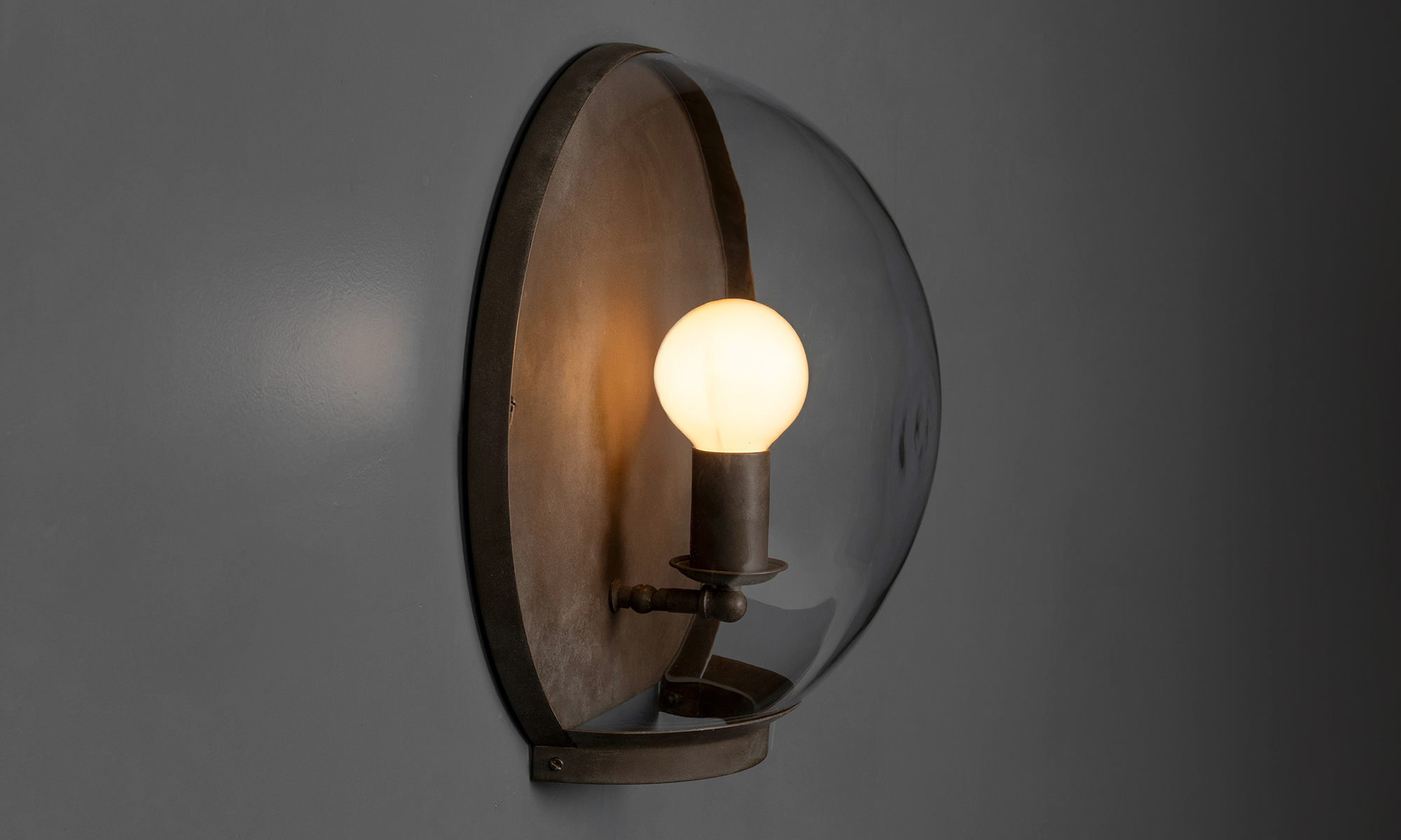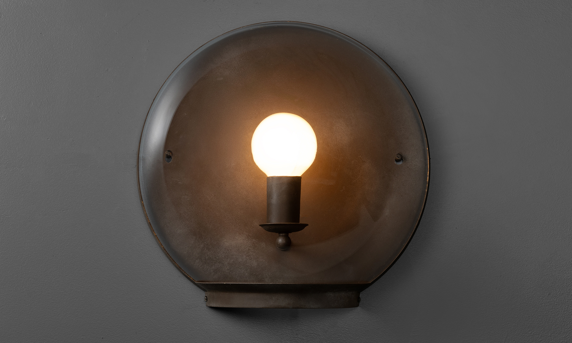 Brass sconce in ‘chocolate’ finish. Not UL Listed. 8-12 week production lead time. Please inquire for details on “Outdoor” version.