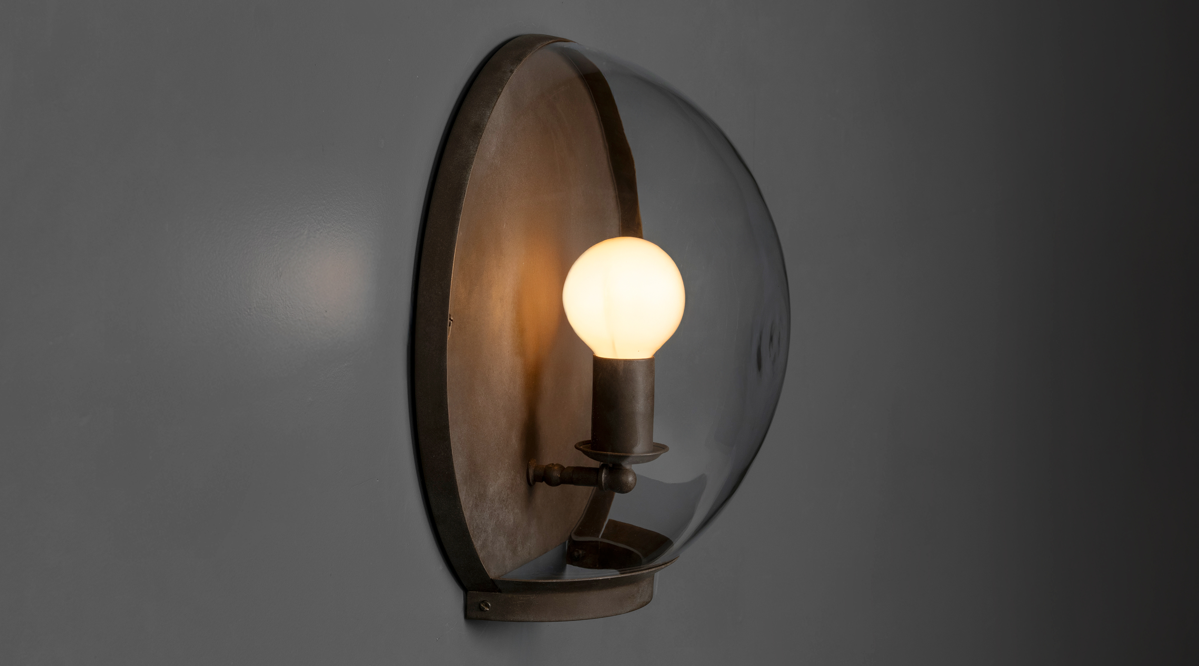 Brass sconce in ‘chocolate’ finish. Not UL Listed. 8-12 week production lead time. Please inquire for details on “Outdoor” version.