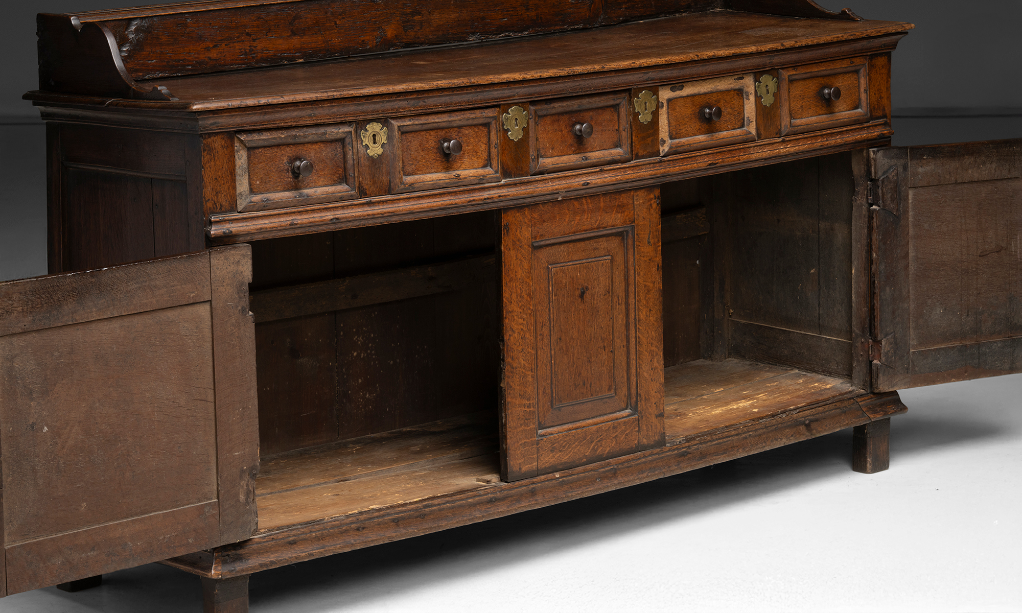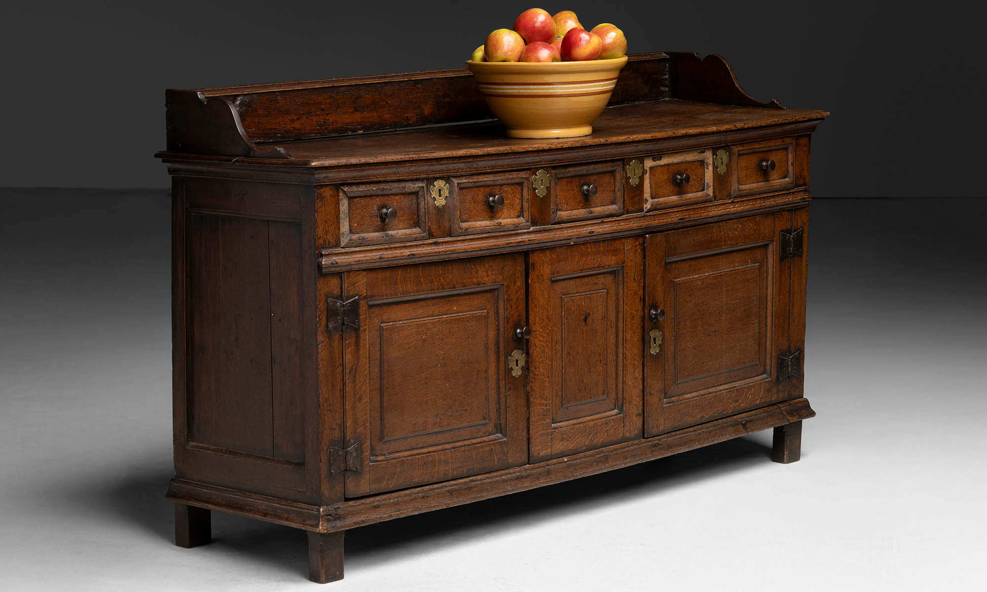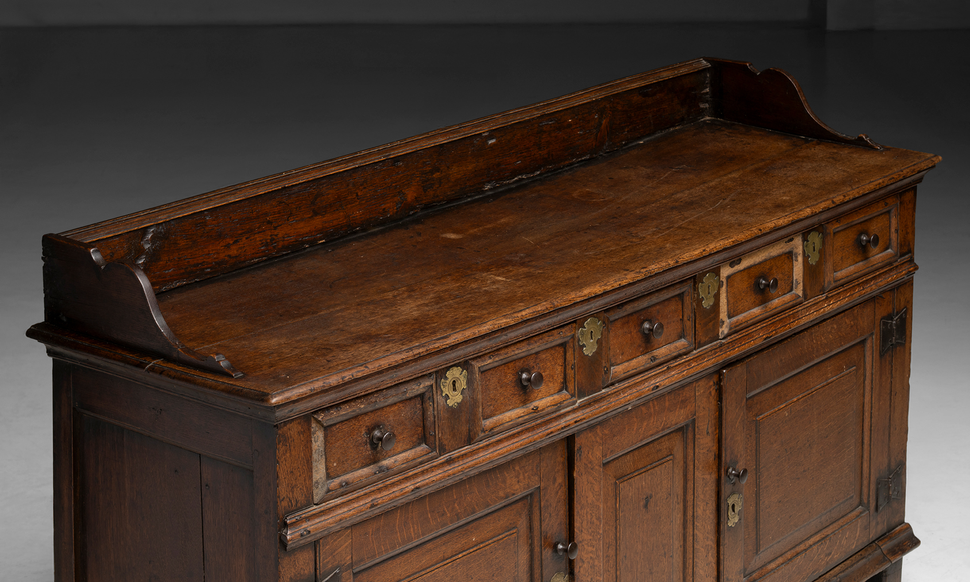 Oak sideboard with a gallery back, three drawers, and two paneled lower doors. Brass keyholes and wooded knobs.