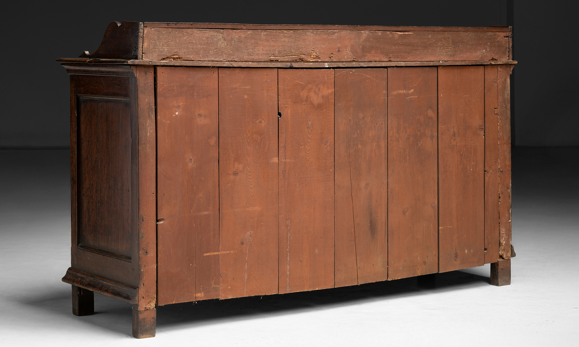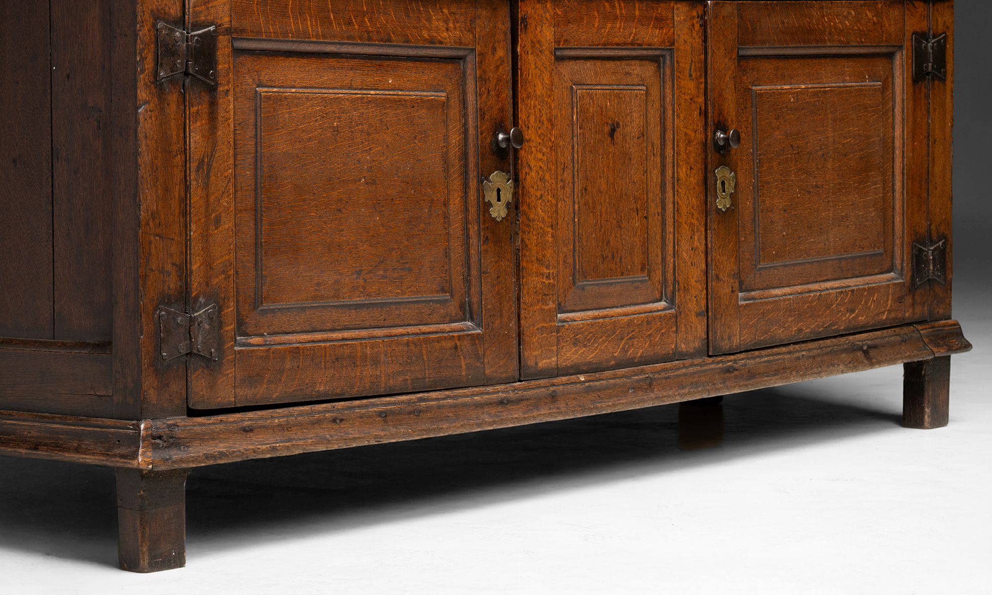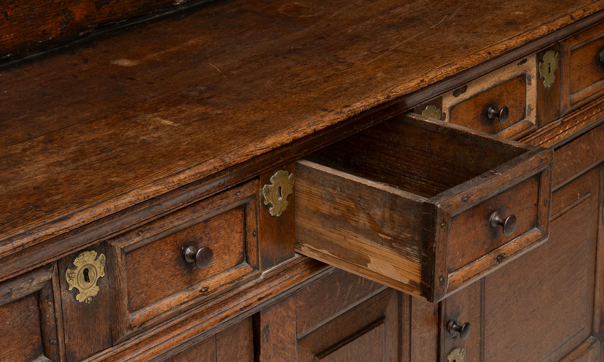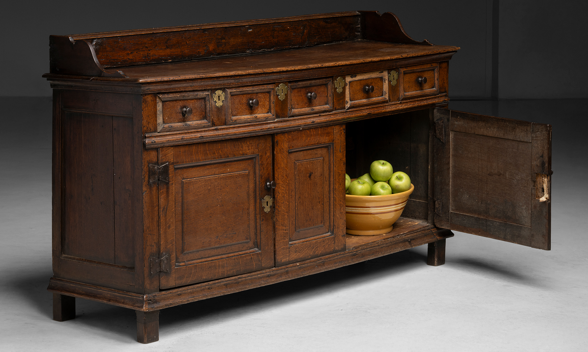 Oak sideboard with a gallery back, three drawers, and two paneled lower doors. Brass keyholes and wooded knobs.