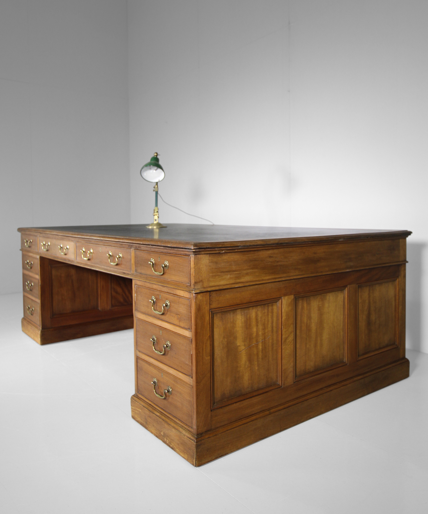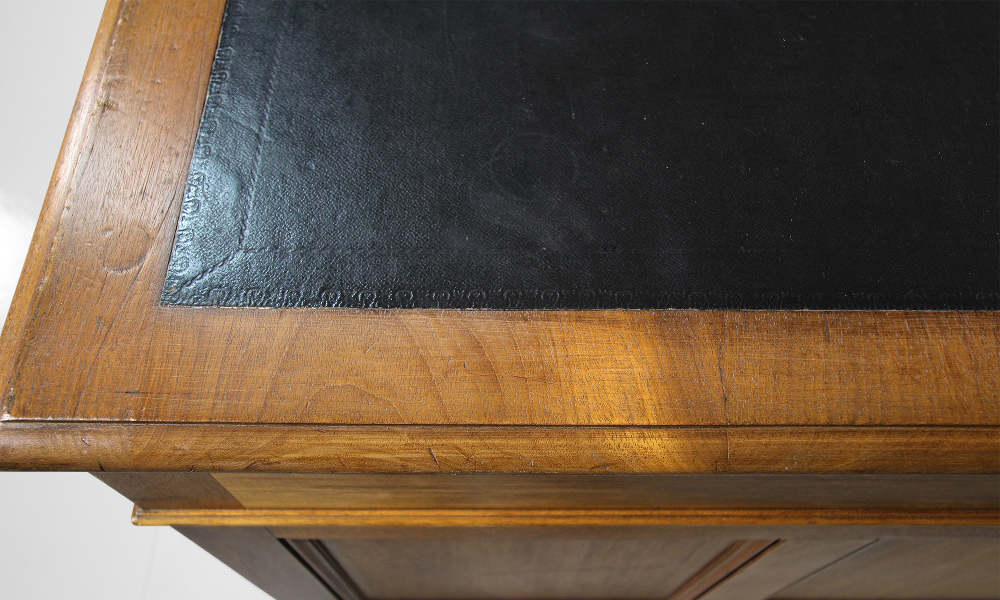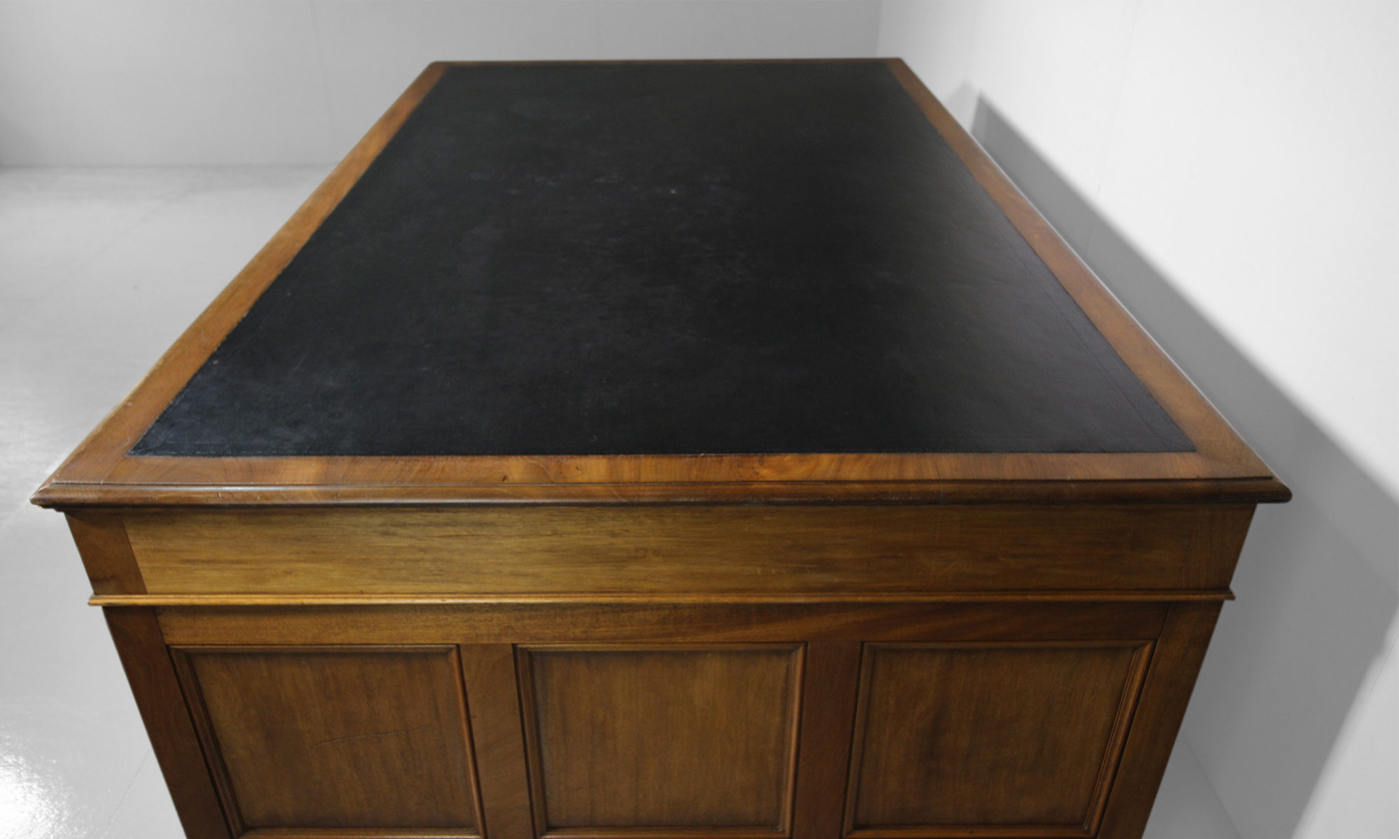 Constructed completely in mahogany, with twenty drawers and original brass hardware. Top has original black leatherette writing surface.