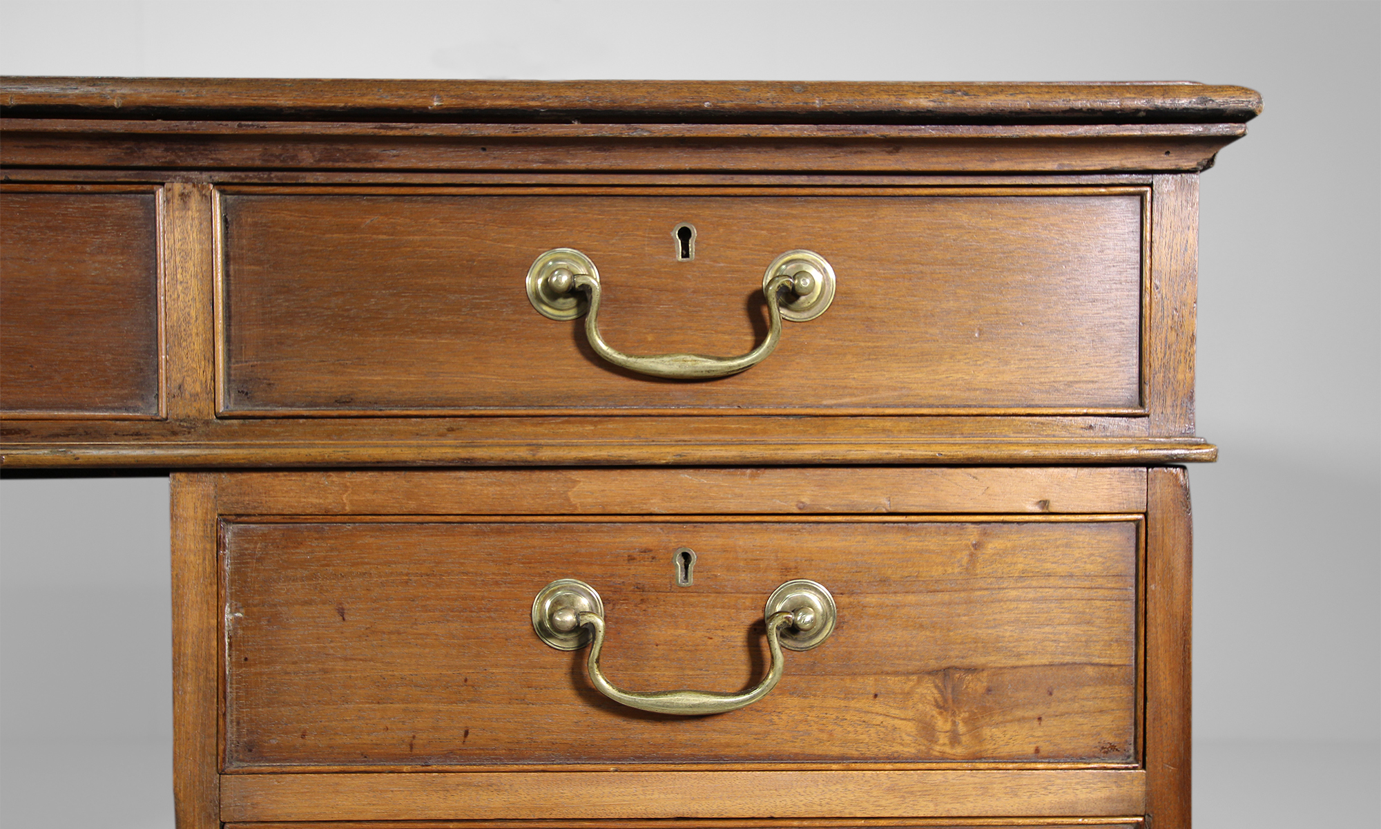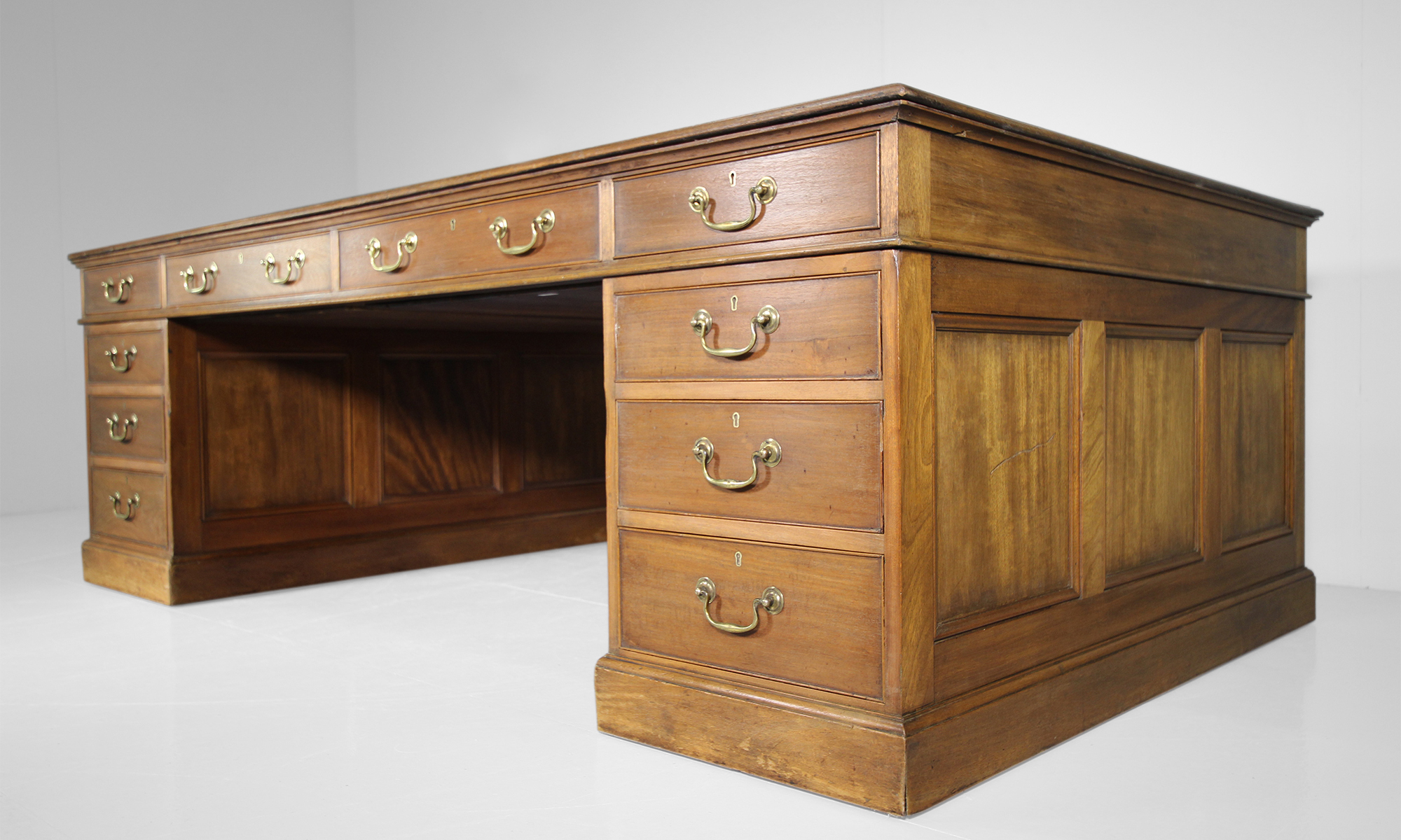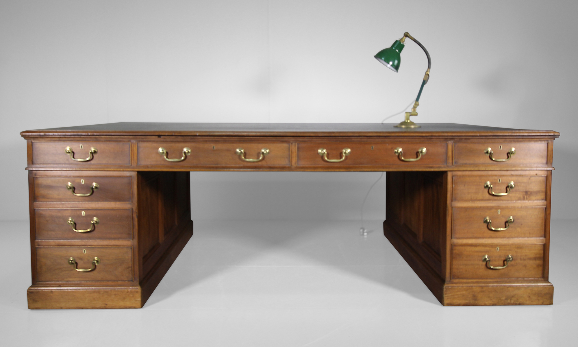 Constructed completely in mahogany, with twenty drawers and original brass hardware. Top has original black leatherette writing surface.