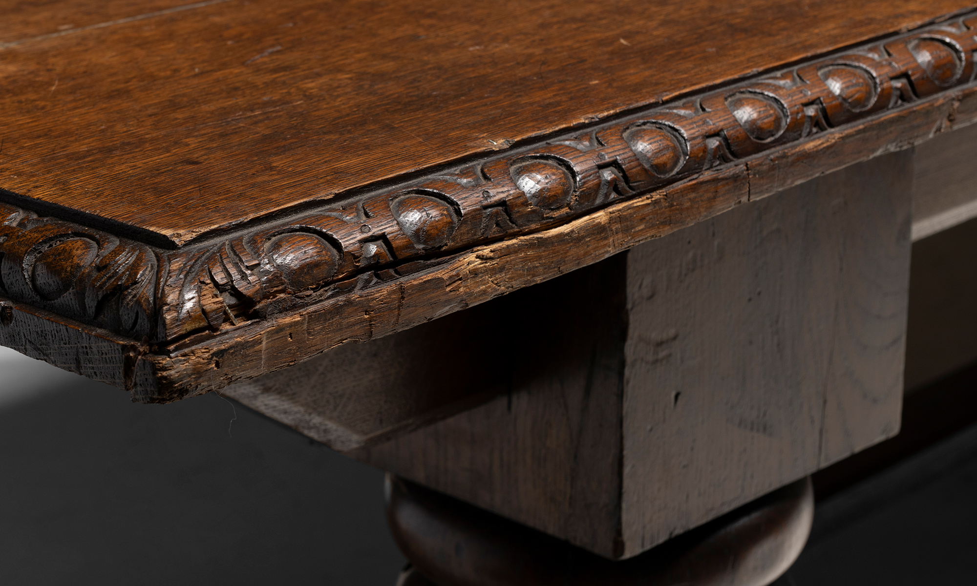 Long rectangular top with carved edge detailing, supported by bold baluster-turned legs and stretcher base.